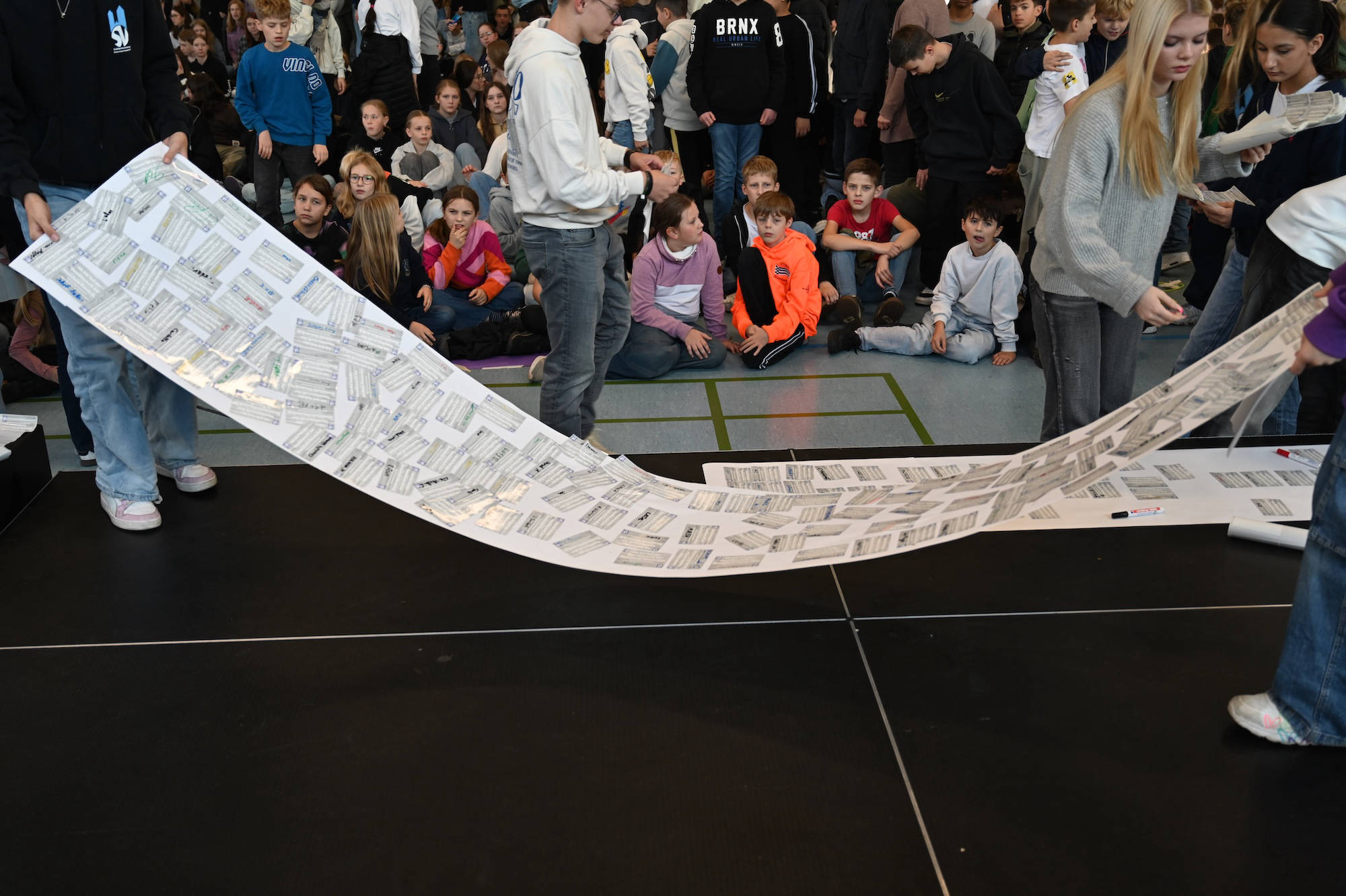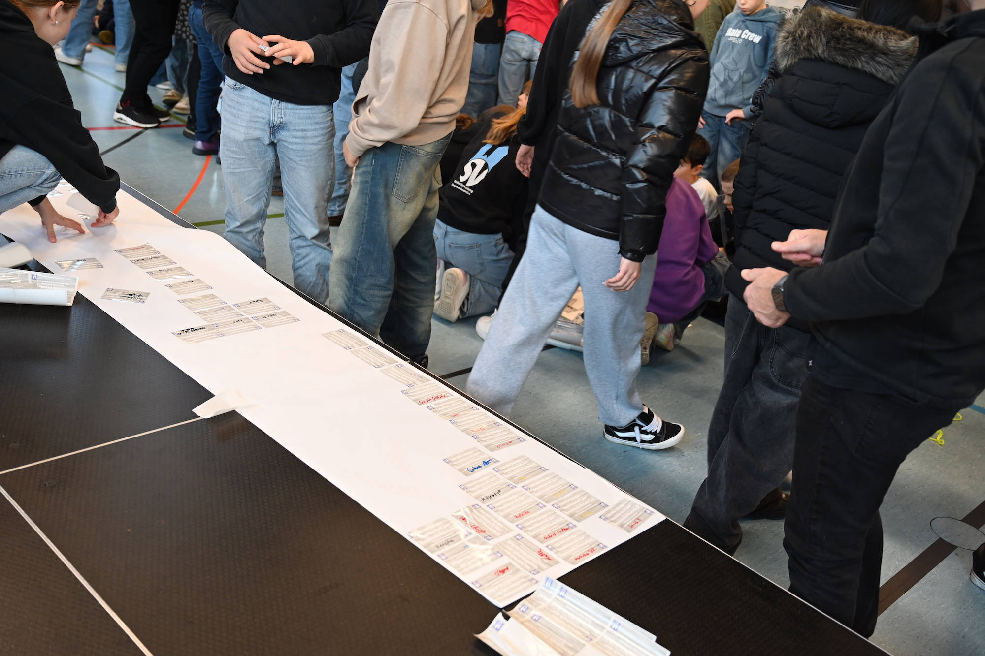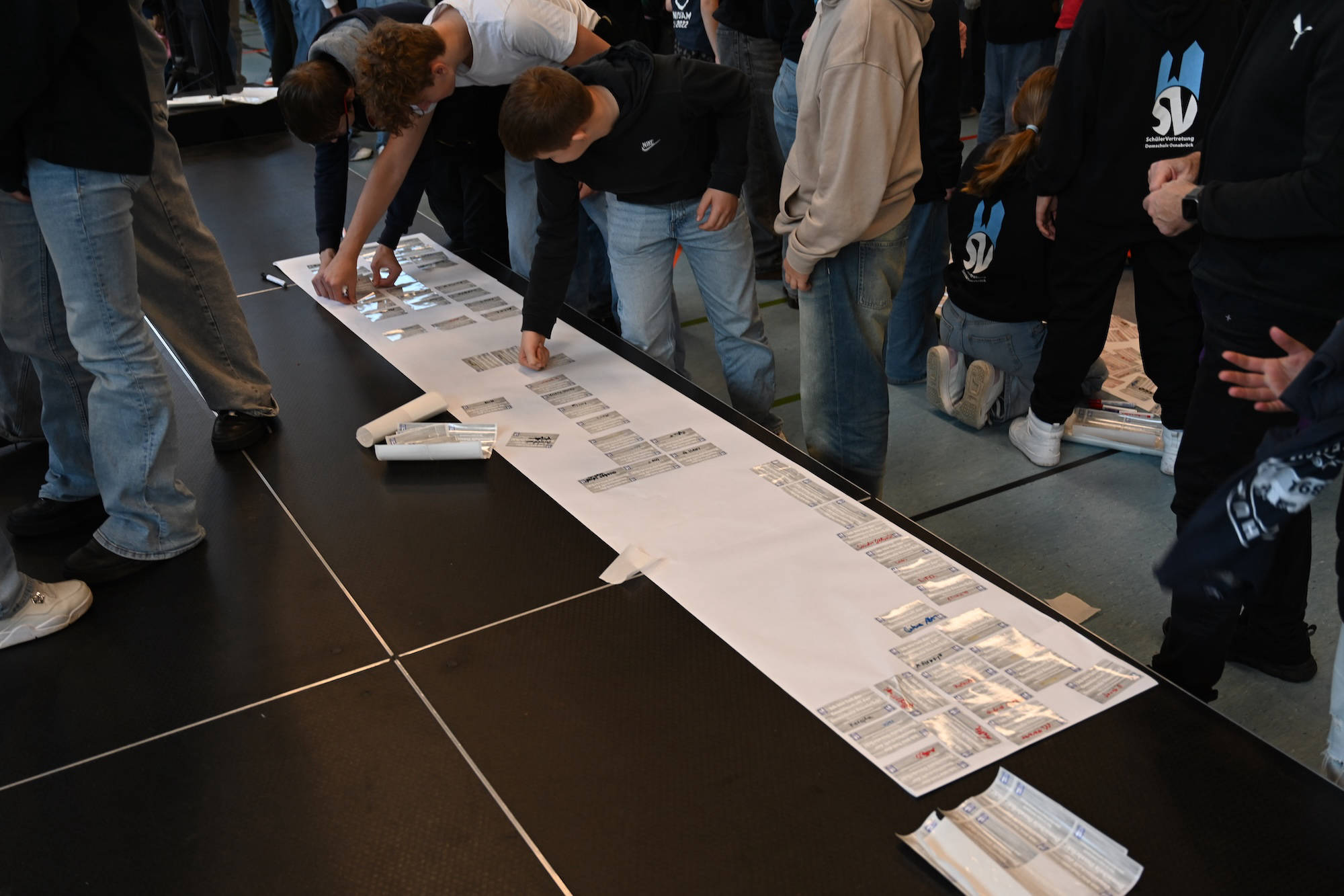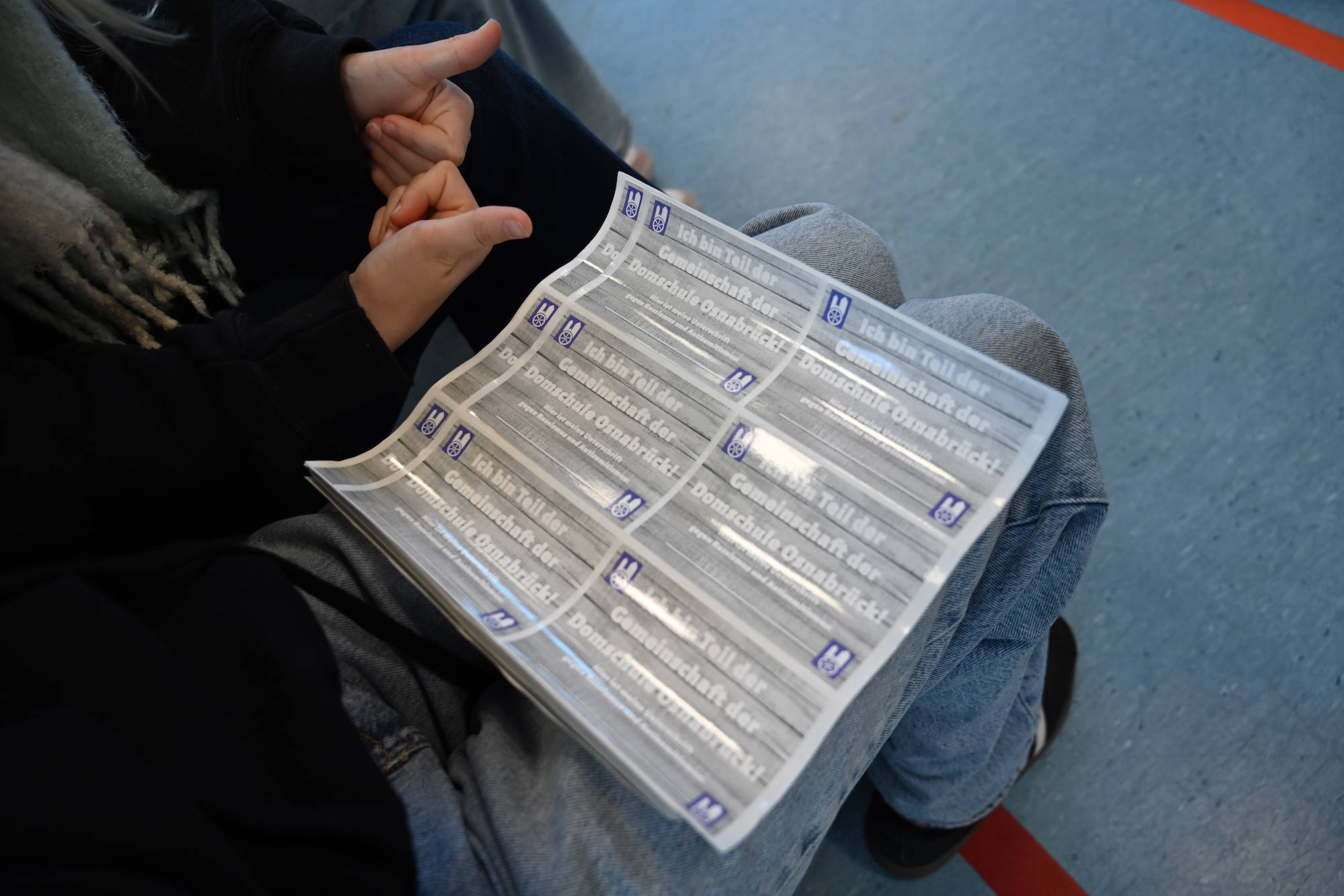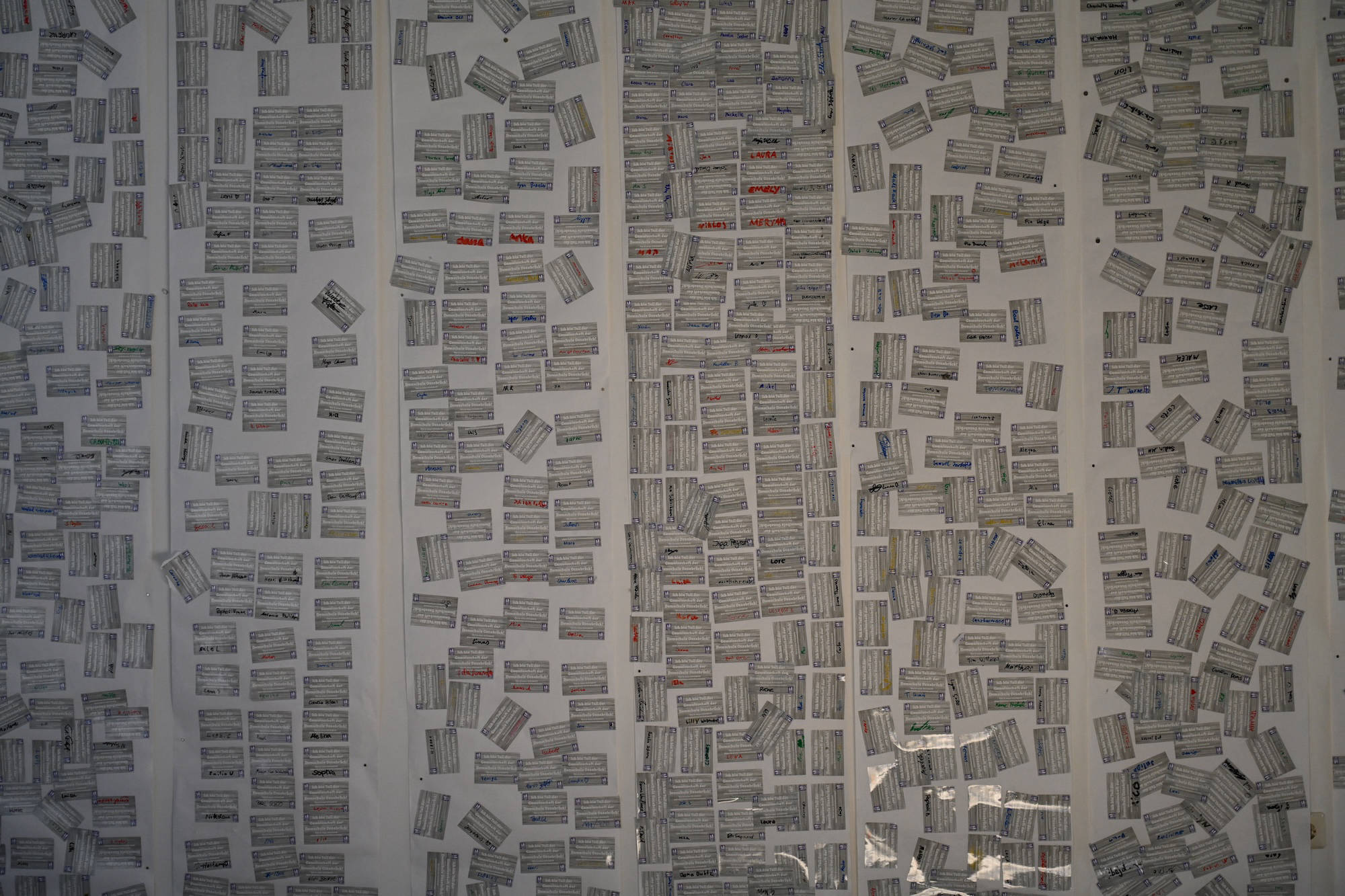 Während ihr unterschreibt, spielen wir Musik und hoffen auf einen reibungslosen Ablauf. Keine Sorge, wir haben genug Aufkleber. Schön wäre, wenn ihr sie nicht übereinander klebt und bitte NUR auf das vorbereitete Plakat. Im Anschluss hängen wir diese Plakate alle zusammen in den Flur am roten Sofa. DANKE euch für eure Unterstützung! Jetzt geht es los.“