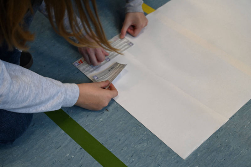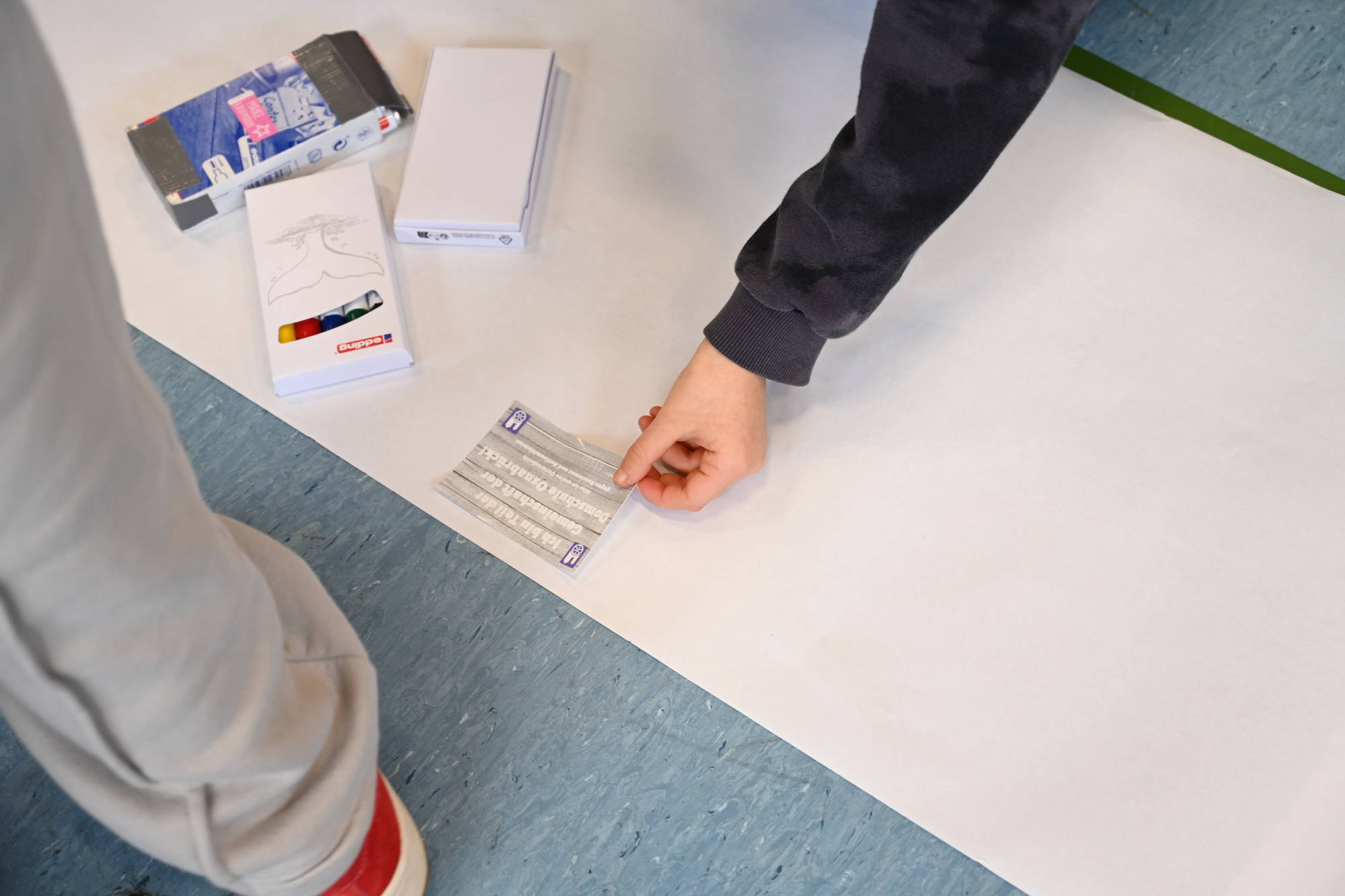 Wenn ihr uns dabei unterstützen wollt, würden wir uns freuen, wenn ihr das mit eurer Unterschrift festhalten würdet. Wir haben für jeden von euch einen Aufkleber, den ihr unterschreiben dürft und dann auf das Plakat vor euch kleben sollt.