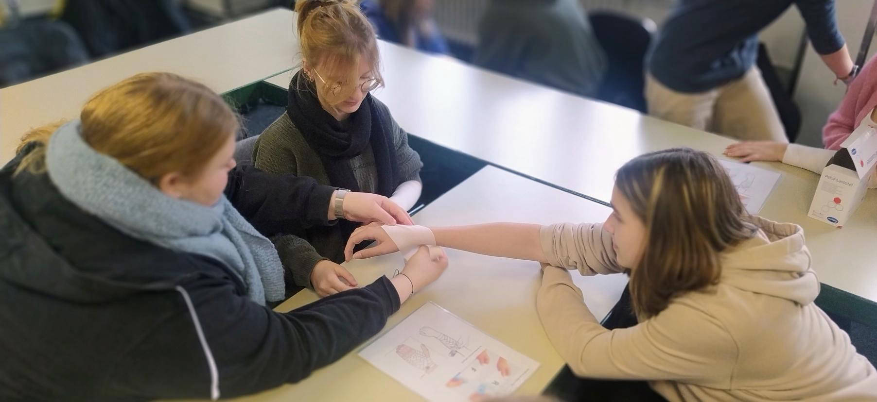 Im Anschluss daran startete der praktische Teil des Besuchs. In kleinen Gruppen hatten die Schülerinnen die Möglichkeit, verschiedene Verbandstechniken zu erlernen und das Anziehen steriler OP-Kleidung zu üben. Diese praxisnahe Erfahrung vermittelte nicht nur wertvolle Kenntnisse, sondern auch einen Einblick in die wichtigen Aufgaben, die im Gesundheitswesen zu bewältigen sind.