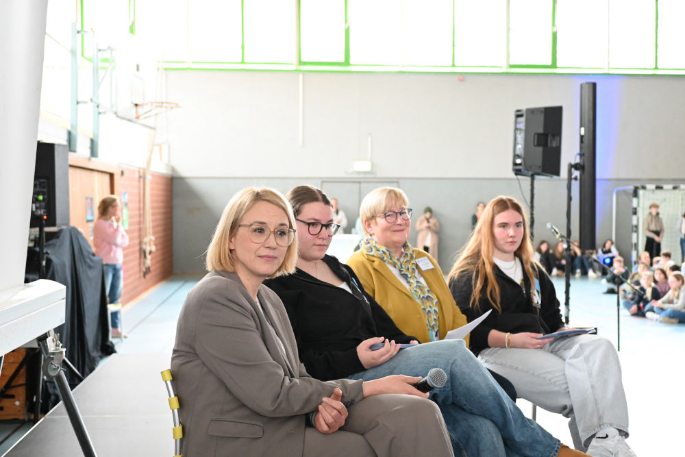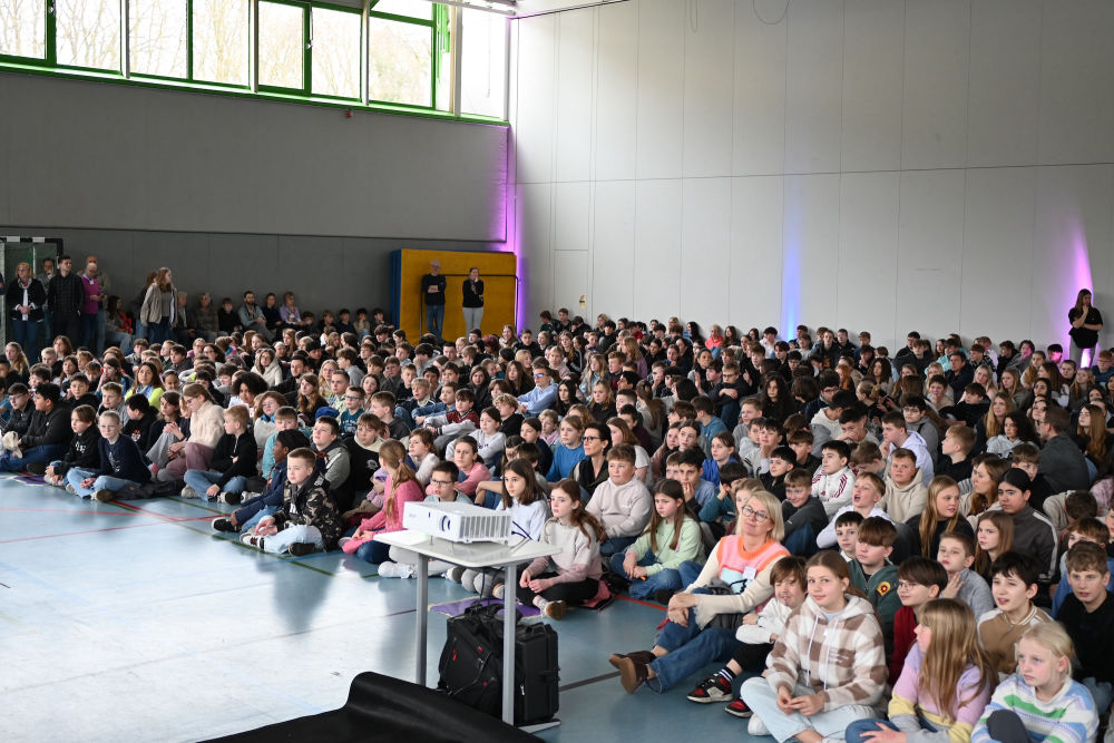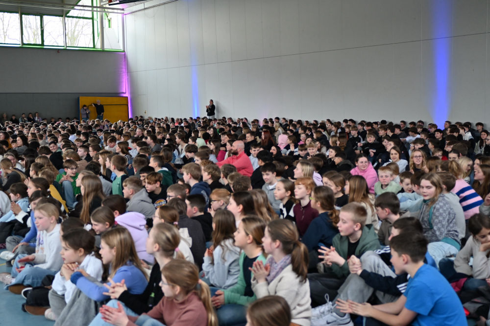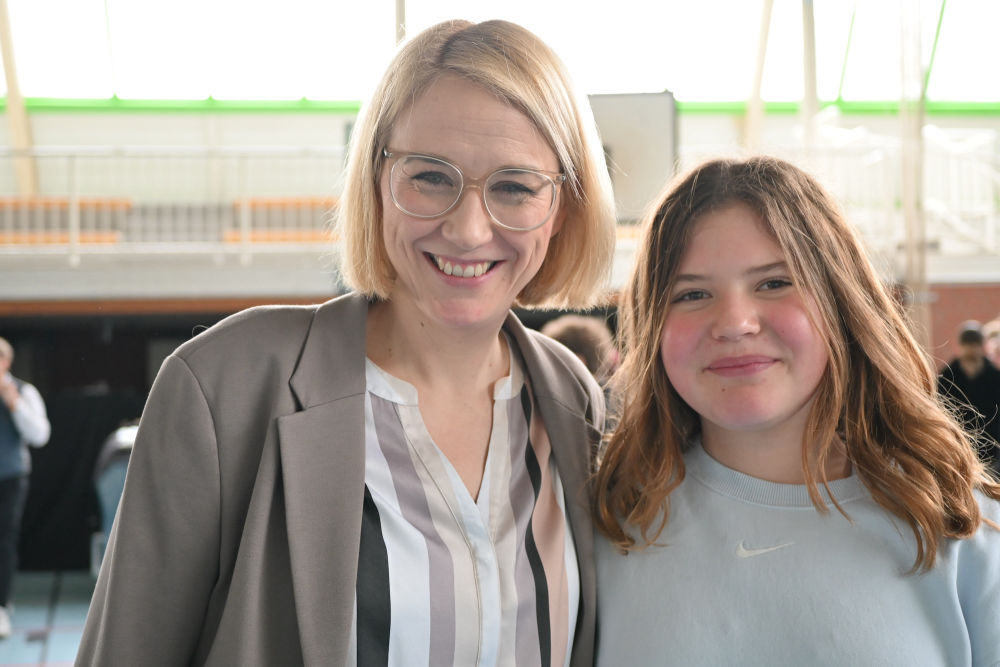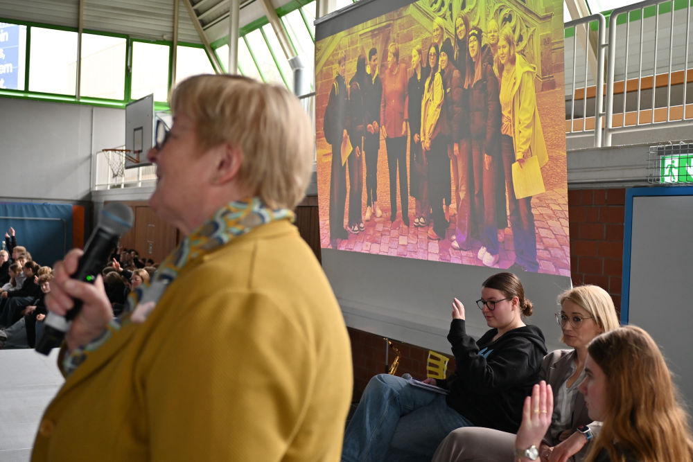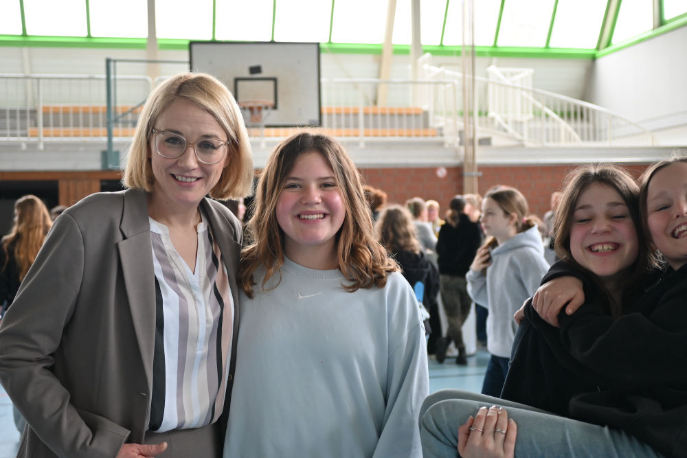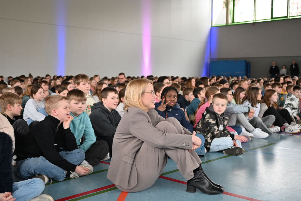 Am 11. März war Oberbürgermeisterin Katharina Pötter zu Besuch in der Domschule. Nach einem Rundgang durch die Gebäude und einem Gespräch mit Schülerinnen, Schülern, Kolleginnen und Kollegen sowie der Schulleitung stellte sie sich den Fragen der Schülerschaft in der Vollversammlung in der Turnhalle.