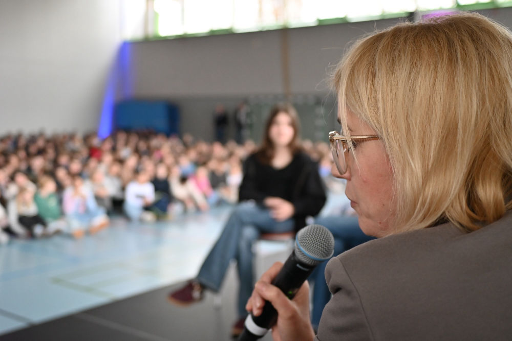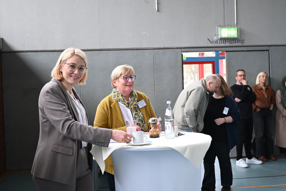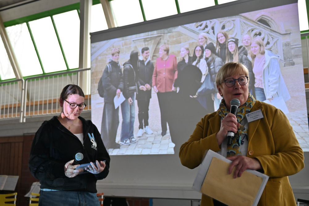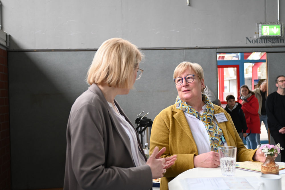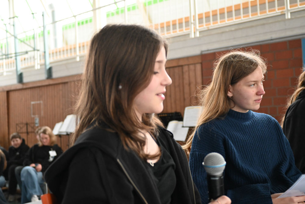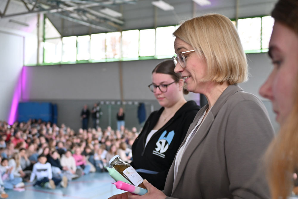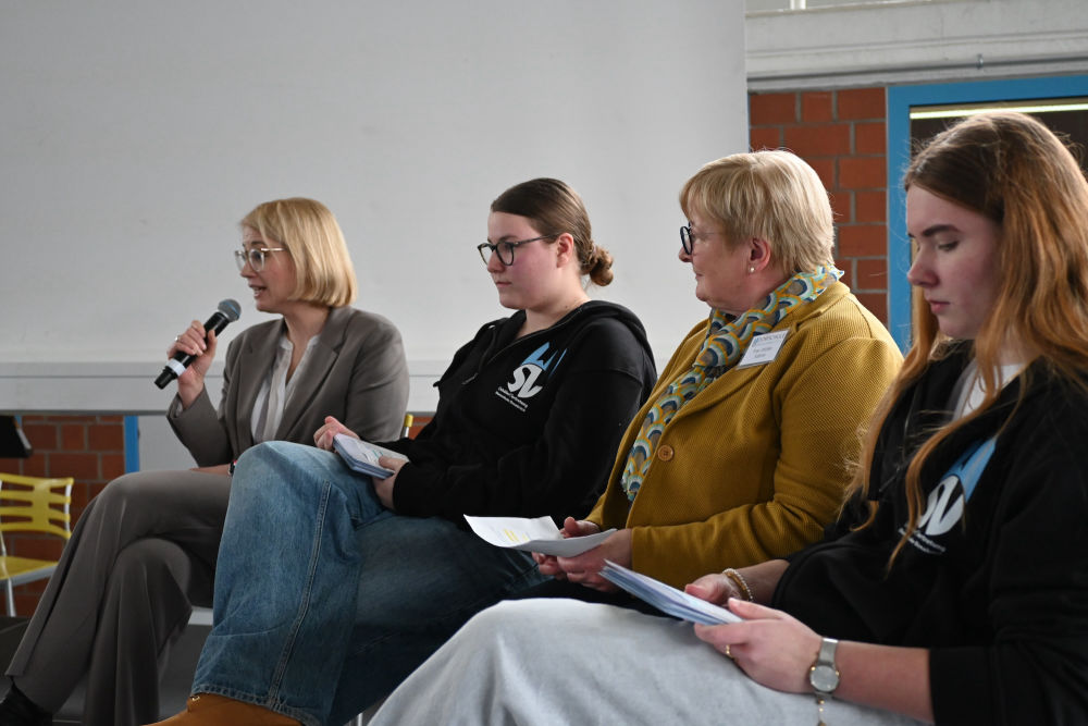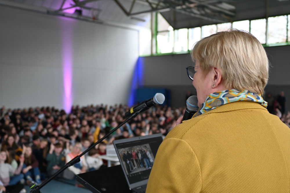 Am 11. März war Oberbürgermeisterin Katharina Pötter zu Besuch in der Domschule. Nach einem Rundgang durch die Gebäude und einem Gespräch mit Schülerinnen, Schülern, Kolleginnen und Kollegen sowie der Schulleitung stellte sie sich den Fragen der Schülerschaft in der Vollversammlung in der Turnhalle.