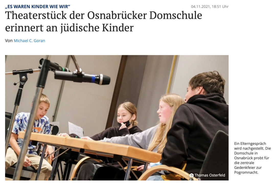 Auch in diesem Jahr wird in Osnabrück mit einer Gedenkveranstaltung an die in der Nacht vom 9. auf den 10. November 1938 durch die Nationalsozialisten initiierten antijüdischen Pogrome erinnert. Dieses Mal in Form eines Theaterstücks.