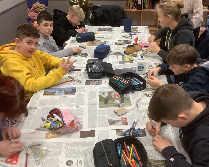 Einige Schulklassen des Jahrgangs 9 im Schuljahr 2019/2020 haben sich innerhalb eines Kunstprojektes mit verschiedenen nachhaltigen Themen auseinandergesetzt und ihre Inspirationen kunstvoll dargestellt. Die entstandenen Werke wurden im Schulgebäude ausgestellt.