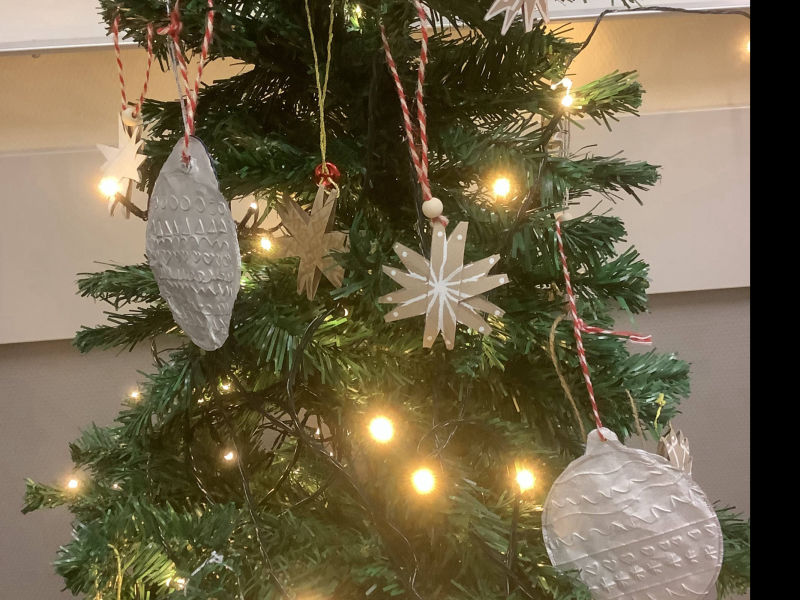Weihnachtsschmuck aus Klopapierrollen und Joghurtaludeckeln, sowie Windlichter aus alten Gläsern...