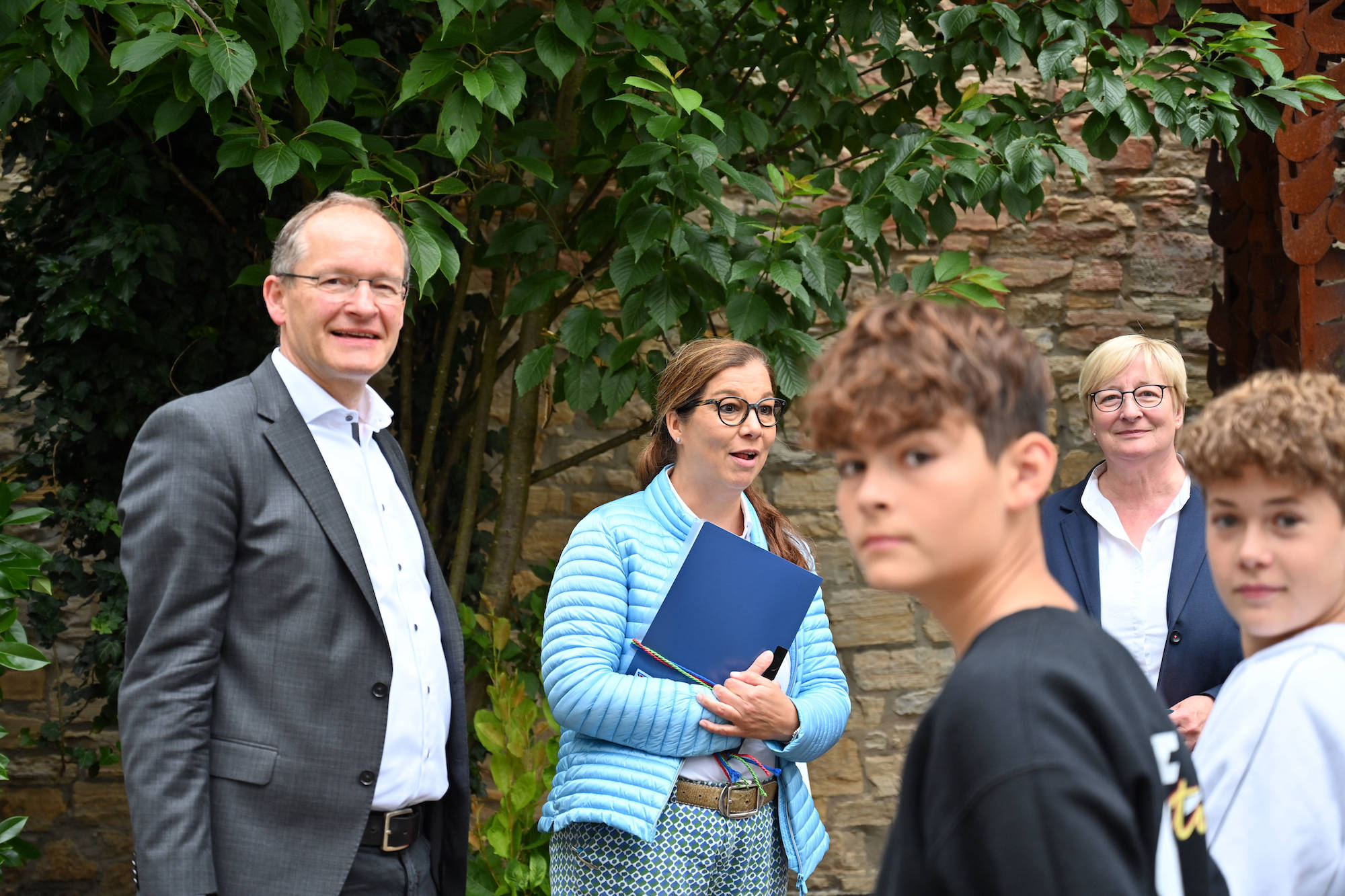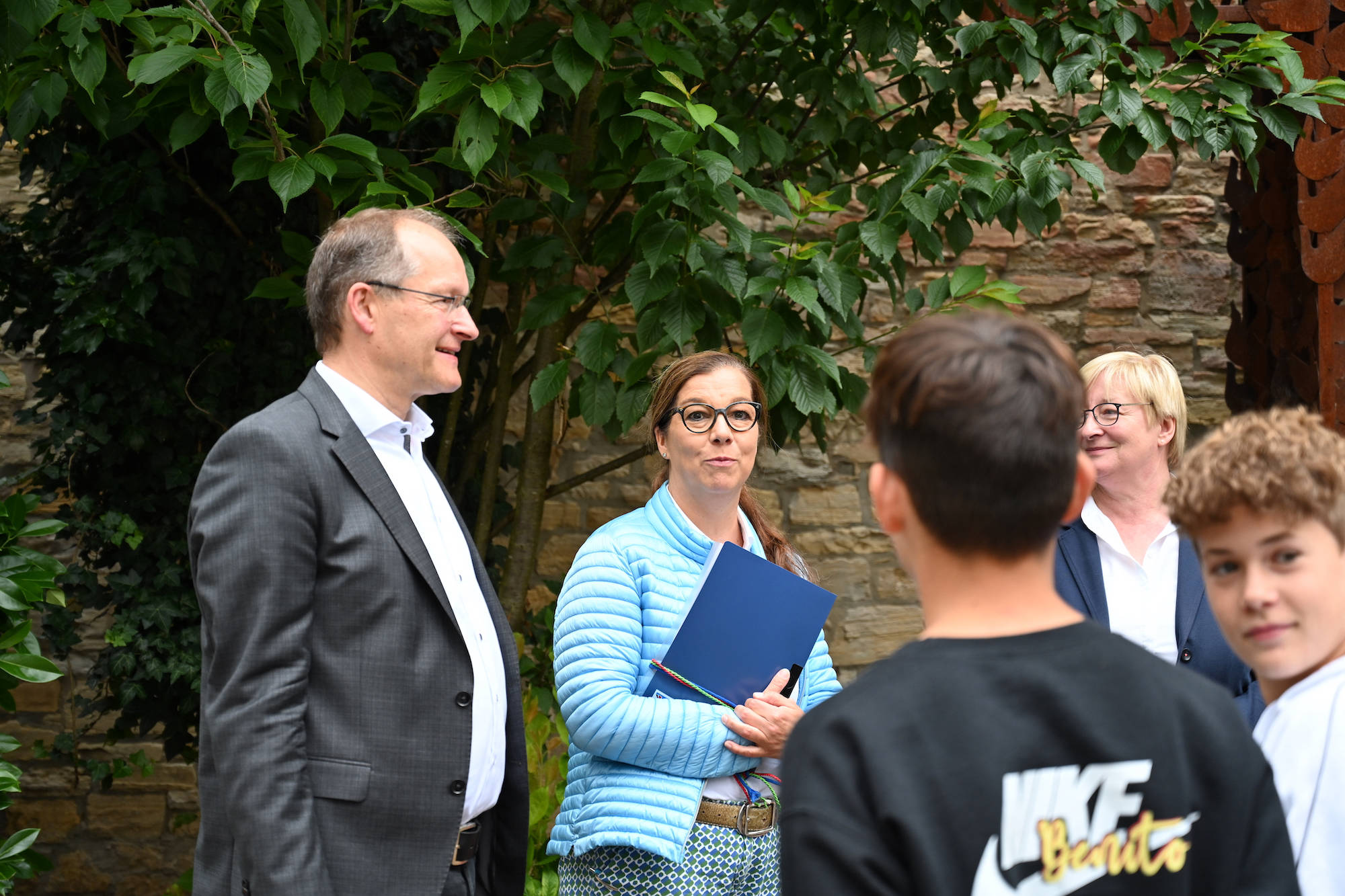 Mareike Klekamp (VKR), Ulrich Beckwermert (Domkapitular), Ludwig Berg (VKR), Sabine Müller (Schulleiterin), Ralf Menke (VKR) und die Schülerinnen und Schüler der Garten-AG der Domschule (von links nach rechts)