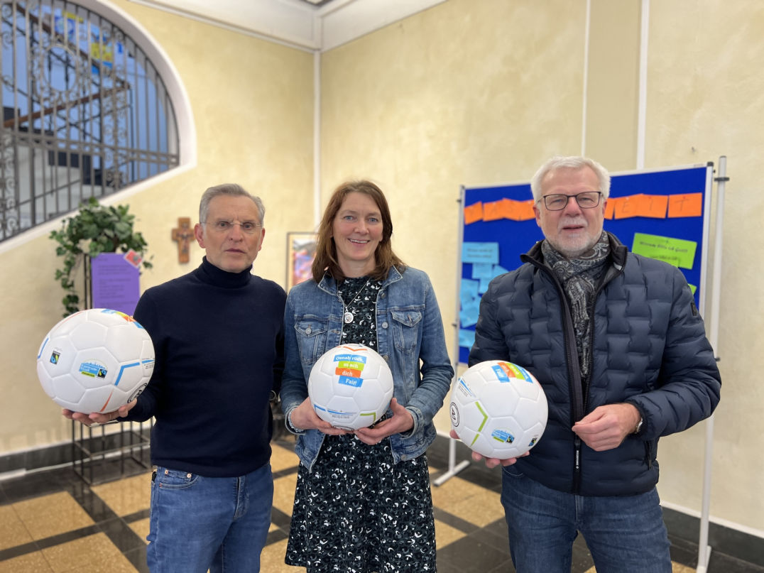 Herr Hoffmann als Vertreter der Steuerungsgruppe überreichte nun drei fair produzierte Fußbälle an die Sportfachgruppe unserer Schule. Damit wird jetzt auch im Sportunterricht bei uns ein besonderes Zeichen für das Fairplay gesetzt. Verzicht auf Kinderarbeit und Zahlung gerechter Löhne sind bei der Produktion fairer Sportbälle selbstverständlich.