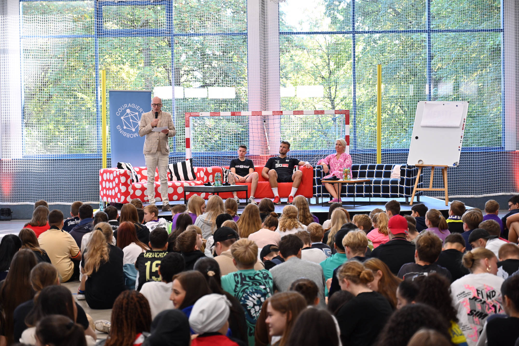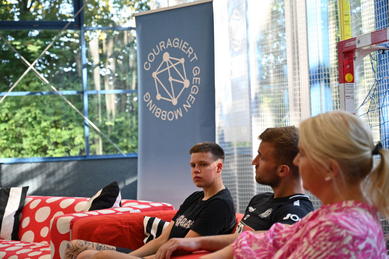 Zu der Friedensveranstaltung waren ca. 300 SuS der Möser Realschule, der Erich-Maria-Remarque-Schule, der IGS Eversburg und der Domschule. Alle Schulen sind im Netzwerk SORSMC. Die Podiumsdiskussion zum Thema „Diskriminierung und politische Einflüsse im Fußball“ war kurzweilig und im Anschluss gab es eine Autogrammstunde mit Timo Beermann, dem Kapitän des VFL. Herr Beermann hat sich sehr viel Zeit für die SuS genommen und Schals, Caps, Karten, Handys etc. signiert. Natürlich wurde auch Fotowünsche erfüllt. Das war toll für alle Fans.
