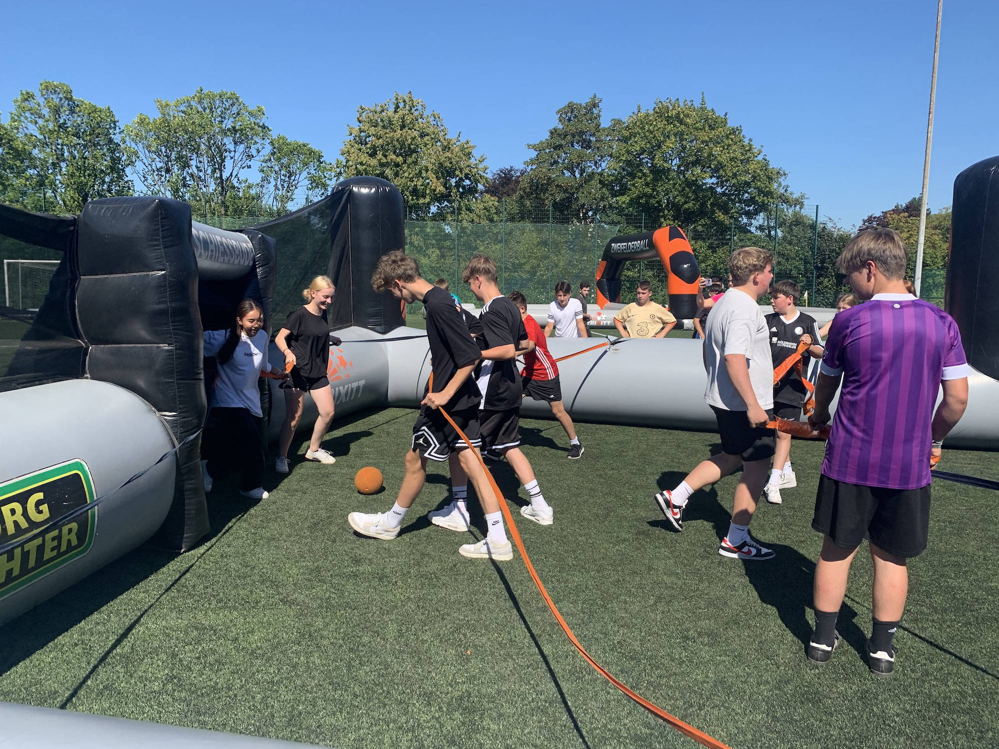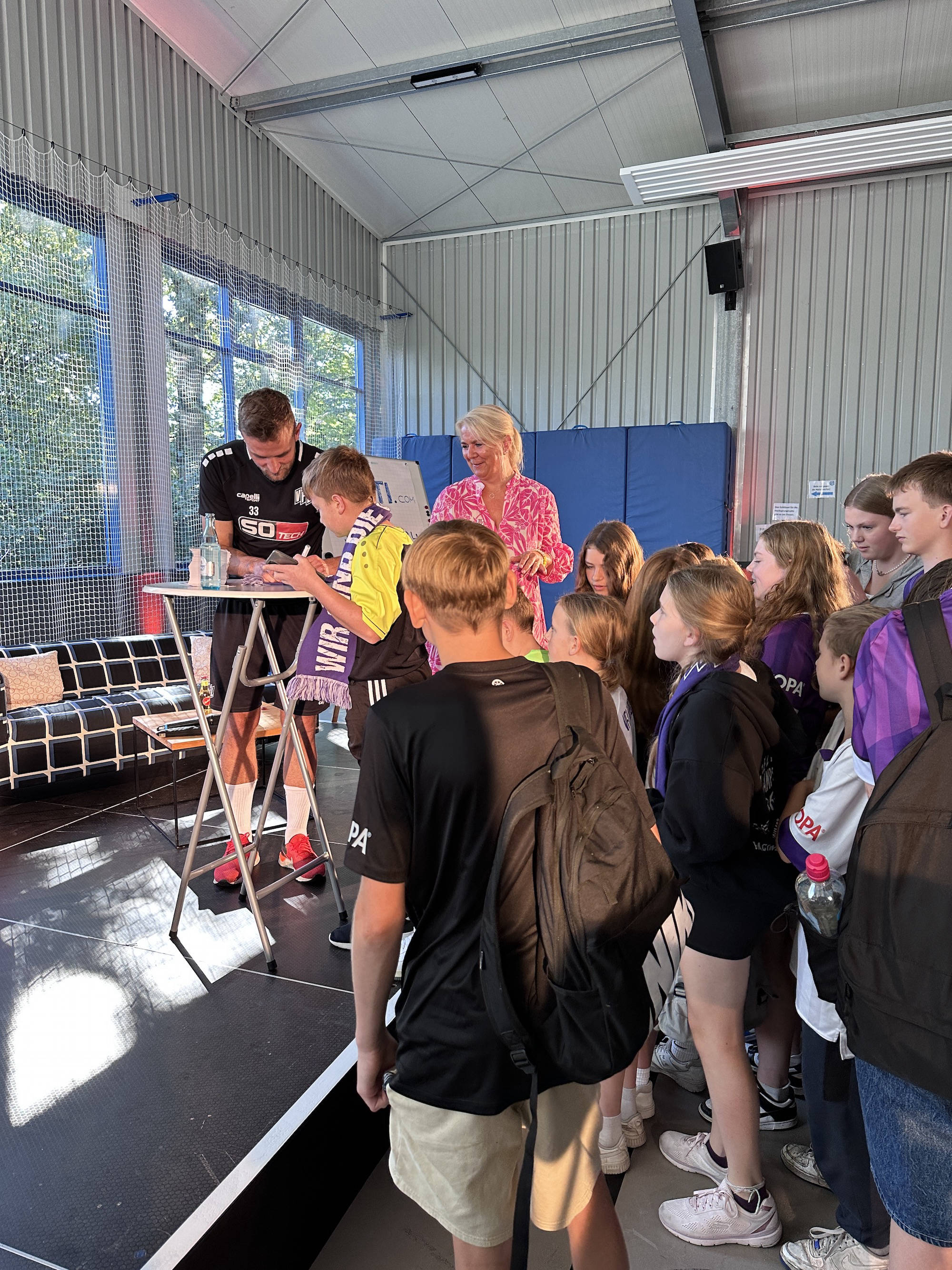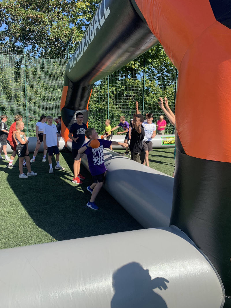 Dann wartete ein Stationsbetrieb der TRIXITT GmbH auf alle SuS. Das war eine große Herausforderung aufgrund der Temperaturen auf dem Platz. Es gab genug kalte Getränke für alle. Die SuS hatten viel Spaß und alle drei für Fairness ausgezeichneten Gruppen kamen von der Domschule. Ein unvergesslicher Tag wurde es dann noch für die großen VFL-Fans, da die Mannschaft nebenan trainierte und im Anschluss geduldig Autogramme gab- sogar auf Fußballschuhe! Verschwitzt und happy fuhren alle wieder nach Hause.