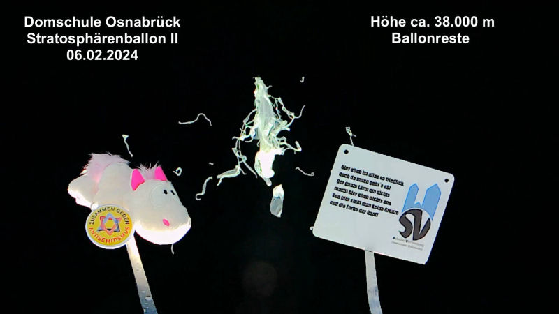 Vier nach oben, unten und seitlich(2) ausgerichtete Kameras machten während des Aufstiegs und des Niedergangs insgesamt ca. 7Stunden lang Film und Bildaufnahmen von hervorragender Qualität. Der Aufstieg durch verschiedene Wolkenschichten, das enorme Ausdehnen des Ballons mit einer ca. Vervierundsechzigfachung des Volumens und die Veränderung des Sonnenstrahlenspektrums ab dem oberen Ozonschichtbereich sind klar zu sehen. Die Aufnahmen zeigen die Erdkrümmung, die Lufthülle "unseres" Planeten im Schnitt und das "schwarze Nichts" des Alls. Auf das Platzen des Ballons um 12:08Uhr in der Maximalhöhe folgen Bilder des rasanten Niedergangs der Styroporbox mit den Kameras und der Messelektronik bis zum Eintauchen in eine Baumkrone (51°40´8.6880N 12°21´11.5920E) in einem kleinen Waldstück nordwestlich des Bahnhofsgebäudes von Muldenstein, Landkreis Anhalt-Bitterfeld in Sachsen-Anhalt. Die Ortung mittels GPS-Tracker funktionierte problemlos.