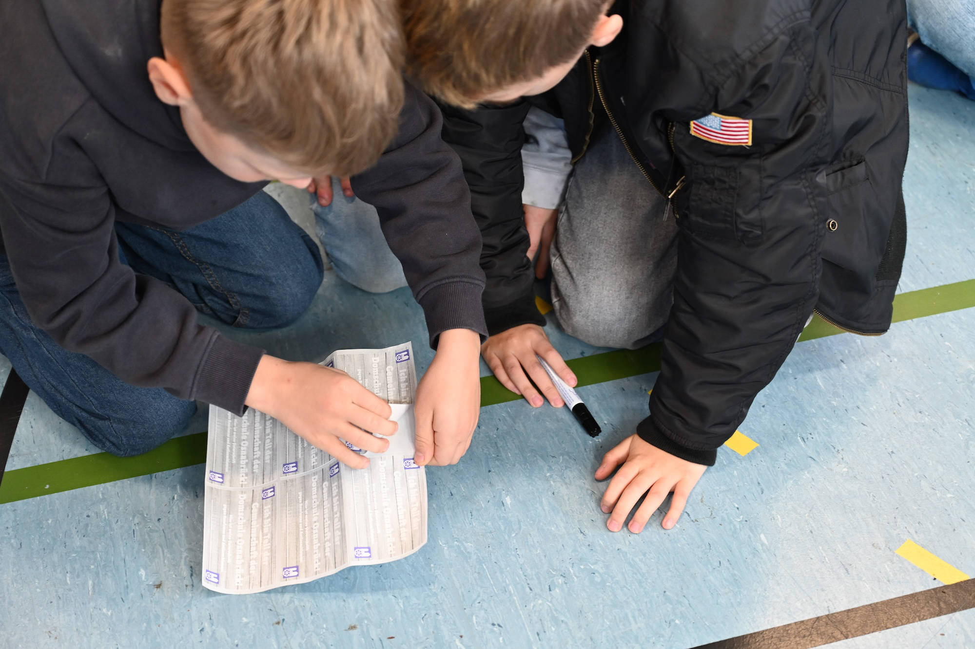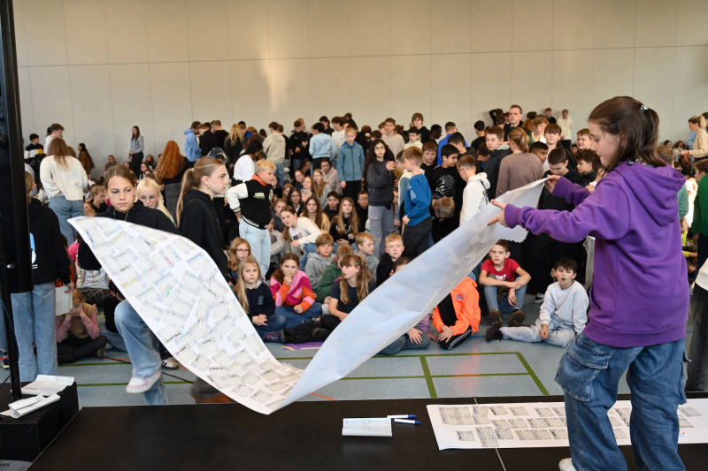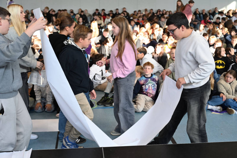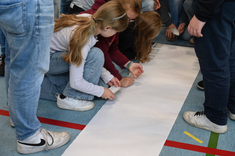 Wenn ihr uns dabei unterstützen wollt, würden wir uns freuen, wenn ihr das mit eurer Unterschrift festhalten würdet. Wir haben für jeden von euch einen Aufkleber, den ihr unterschreiben dürft und dann auf das Plakat vor euch kleben sollt.
