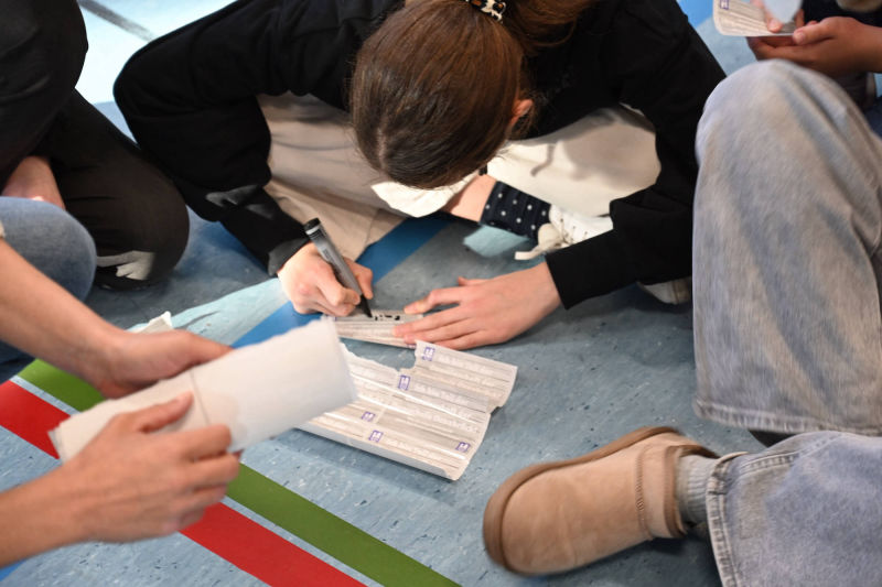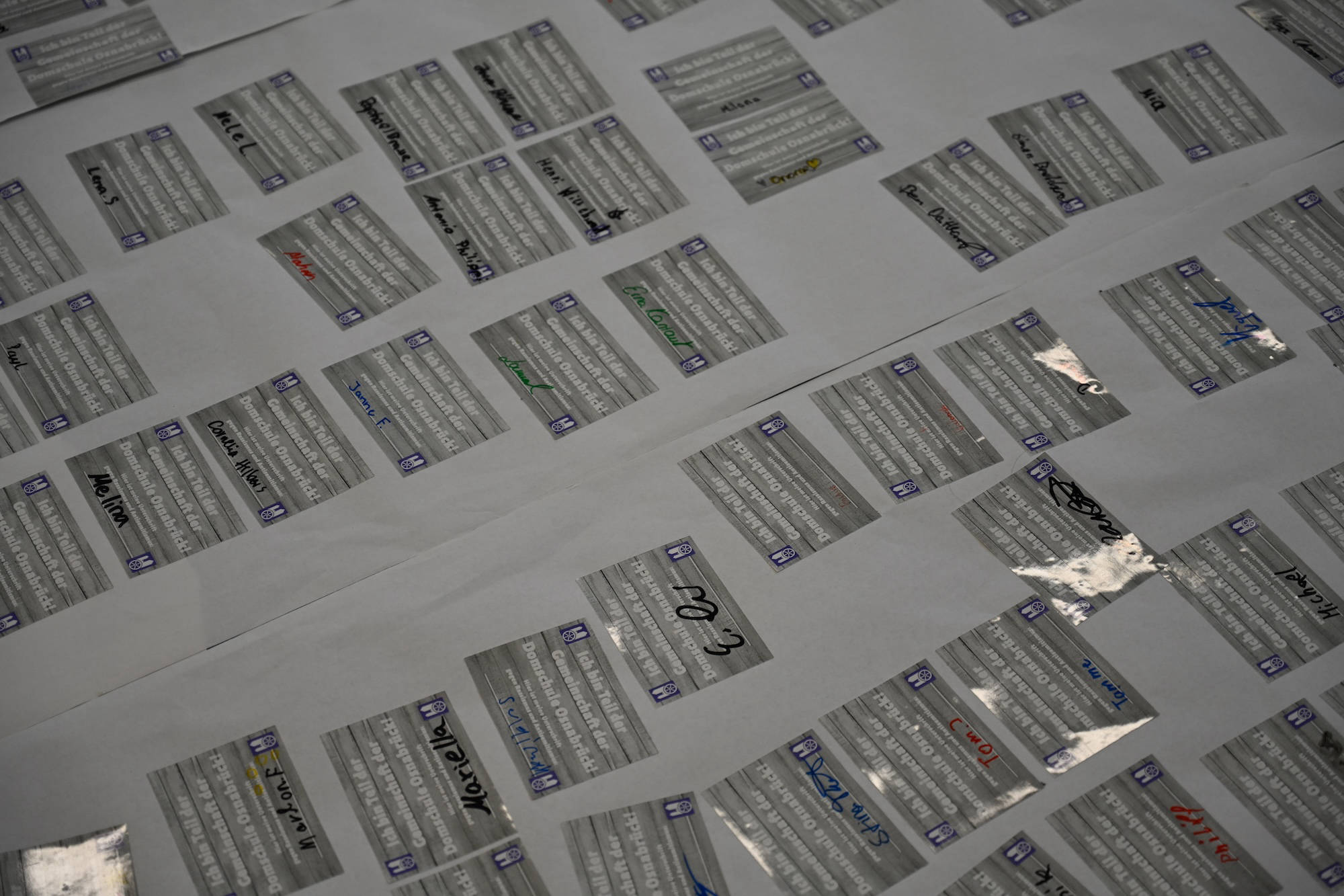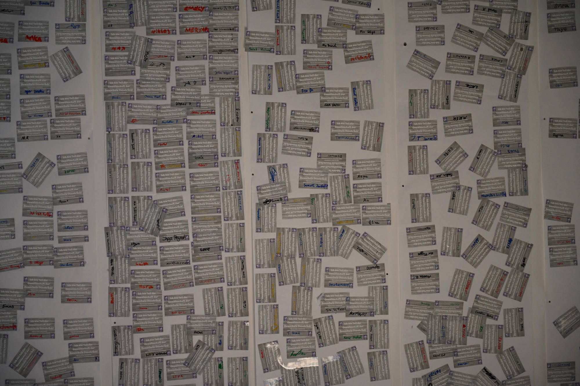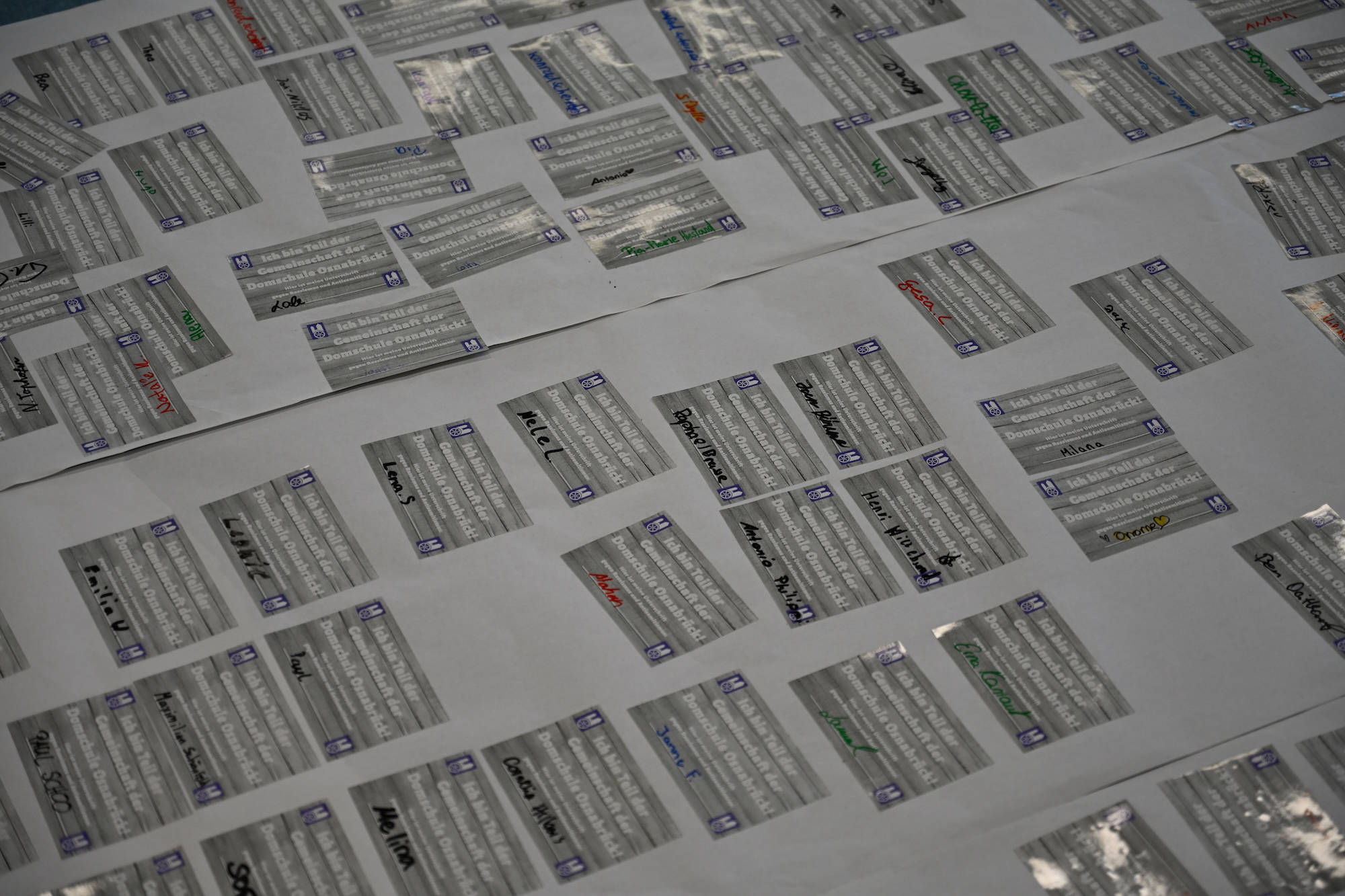 Während ihr unterschreibt, spielen wir Musik und hoffen auf einen reibungslosen Ablauf. Keine Sorge, wir haben genug Aufkleber. Schön wäre, wenn ihr sie nicht übereinander klebt und bitte NUR auf das vorbereitete Plakat. Im Anschluss hängen wir diese Plakate alle zusammen in den Flur am roten Sofa. DANKE euch für eure Unterstützung! Jetzt geht es los.“