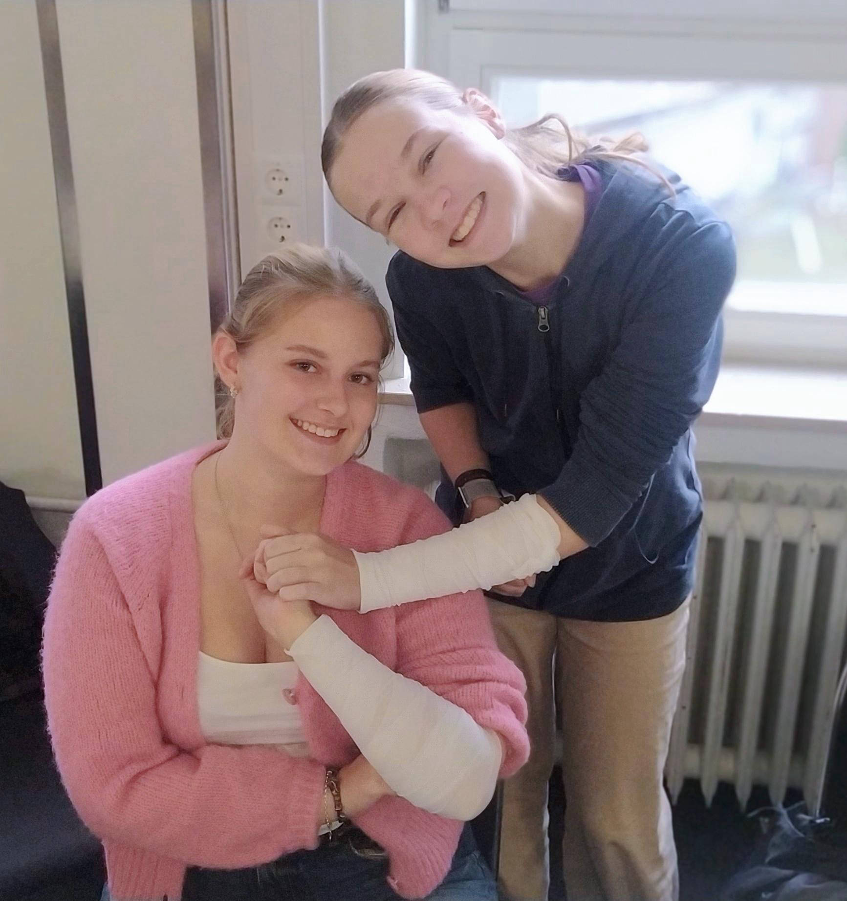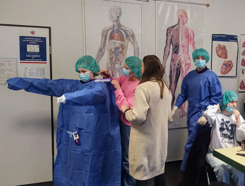 Im Anschluss daran startete der praktische Teil des Besuchs. In kleinen Gruppen hatten die Schülerinnen die Möglichkeit, verschiedene Verbandstechniken zu erlernen und das Anziehen steriler OP-Kleidung zu üben. Diese praxisnahe Erfahrung vermittelte nicht nur wertvolle Kenntnisse, sondern auch einen Einblick in die wichtigen Aufgaben, die im Gesundheitswesen zu bewältigen sind.