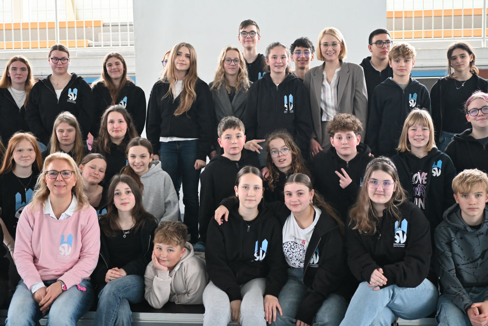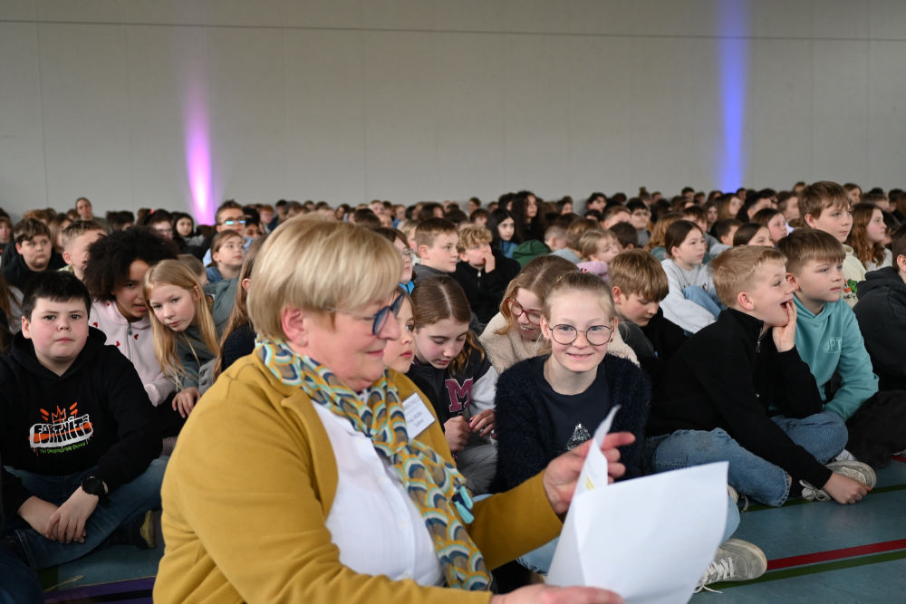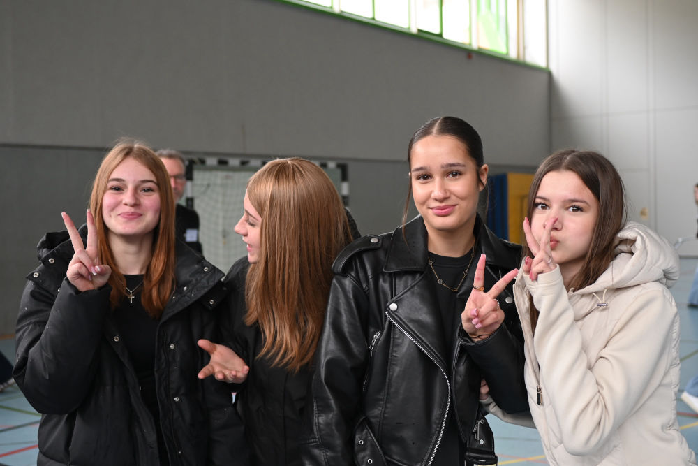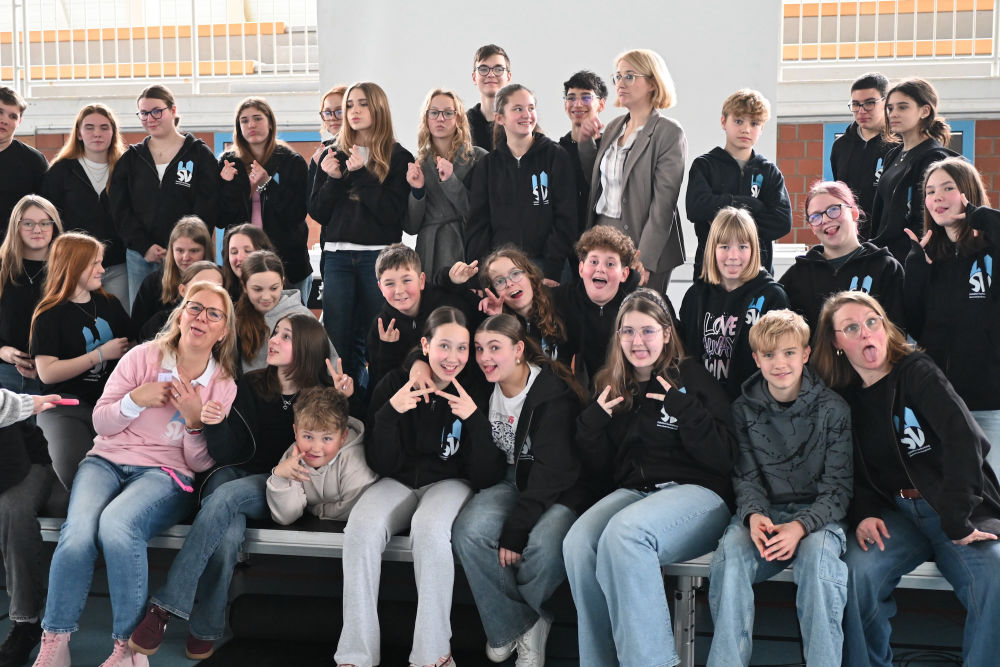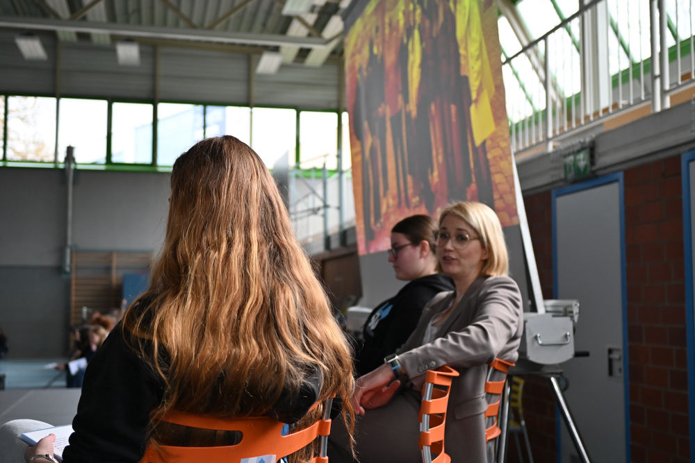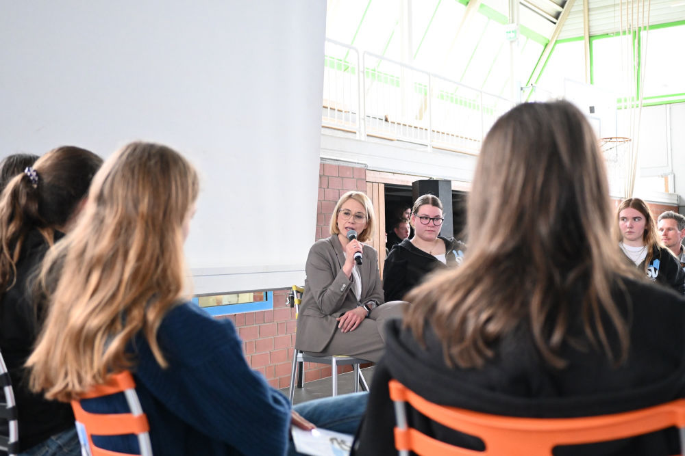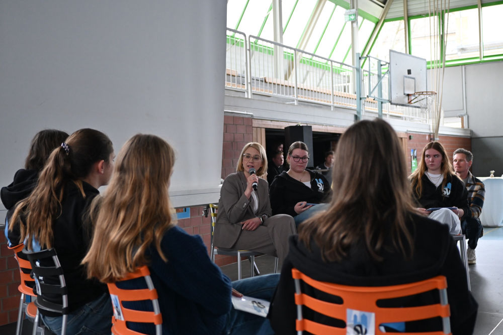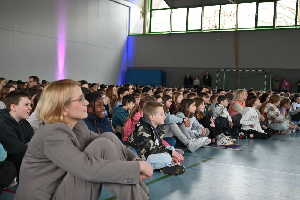 Am 11. März war Oberbürgermeisterin Katharina Pötter zu Besuch in der Domschule. Nach einem Rundgang durch die Gebäude und einem Gespräch mit Schülerinnen, Schülern, Kolleginnen und Kollegen sowie der Schulleitung stellte sie sich den Fragen der Schülerschaft in der Vollversammlung in der Turnhalle.