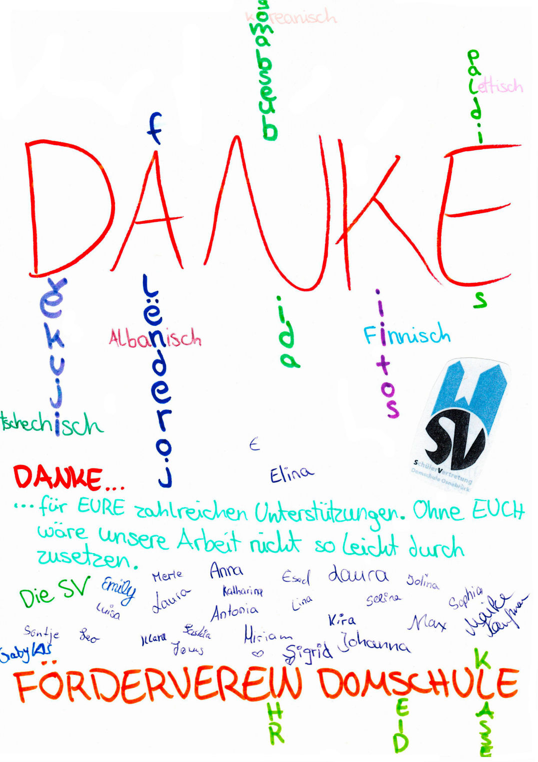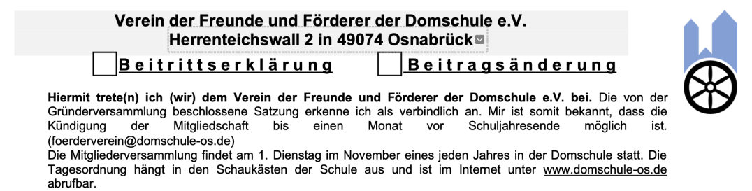 Ihr Kind soll sich in der Gemeinschaft der Domschule wohl fühlen und gute Voraussetzungen zum Lernen finden. Da der Schulhaushalt leider nicht immer alle wünschenswerten Investitionen für das schulische Umfeld abdecken kann, sind wir mit vielen unterschiedlichen Aktionen tätig, um die nötige finanzielle Unterstützung aufzubringen. Wir freuen uns, wenn Sie sich entschließen, den Förderverein der Domschule zu unterstützen und dem Verein beitreten.