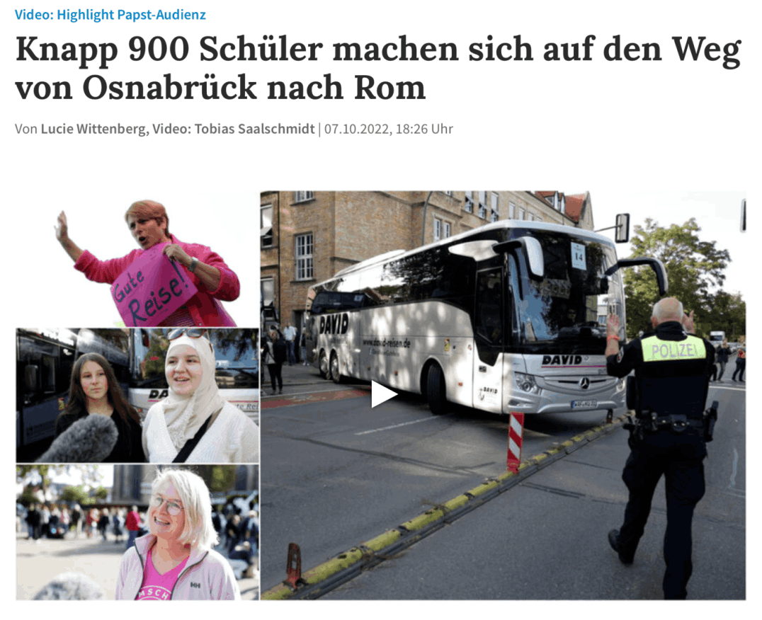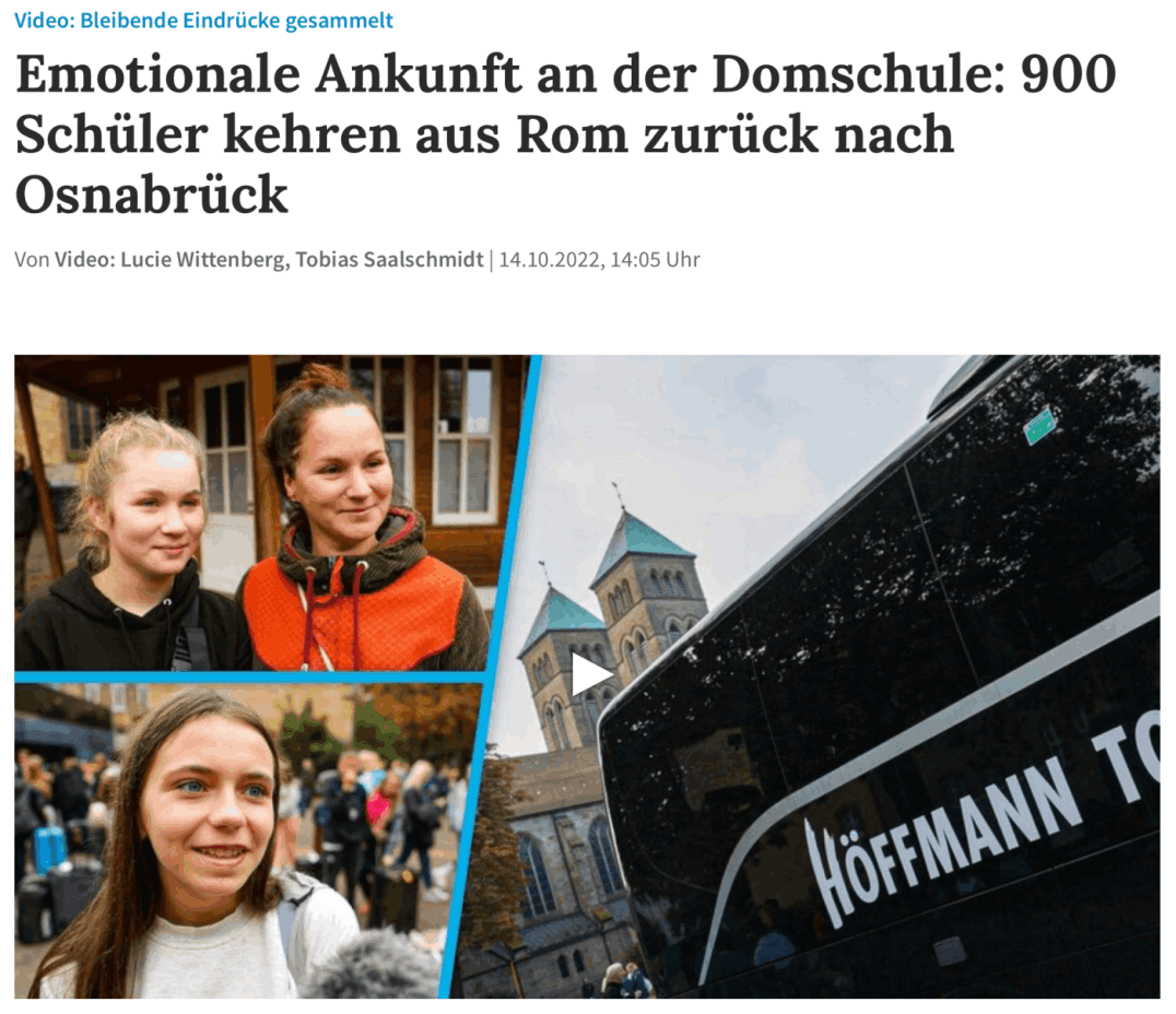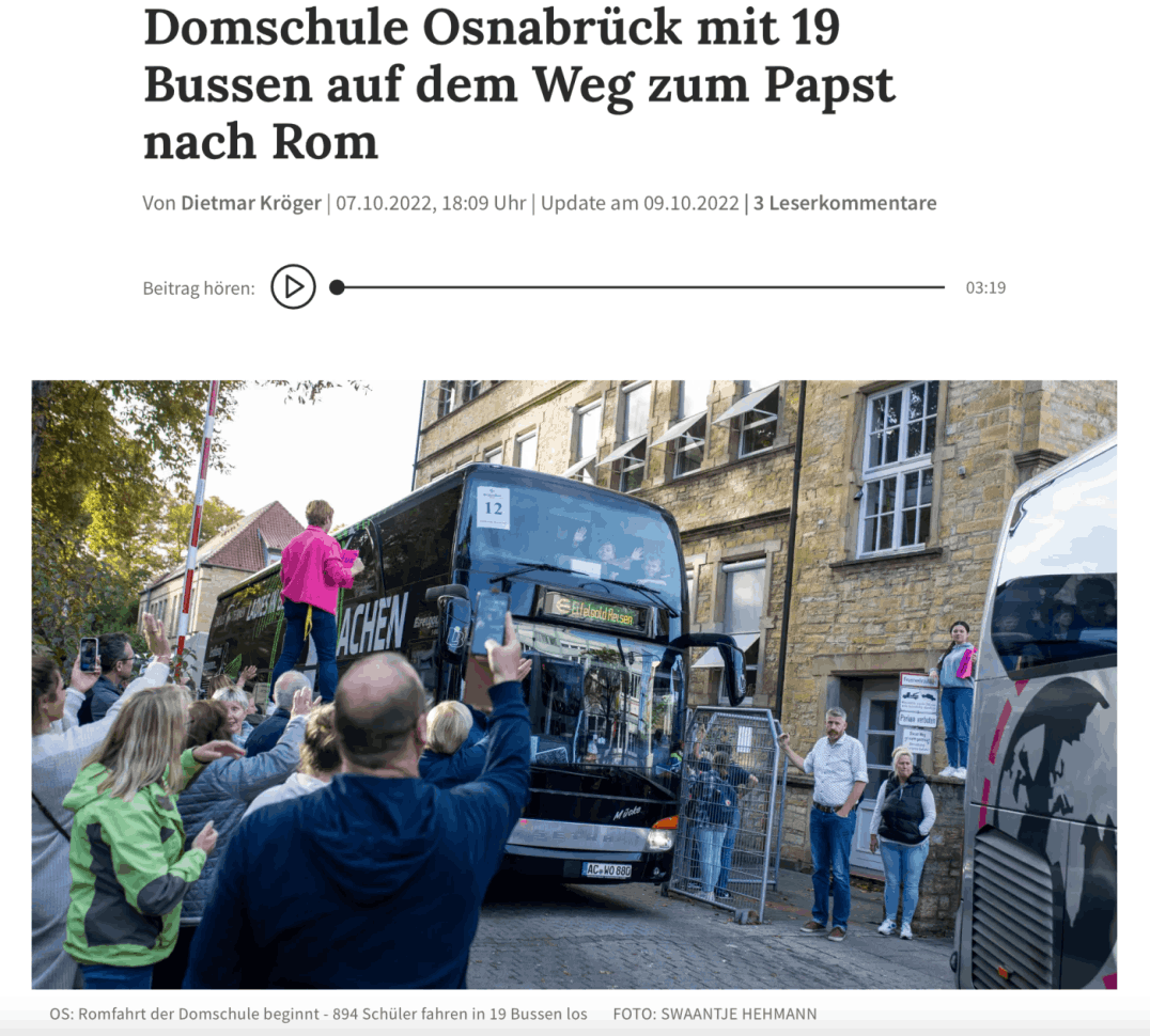 Nach fünf Jahren geht die Domschule Osnabrück wieder auf Pilgerreise nach Rom. Am Freitagnachmittag machte sie die Reisegruppe vom Schulhof der Domschule auf den Weg in die Ewige Stadt. 24 Stunden Busfahrt liegen vor den Lehrern, Betreuern und Schülern.
