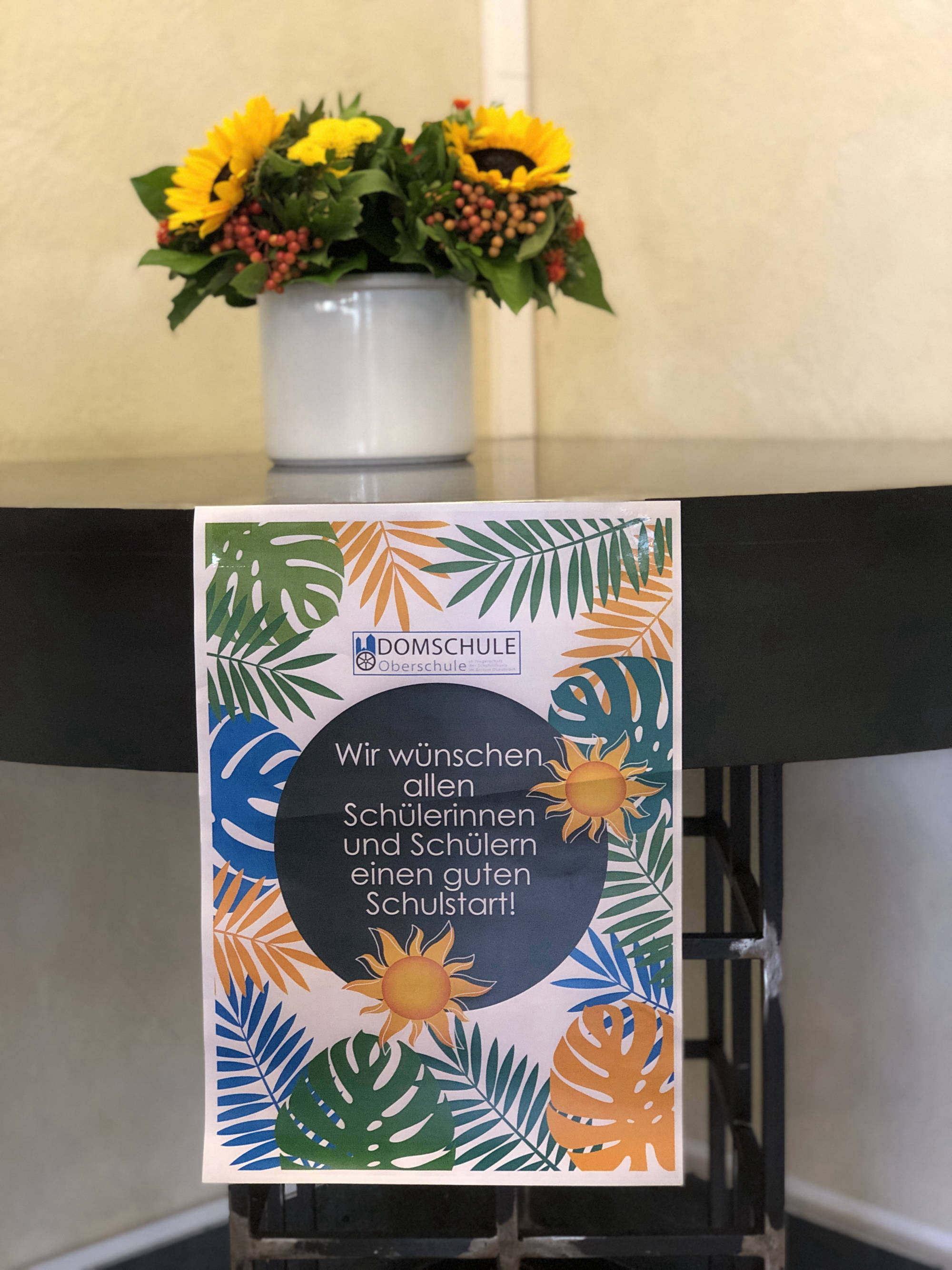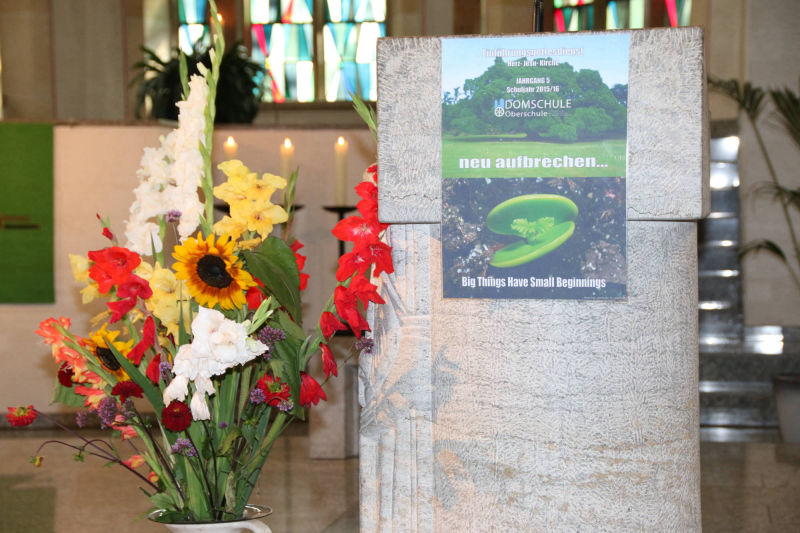 In der Regel erhalten die Kinder am Ende des Gottesdienstes ein zum Thema passendes Symbol (Murmel, Stein, Muschel, Schirmchen). Manchmal tauchen diese Einschulungserinnerungen dann bei den Abschlussprüfungen Ende Klasse 10 in den Federmappen der Schüler als „Glücksbringer“ und Schulzeitbegleiter wieder auf. Nach dem Gottesdienst gehen Schüler, Eltern und Lehrer gemeinsam in den mit Namensschildern vorbereiteten Klassenraum, den die Kinder ja ebenfalls bereits kennen. Sie durchschreiten dabei ein Spalier der Sechstklässler, die den Weg mit begeisterten Begrüßungs- Laola-Wellen begleiten. Nach einer kurzen Information durch den Klassenlehrer werden die Eltern entlassen und können die Wartezeit wieder nutzen, um in der Cafeteria mit den anderen Eltern in Kontakt zu kommen. Außerdem haben die Eltern die Möglichkeit, aus dem Angebot des Umweltshops der Domschule die Schulmaterialien zu kaufen, die auf der Materialliste, die sie an diesem Tag erhalten haben, kaufen. Die Schülerinnen und Schüler erhalten während dieser Zeit ihren Stundenplan, den „Durchblicker“ (s.7.),den Schülerplaner – ein schulinternes Hausaufgabenheft - weitere Informationen und beenden die Stunde mit einem weiteren Kennenlernspiel. Um 11.15 Uhr ist der erste Schultag beendet und die Klassenlehrer begleiten ihre neuen Schüler in die Cafeteria zu den Eltern.
