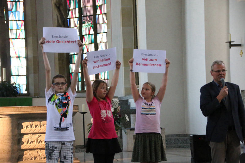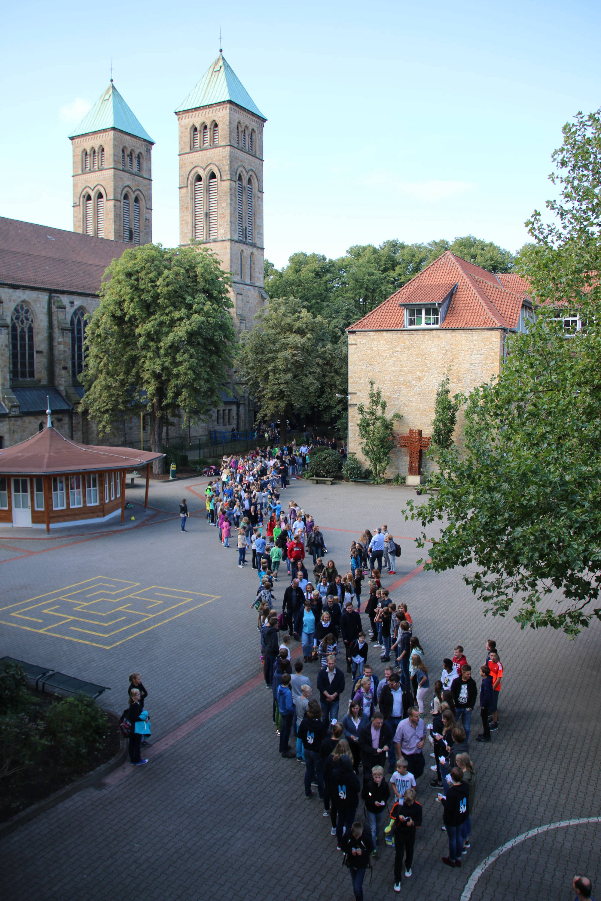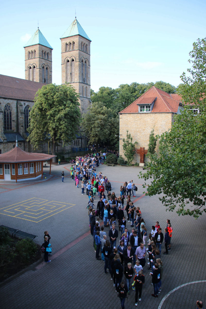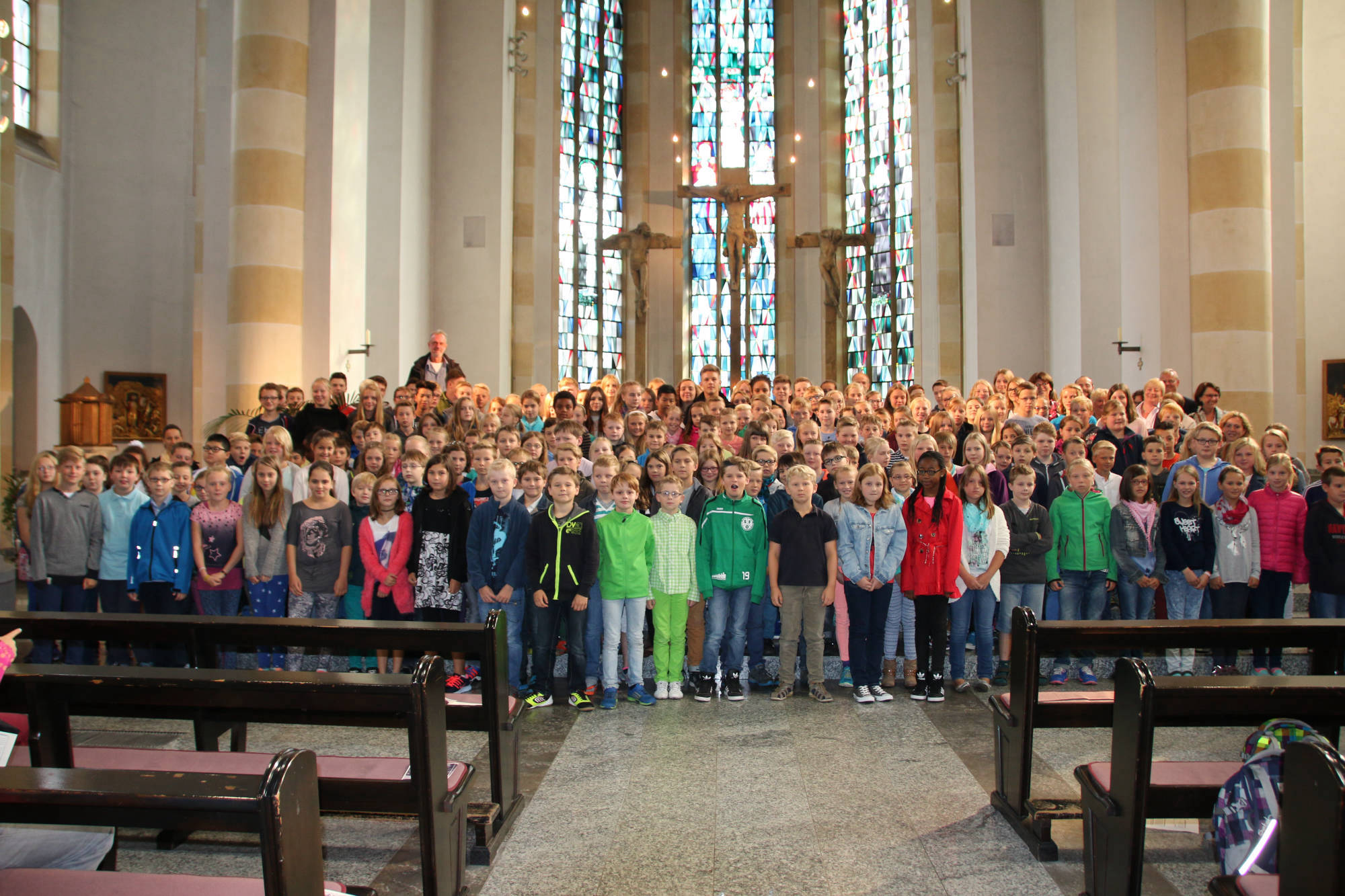 Der Wechsel von der Grundschule zur weiterführenden Schule, oft verbunden mit einem Wechsel vom Dorf in die Stadt, ist ein entscheidender Schritt. Oft kommen die Kinder von kleinen Grundschulen und finden sich nun auf dem Schulhof mit etwa 1000 anderen Kindern wieder. Außerdem waren sie zuletzt die „Großen“ in ihren Schulen und sind nun wieder die „Kleinen“. Auch für die Eltern ist dieser Tag begleitet von vielen Fragen. Deshalb ist es aus unserer Sicht wichtig, diesen Tag in besonderer Weise zu gestalten und die Kinder schnell miteinander, aber auch mit vielen Gegebenheiten vertraut zu machen. Der Einschulungstag beginnt bei uns um 9.00 Uhr mit einem Wortgottesdienst in der Herz-Jesu-Kirche. Das Thema dieses Gottesdienstes ist immer so angelegt, dass es Vertrauen bei den Kindern aufbauen und ihnen Sicherheit geben soll: „Alle in einem Boot“, „Unter Gottes Schutz und Schirm“, „Geborgen in Gottes Hand“, Sei behütet auf deinen Wegen“. An dieser Feier nehmen auch die Paten teil, die den Schülern ja bereits durch den Kennenlernnachmittag vertraut sind. Der Gottesdienst, mitgestaltet von Schülern und Lehrern, endet mit einem gemeinsamen Foto aller Fünftklässler, ihrer Paten und Lehrer – ein Foto mit etwa 200 Personen, das schon aufgrund der Enge ein Wir-Gefühl aufkommen lässt. Schnell ins Internet gestellt können die Kinder nachmittags schon dieses Foto sehen.