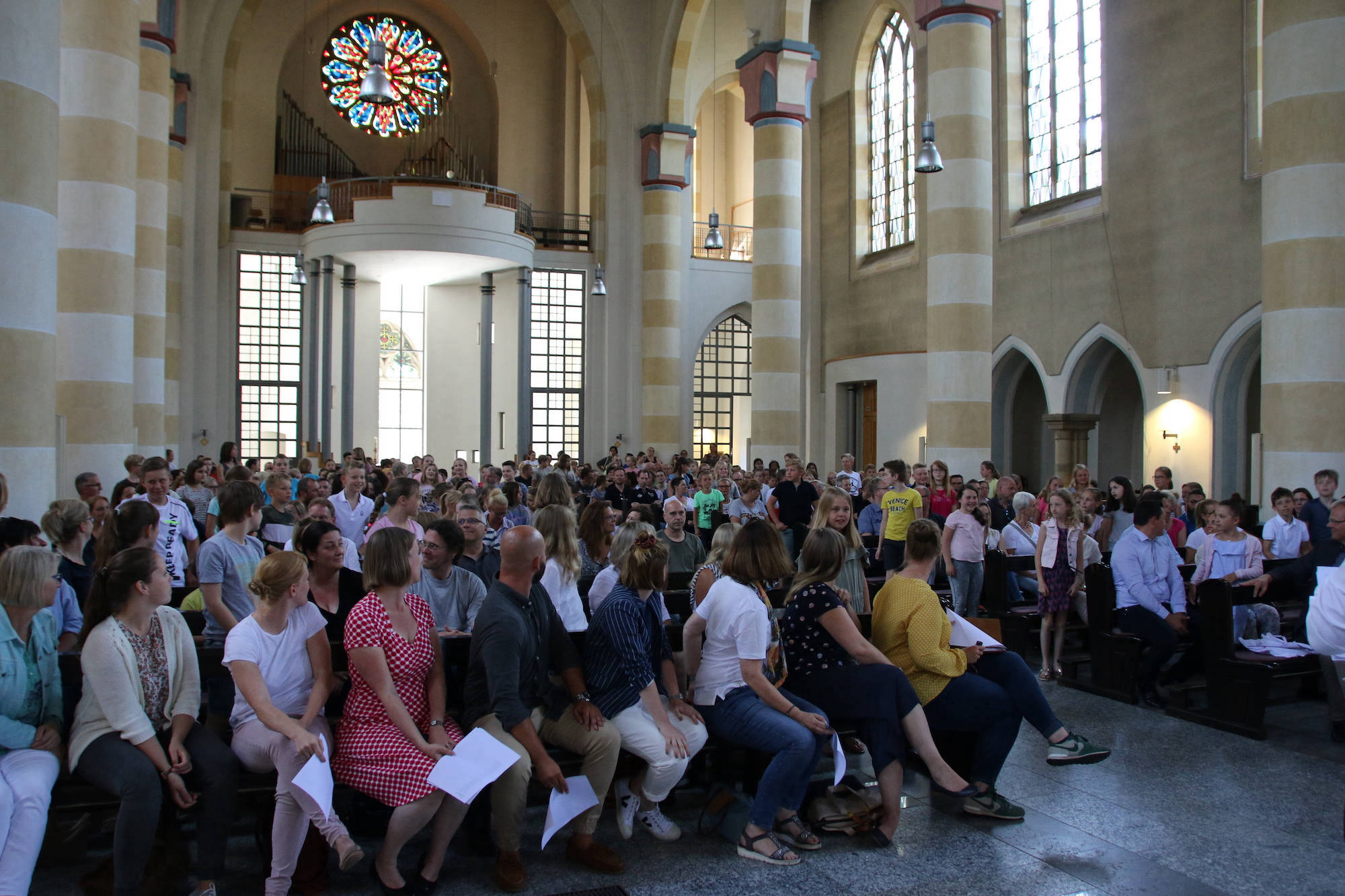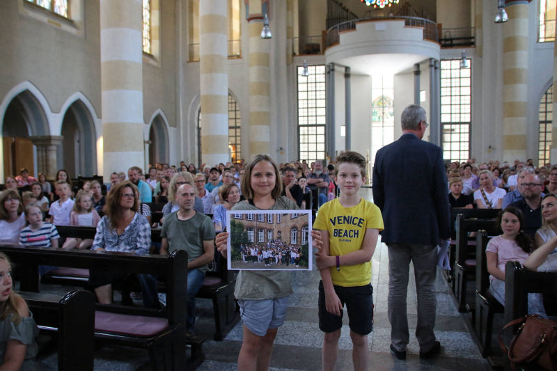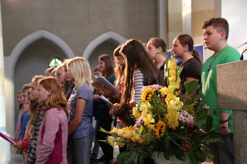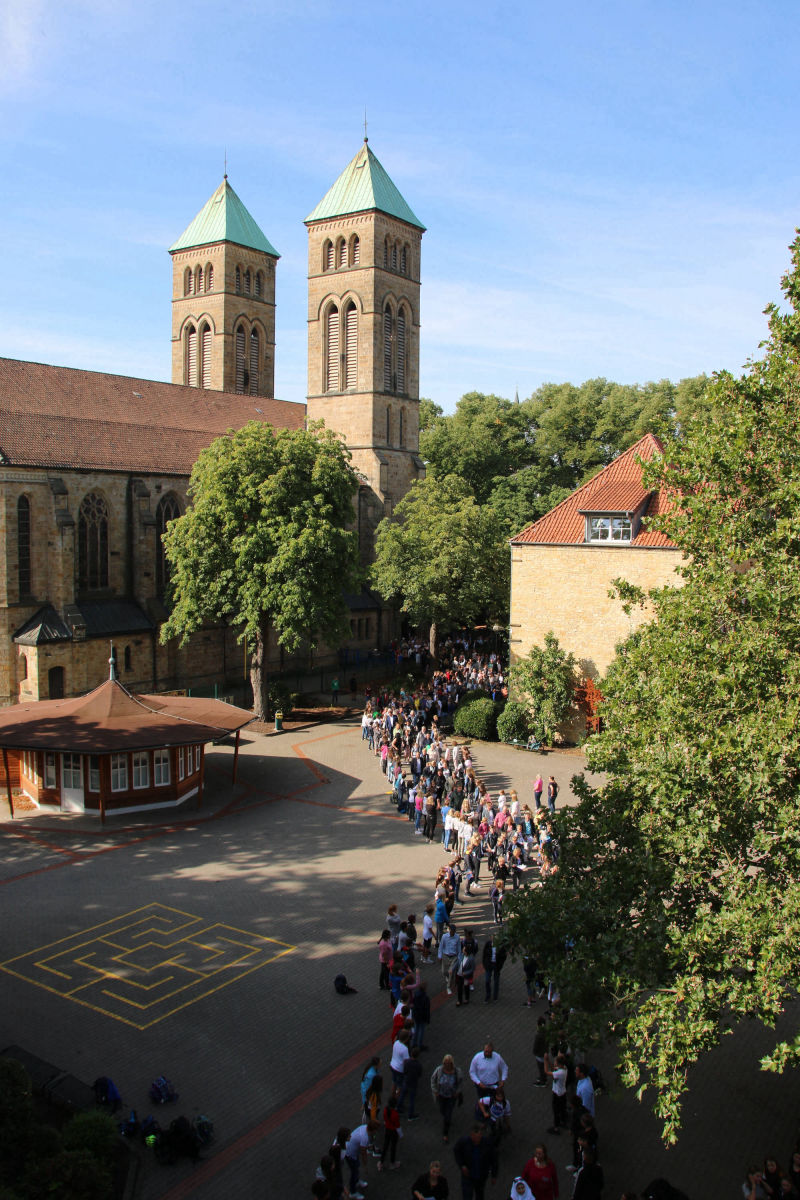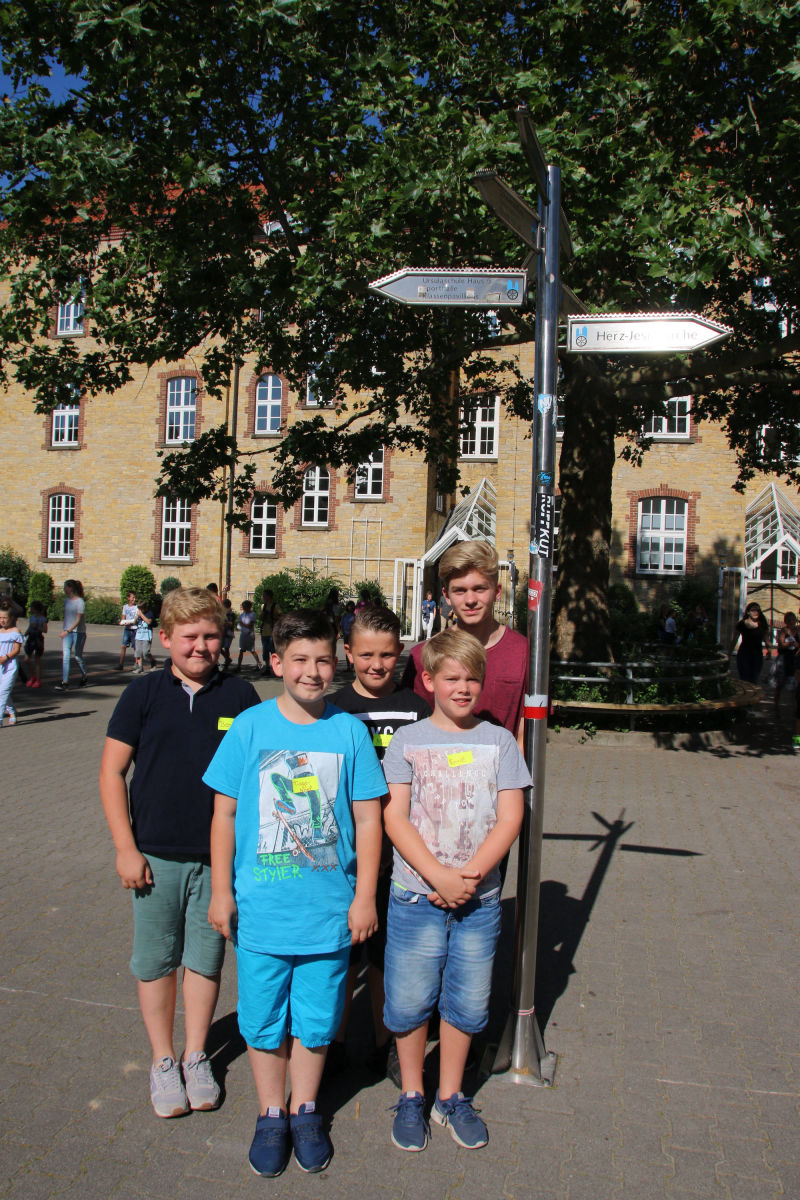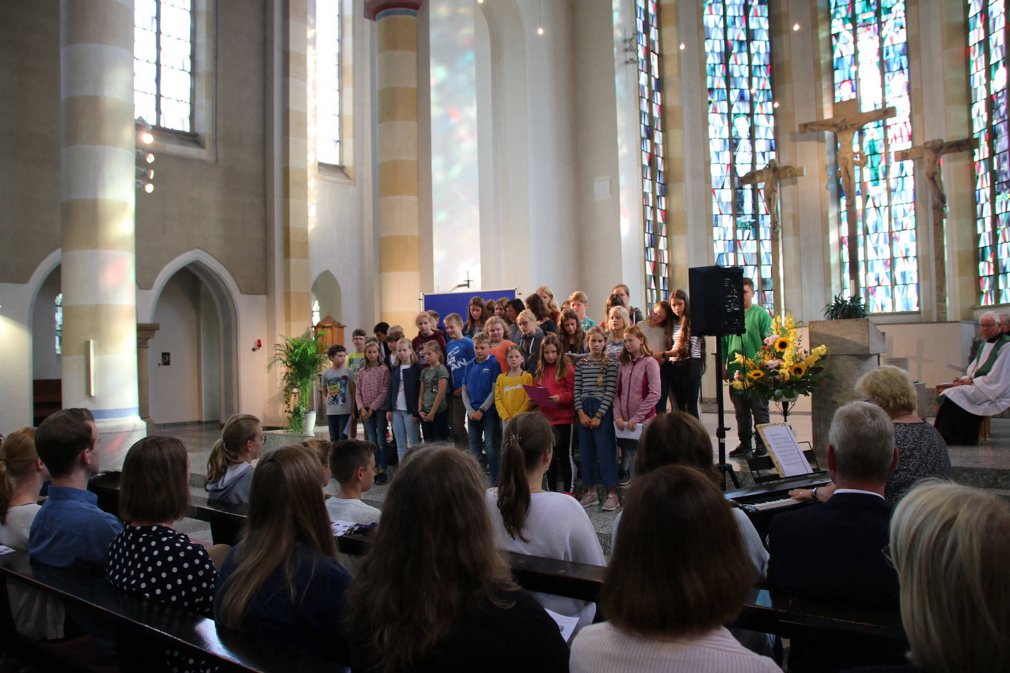 Der Wechsel von der Grundschule zur weiterführenden Schule, oft verbunden mit einem Wechsel vom Dorf in die Stadt, ist ein entscheidender Schritt. Oft kommen die Kinder von kleinen Grundschulen und finden sich nun auf dem Schulhof mit etwa 1000 anderen Kindern wieder. Außerdem waren sie zuletzt die „Großen“ in ihren Schulen und sind nun wieder die „Kleinen“. Auch für die Eltern ist dieser Tag begleitet von vielen Fragen. Deshalb ist es aus unserer Sicht wichtig, diesen Tag in besonderer Weise zu gestalten und die Kinder schnell miteinander, aber auch mit vielen Gegebenheiten vertraut zu machen. Der Einschulungstag beginnt bei uns um 9.00 Uhr mit einem Wortgottesdienst in der Herz-Jesu-Kirche. Das Thema dieses Gottesdienstes ist immer so angelegt, dass es Vertrauen bei den Kindern aufbauen und ihnen Sicherheit geben soll: „Alle in einem Boot“, „Unter Gottes Schutz und Schirm“, „Geborgen in Gottes Hand“, Sei behütet auf deinen Wegen“. An dieser Feier nehmen auch die Paten teil, die den Schülern ja bereits durch den Kennenlernnachmittag vertraut sind. Der Gottesdienst, mitgestaltet von Schülern und Lehrern, endet mit einem gemeinsamen Foto aller Fünftklässler, ihrer Paten und Lehrer – ein Foto mit etwa 200 Personen, das schon aufgrund der Enge ein Wir-Gefühl aufkommen lässt. Schnell ins Internet gestellt können die Kinder nachmittags schon dieses Foto sehen.