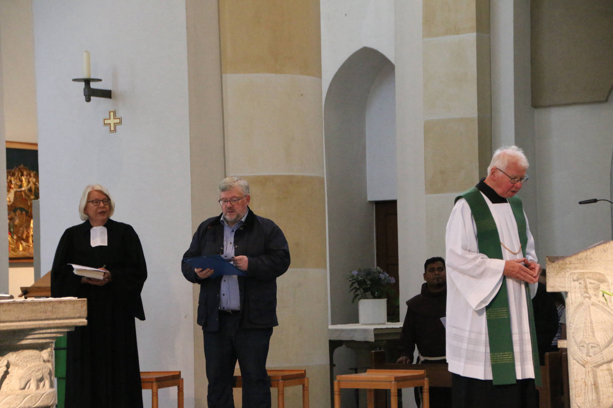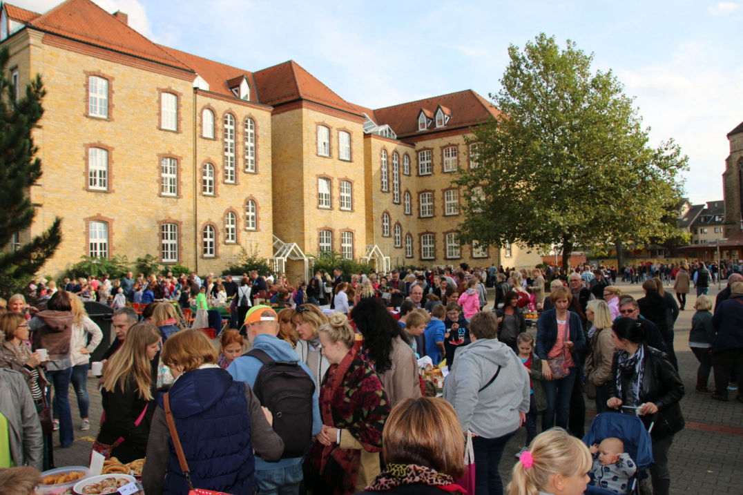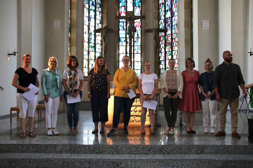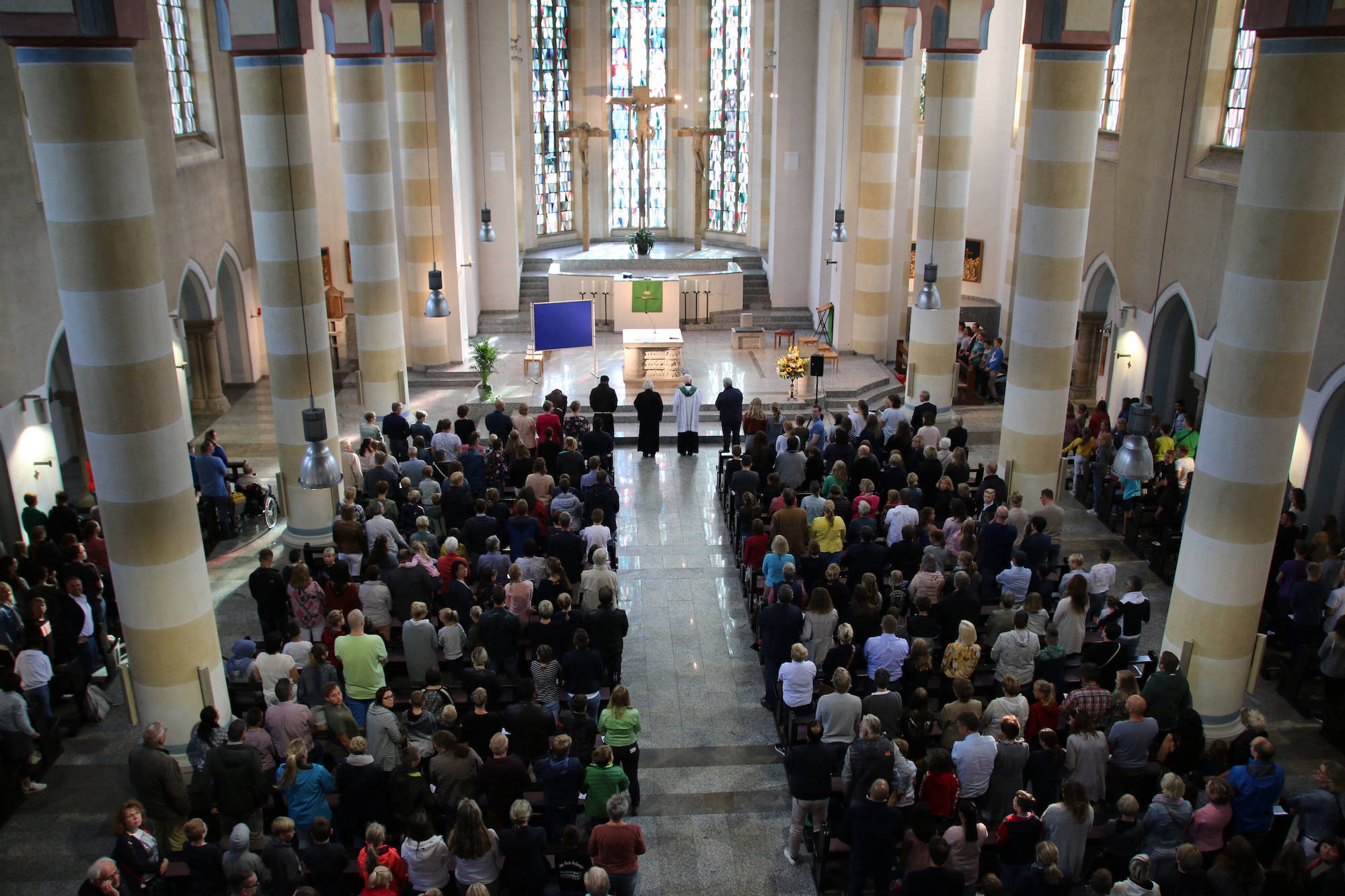 Der Wechsel von der Grundschule zur weiterführenden Schule, oft verbunden mit einem Wechsel vom Dorf in die Stadt, ist ein entscheidender Schritt. Oft kommen die Kinder von kleinen Grundschulen und finden sich nun auf dem Schulhof mit etwa 1000 anderen Kindern wieder. Außerdem waren sie zuletzt die „Großen“ in ihren Schulen und sind nun wieder die „Kleinen“. Auch für die Eltern ist dieser Tag begleitet von vielen Fragen. Deshalb ist es aus unserer Sicht wichtig, diesen Tag in besonderer Weise zu gestalten und die Kinder schnell miteinander, aber auch mit vielen Gegebenheiten vertraut zu machen. Der Einschulungstag beginnt bei uns um 9.00 Uhr mit einem Wortgottesdienst in der Herz-Jesu-Kirche. Das Thema dieses Gottesdienstes ist immer so angelegt, dass es Vertrauen bei den Kindern aufbauen und ihnen Sicherheit geben soll: „Alle in einem Boot“, „Unter Gottes Schutz und Schirm“, „Geborgen in Gottes Hand“, Sei behütet auf deinen Wegen“. An dieser Feier nehmen auch die Paten teil, die den Schülern ja bereits durch den Kennenlernnachmittag vertraut sind. Der Gottesdienst, mitgestaltet von Schülern und Lehrern, endet mit einem gemeinsamen Foto aller Fünftklässler, ihrer Paten und Lehrer – ein Foto mit etwa 200 Personen, das schon aufgrund der Enge ein Wir-Gefühl aufkommen lässt. Schnell ins Internet gestellt können die Kinder nachmittags schon dieses Foto sehen.