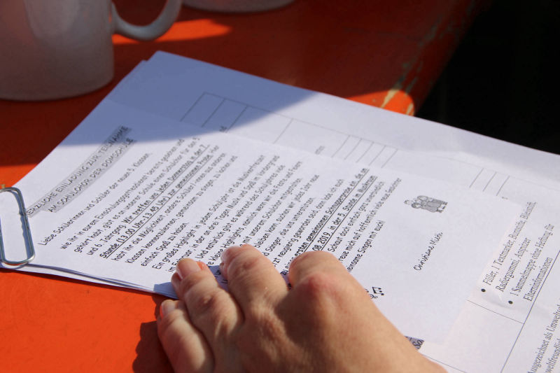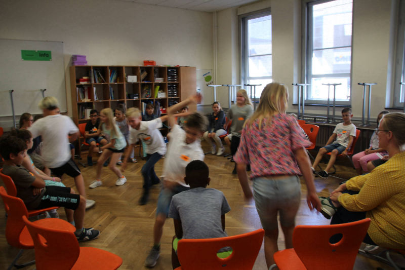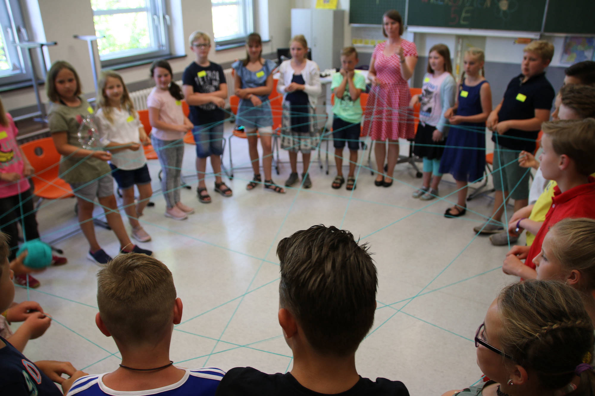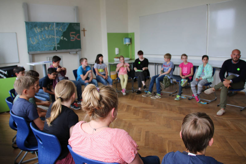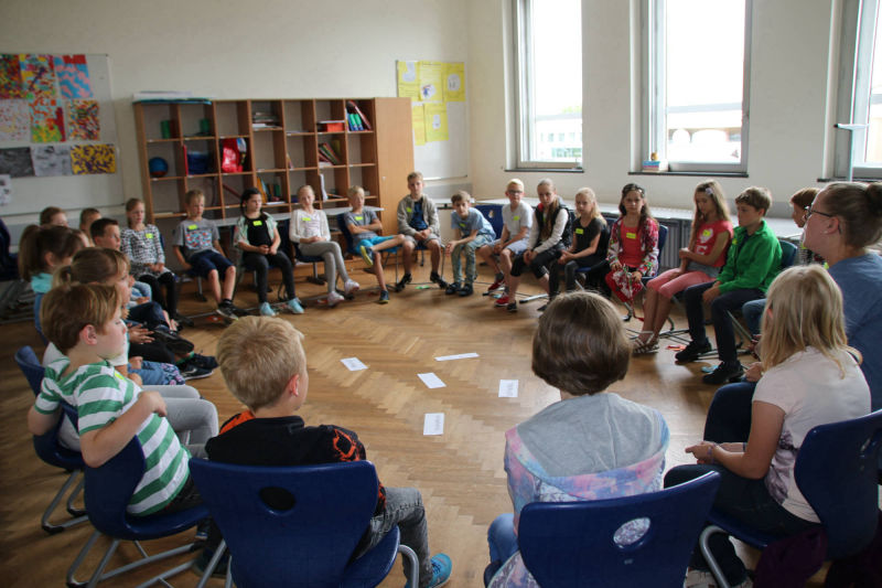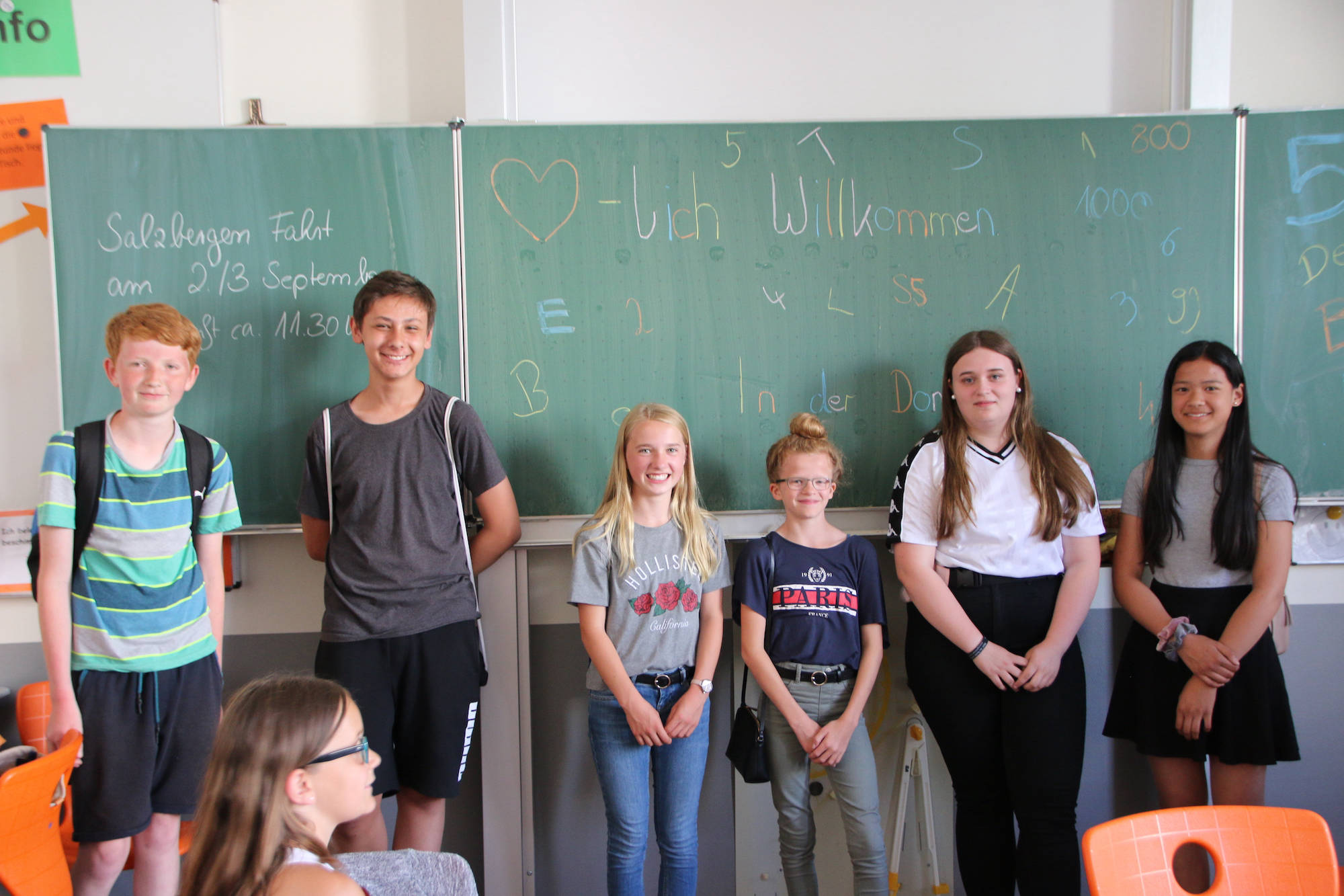 Auch dabei unterstützen die Paten die Klassenlehrer, denn die Kleinen sind häufig überfordert mit dem Eintrag in Listen, der Beschriftung der Bücher usw. Im Anschluss an die wiederum mit den Paten verbrachten Pause ist nun eine erste Einheit des Methodencurriculums für Jahrgang 5 – „Das Lernen lernen“ – vorgesehen. Meistens ist es das Thema „Wie gestalte ich meinen Arbeitsplatz?“, eine grundlegende Voraussetzung, um effektiv lernen zu können. Auch an diesem Tag endet der Unterricht nach der vierten Stunde. Vom vierten Tag an läuft der Stundenplan nach Plan und in der Regel beginnen die Kleinen hochmotiviert, endlich „richtig“ zu arbeiten. Wie viel sie während der ersten Tage aufgenommen und verarbeitet haben, ist ihnen kaum bewusst. Wir halten es für sehr wichtig, dieser Einstiegsphase so viel Zeit zu geben, damit alle Schülerinnen und Schüler sich schnell vertraut und sicher mit den bisher für sie fremden Personen und mit der ungewohnten Umgebung fühlen.