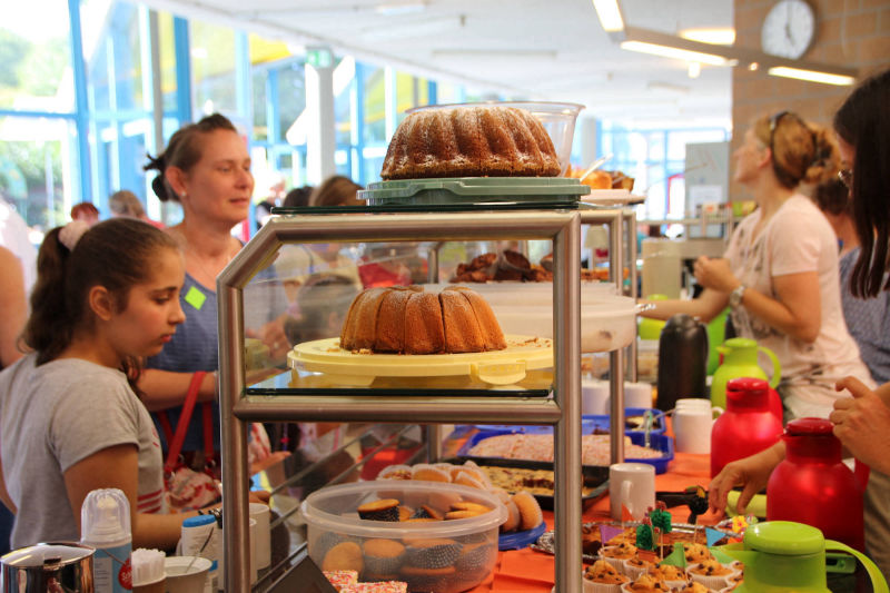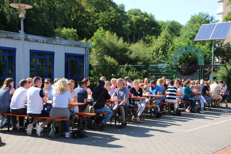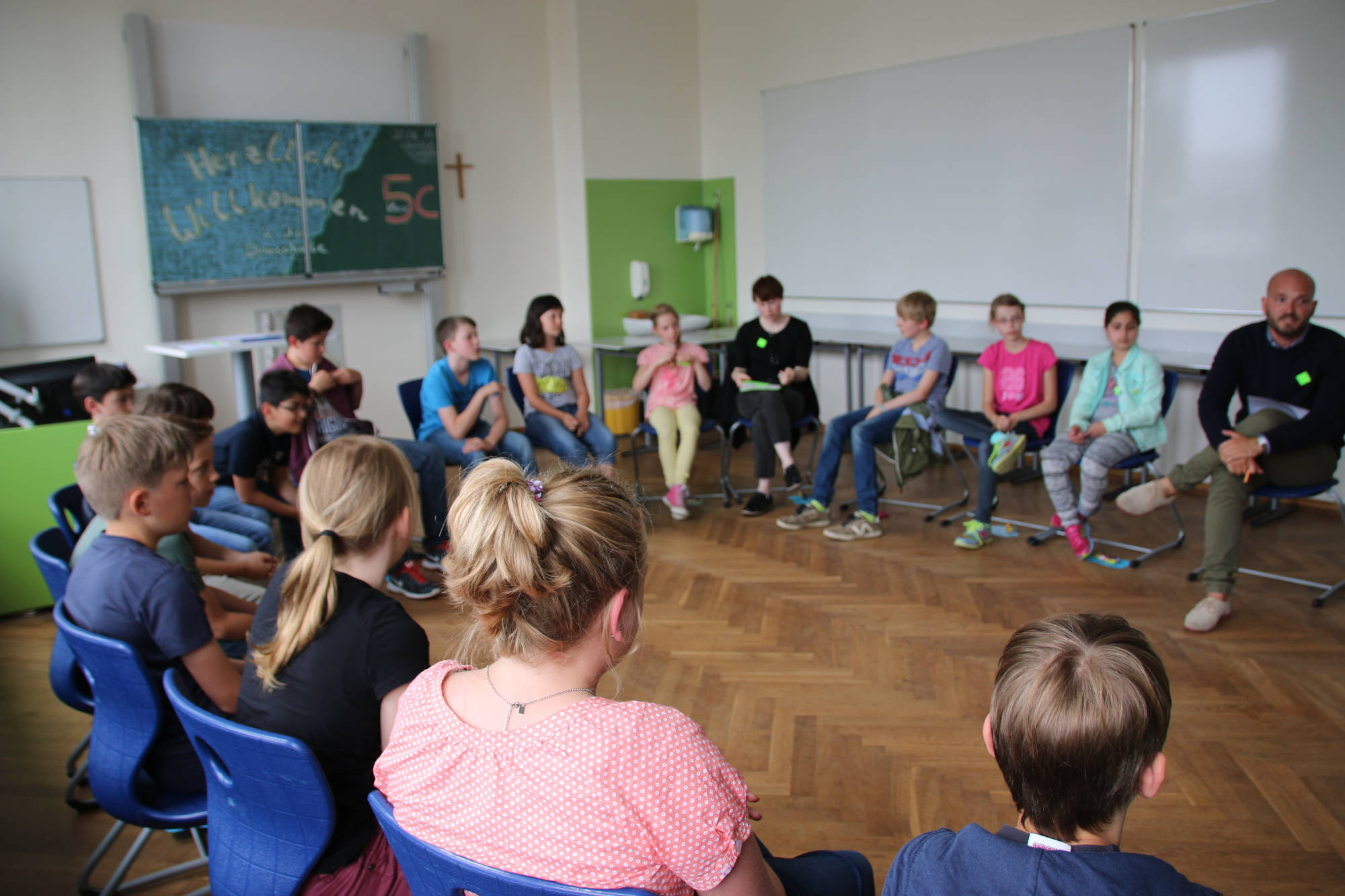 Bereits kurz vor den Sommerferien werden die neuen Fünftklässler eingeladen zu einem Kennenlernnachmittag gemeinsam mit ihren Eltern. Auch wenn der Abschied aus der Grundschulklasse genau in diese Zeit fällt und seine Zeit braucht, hat die Erfahrung gezeigt, dass dieser Nachmittag für die neuen Schülerinnen und Schüler, für die Eltern, aber auch für die Schule vieles erleichtert. An diesem Nachmittag versammeln sich alle Schülerinnen und Schüler in der Herz- Jesu-Kirche. (Wir dürfen diese Kirche als „Aula“ nutzen.) Nach einer Begrüßung erfahren sie, in welche Klasse sie nach den Ferien gehen werden und wer ihr Klassenlehrer wird. Gemeinsam gehen die Kinder mit den Lehrern und den Eltern in den zukünftigen Klassenraum. Nach einer kurzen Begrüßung werden die Eltern „entlassen“, um sich in der Cafeteria bei Kaffee und Kuchen auszutauschen und Kontakte zu knüpfen. Da jede Klasse eine eigene Farbe hat – die Eltern tragen einen entsprechenden Klebepunkt - , erkennen sie leicht, wer zu ihrer Klasse gehört.