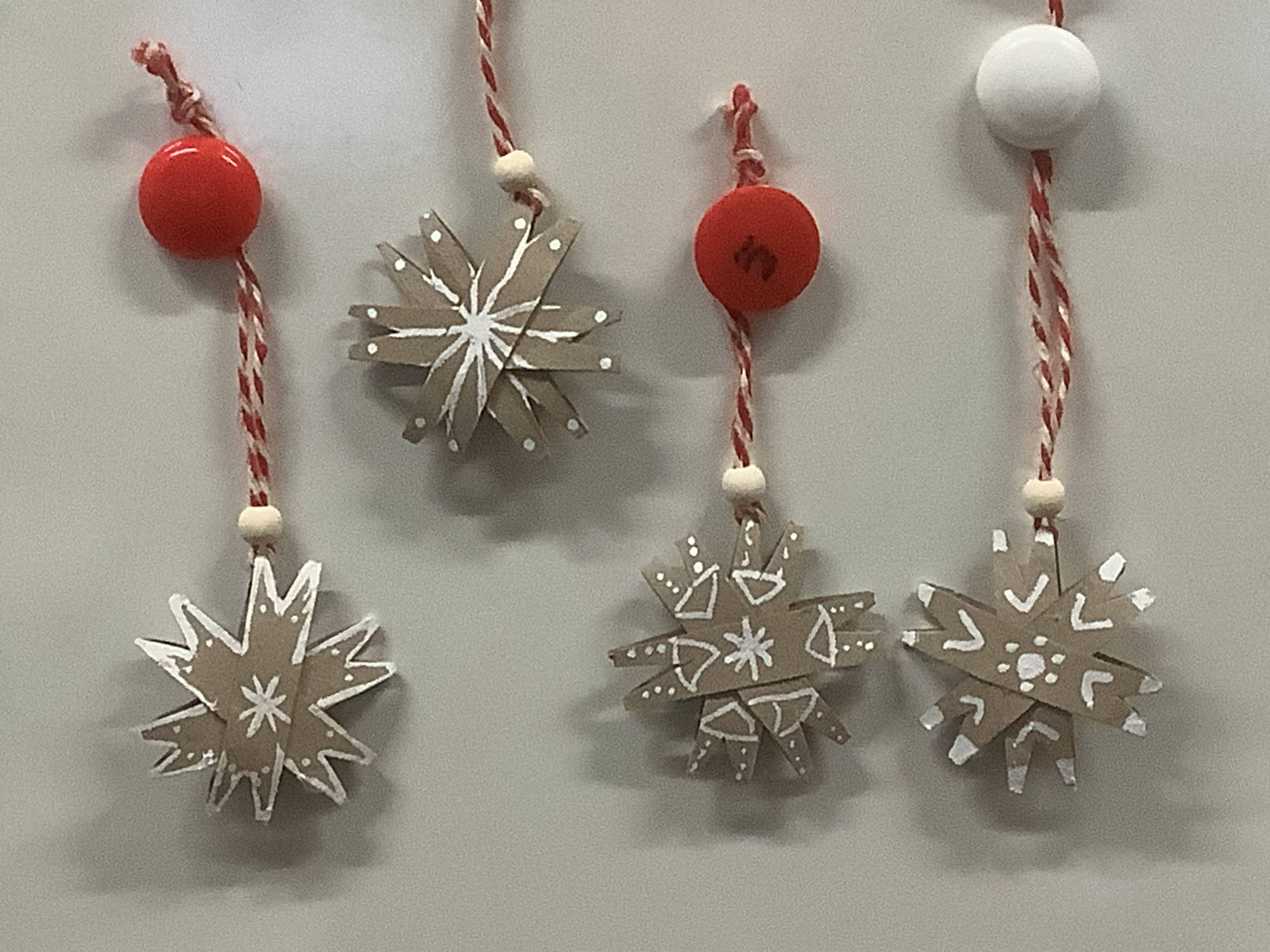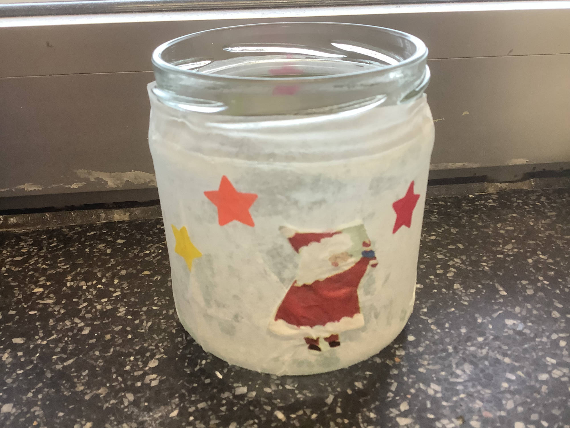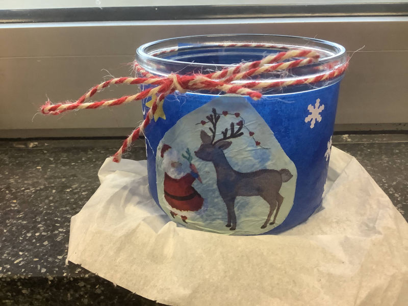 Weihnachtsschmuck aus Klopapierrollen und Joghurtaludeckeln, sowie Windlichter aus alten Gläsern...