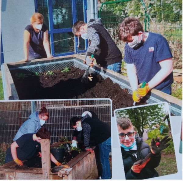 Unsere Kooperationsklasse, die Klasse 6 K, der Montessori-Schule hat im vergangenen Frühjahr und Sommer die von uns als Umweltschule im Jahr 2020 neu angelegten Hochbeete bewirtschaftet. Nachdem das Unkraut entfernt und die Hochbeete umgegraben und geharkt wurden, stand das Säen auf dem Programm. Die Schülerinnen und Schüler der Klasse 6 K pfanzten sowohl Erdbeeren, Kohlrabi, Paprika und Möhren als auch Radieschen und Kartoffeln an. Danach wurde alles gehegt und gepflegt, bis die reiche Ernte anstand. Die 11 kg Kartoffeln wurden anschließend im Matheunterricht sortiert, gezählt und gewogen und im Hauswirtschaftsunterricht zu verschiedenen Kartoffelgerichten verarbeitet.