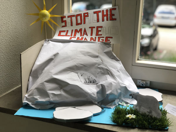 Einige Schulklassen des Jahrgangs 9 im Schuljahr 2019/2020 haben sich innerhalb eines Kunstprojektes mit verschiedenen nachhaltigen Themen auseinandergesetzt und ihre Inspirationen kunstvoll dargestellt. Die entstandenen Werke wurden im Schulgebäude ausgestellt.