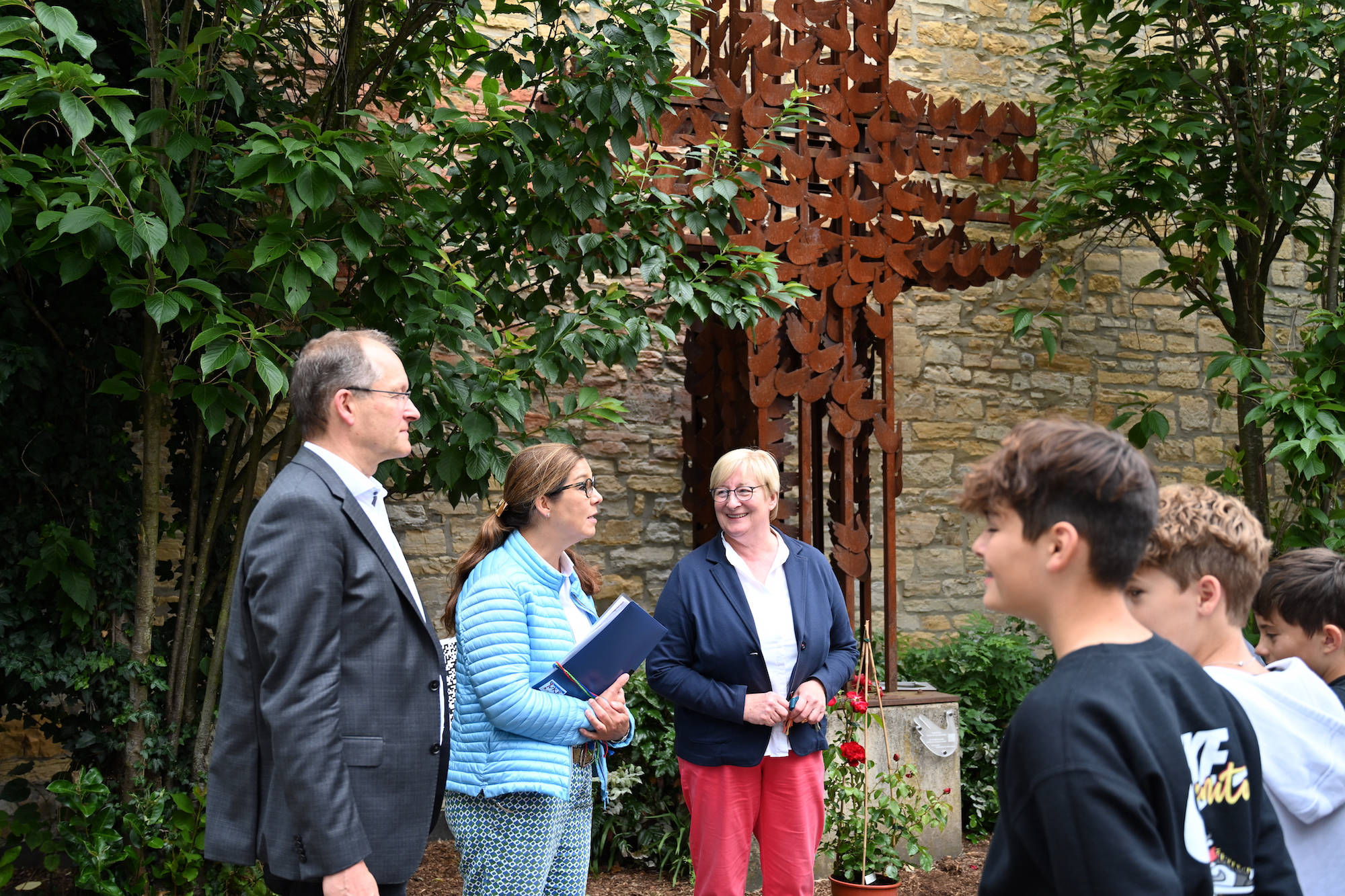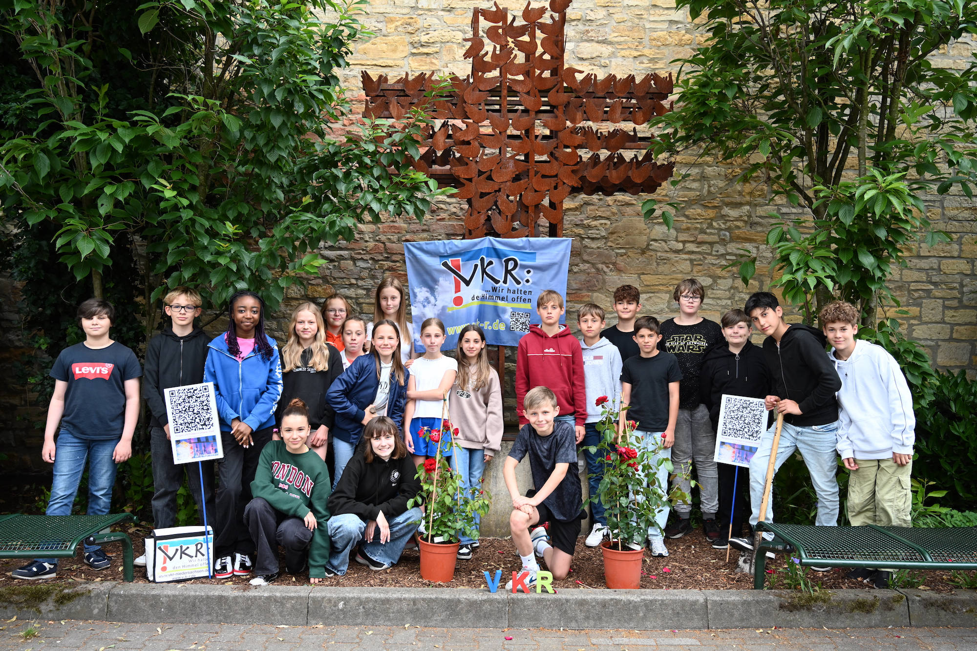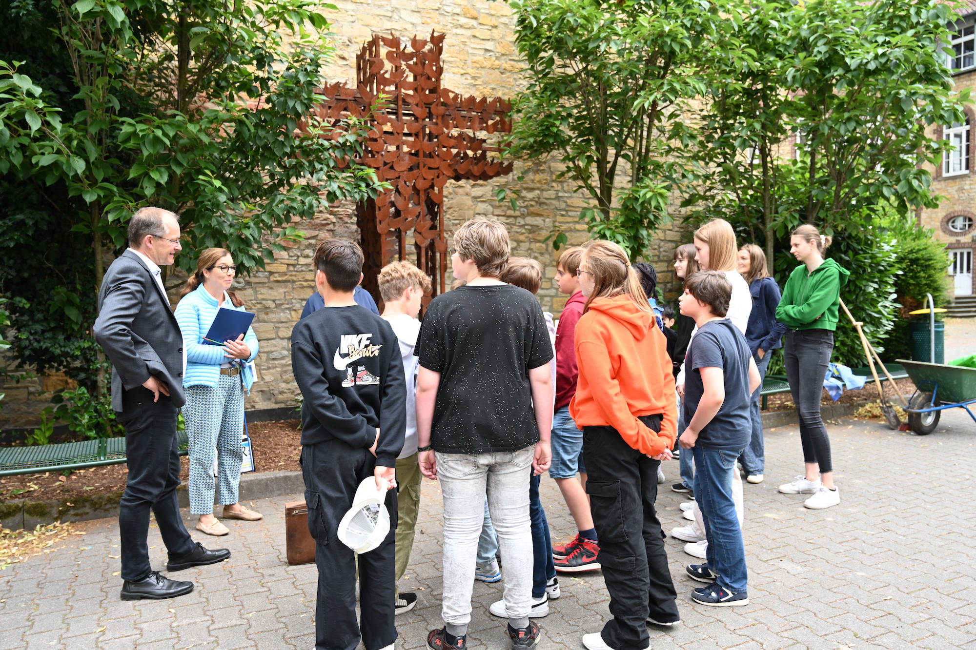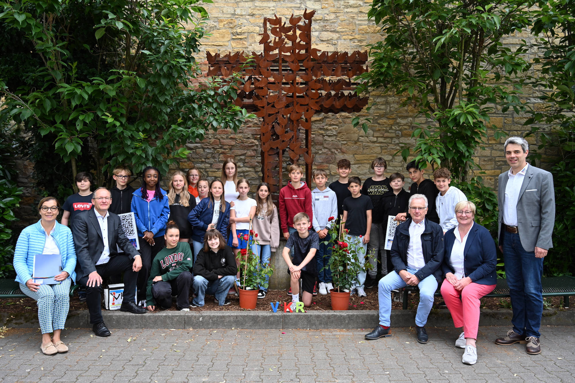 Mareike Klekamp (VKR), Ulrich Beckwermert (Domkapitular), Ludwig Berg (VKR), Sabine Müller (Schulleiterin), Ralf Menke (VKR) und die Schülerinnen und Schüler der Garten-AG der Domschule (von links nach rechts)
