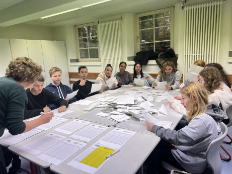 Vorbereitet wurden die wahlberechtigten Schüler*innen im Politikunterricht. Sie informierten sich über die Wahlgrundsätze und erfuhren, dass sie ihre fünf Stimmen auf mehrere Kandidat*innen verteilen oder alle an eine Person geben konnten. Außerdem beschäftigten sie sich mit allen Jungen und Mädchen, die zur Wahl standen, so dass sie eine begründete Entscheidung treffen konnten.