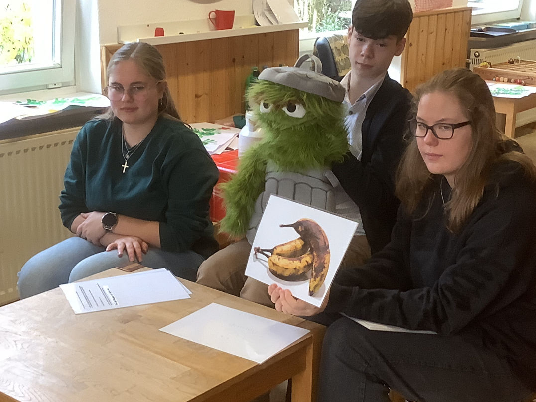 Am 24.11.2023 waren die Schüler und Schülerinnen der Oskar-AG wieder im Einsatz: Sie haben mit Kindergartenkindern ein kleines Projekt zum Thema Lebensmittelverschwendung durchgeführt. Mit der Handpuppe „Oskar aus der Tonne“ erfahren die Kinder, dass sehr viele Lebensmittel weggeworfen werden, die eigentlich noch verzehrfähig sind. So können braune Bananen noch zu einem leckeren Bananenmilchshake verarbeitet werden. Diesen stellen sie gemeinsam mit den Kinder her. Den Kindern hat der Bananenmilchshake sehr gut geschmeckt. Alle Kinder erhalten einen Kühlschrankmagneten mit Oskar als Motiv. So werden sie und ihre Eltern daran erinnert, vor dem Wegwerfen von Lebensmittels noch einmal genau darauf zu achten, ob die Lebensmittel nicht doch noch „zu gut für die Tonne“ sind.