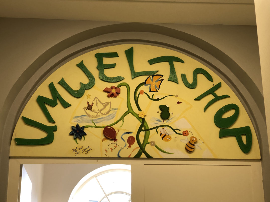 Somit haben wir jetzt fast 900 Schuhabdrücke und diese zu Schuljahresbeginn dekorativ am roten Sofa aufgehängt. Die Abdrücke laufen alle in eine Richtung: zur Welt, die wir in Form eines Wasserballs installiert haben.