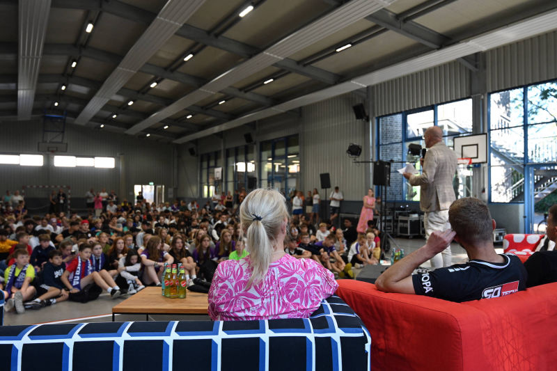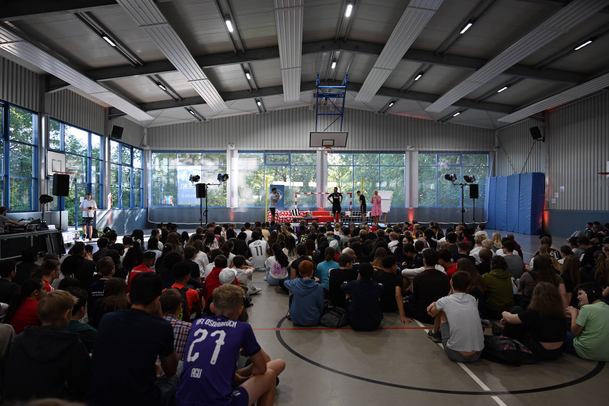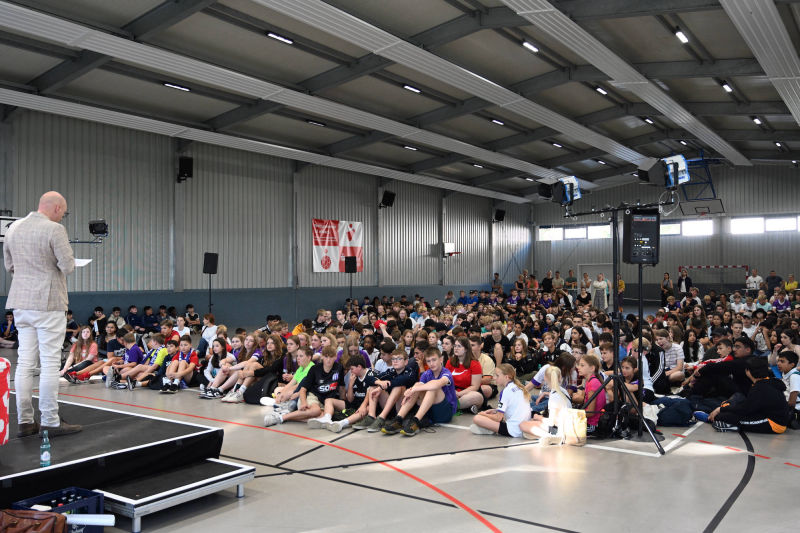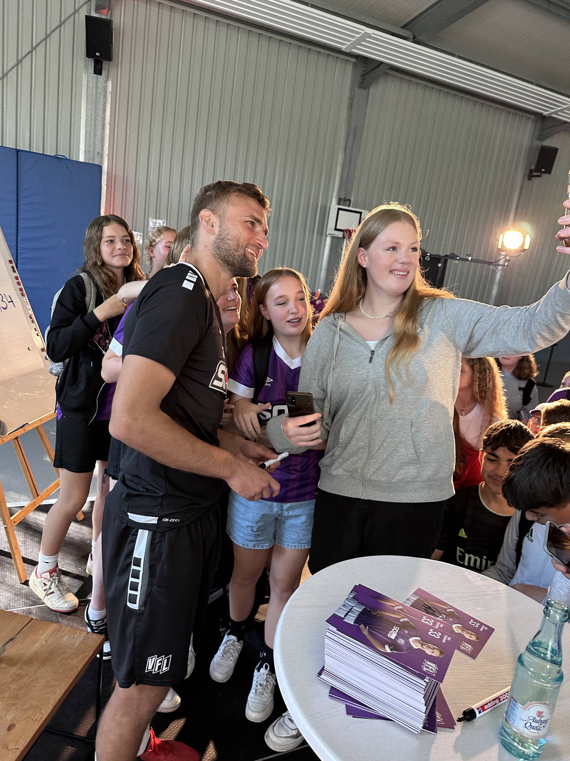 Zu der Friedensveranstaltung waren ca. 300 SuS der Möser Realschule, der Erich-Maria-Remarque-Schule, der IGS Eversburg und der Domschule. Alle Schulen sind im Netzwerk SORSMC. Die Podiumsdiskussion zum Thema „Diskriminierung und politische Einflüsse im Fußball“ war kurzweilig und im Anschluss gab es eine Autogrammstunde mit Timo Beermann, dem Kapitän des VFL. Herr Beermann hat sich sehr viel Zeit für die SuS genommen und Schals, Caps, Karten, Handys etc. signiert. Natürlich wurde auch Fotowünsche erfüllt. Das war toll für alle Fans.