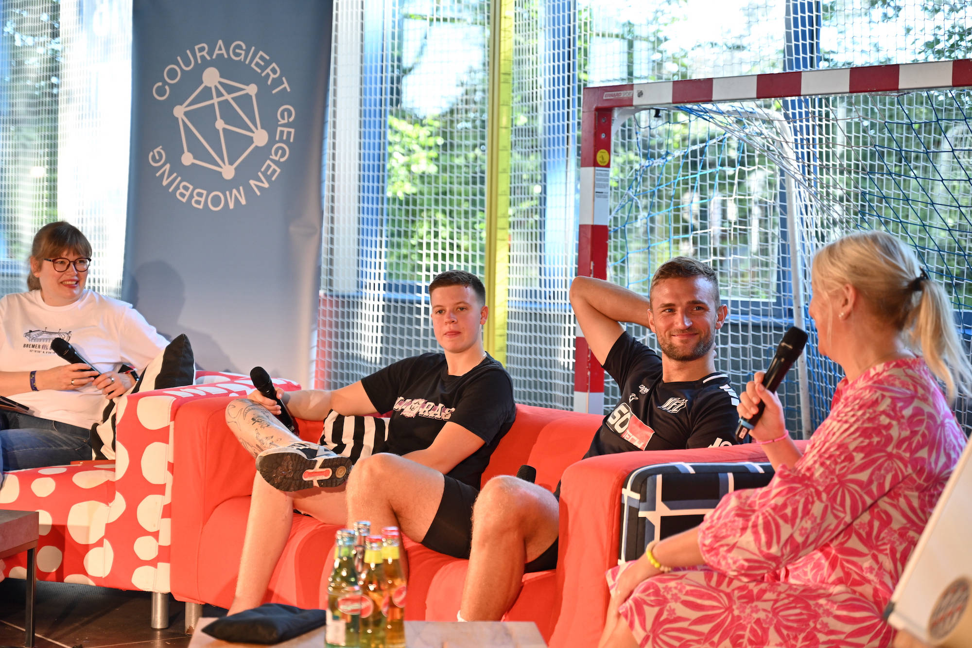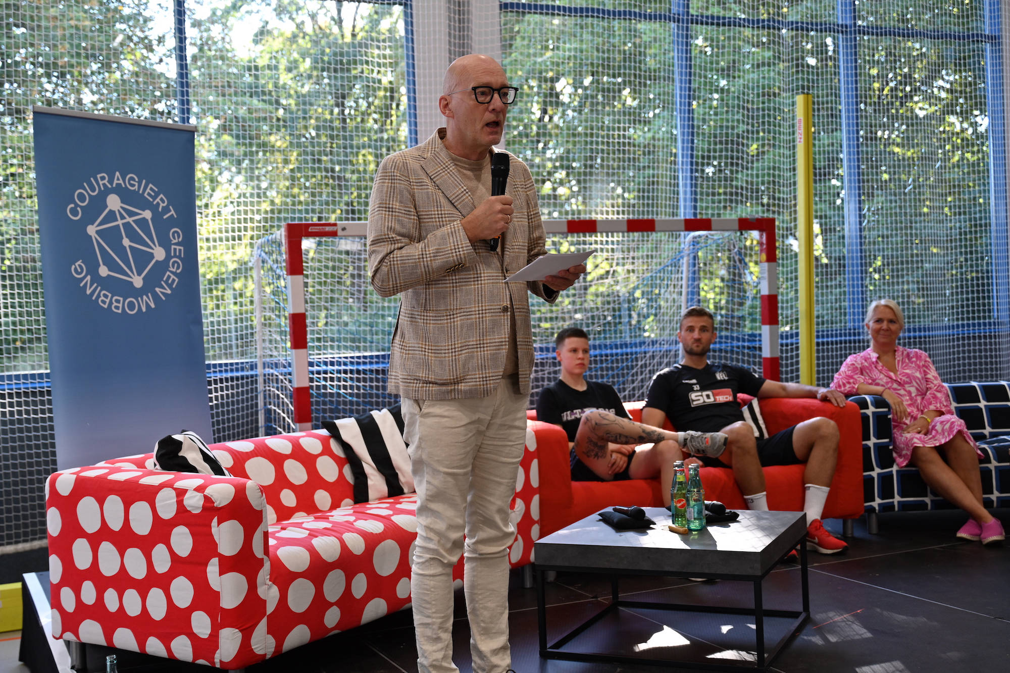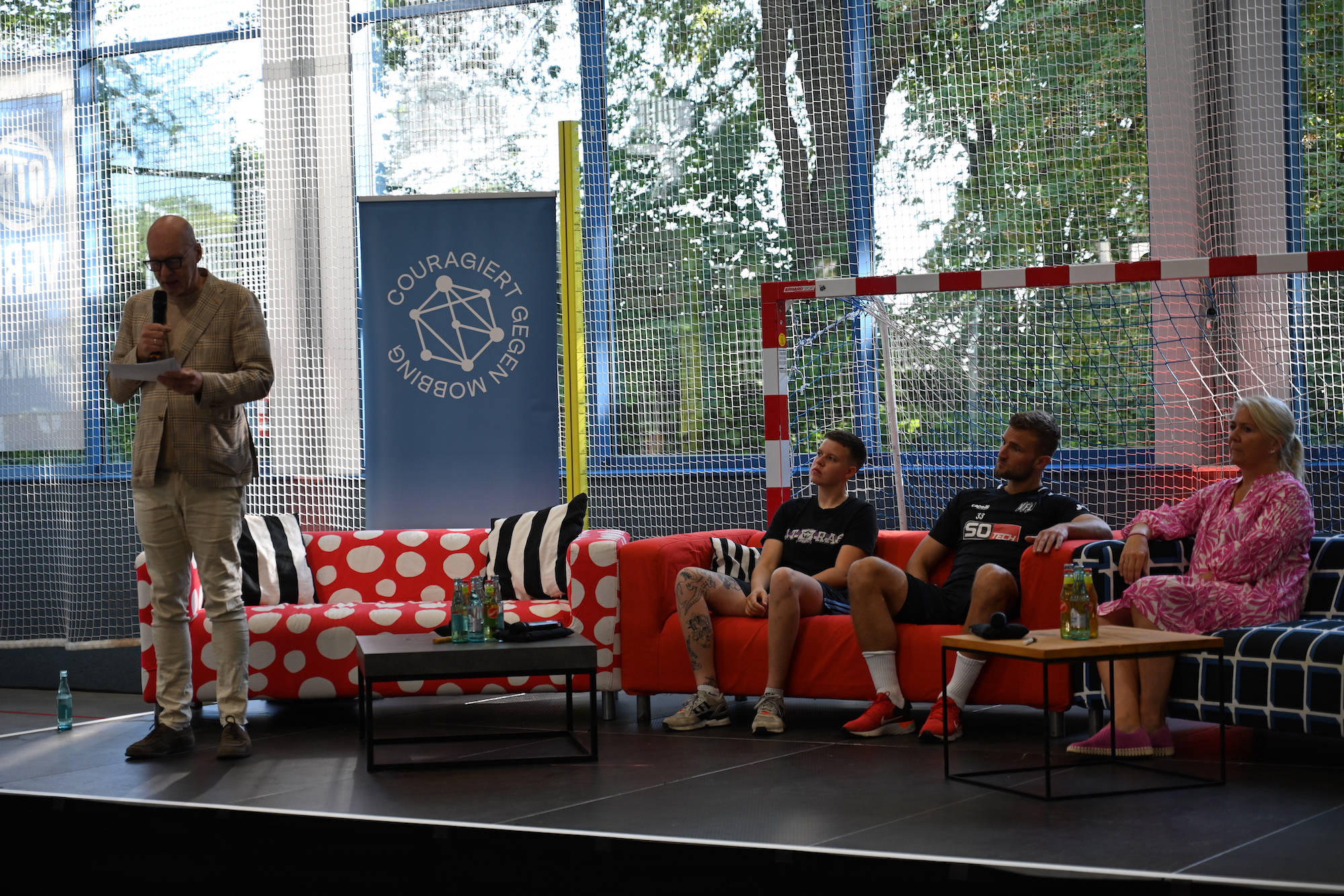 Zu der Friedensveranstaltung waren ca. 300 SuS der Möser Realschule, der Erich-Maria-Remarque-Schule, der IGS Eversburg und der Domschule. Alle Schulen sind im Netzwerk SORSMC. Die Podiumsdiskussion zum Thema „Diskriminierung und politische Einflüsse im Fußball“ war kurzweilig und im Anschluss gab es eine Autogrammstunde mit Timo Beermann, dem Kapitän des VFL. Herr Beermann hat sich sehr viel Zeit für die SuS genommen und Schals, Caps, Karten, Handys etc. signiert. Natürlich wurde auch Fotowünsche erfüllt. Das war toll für alle Fans.