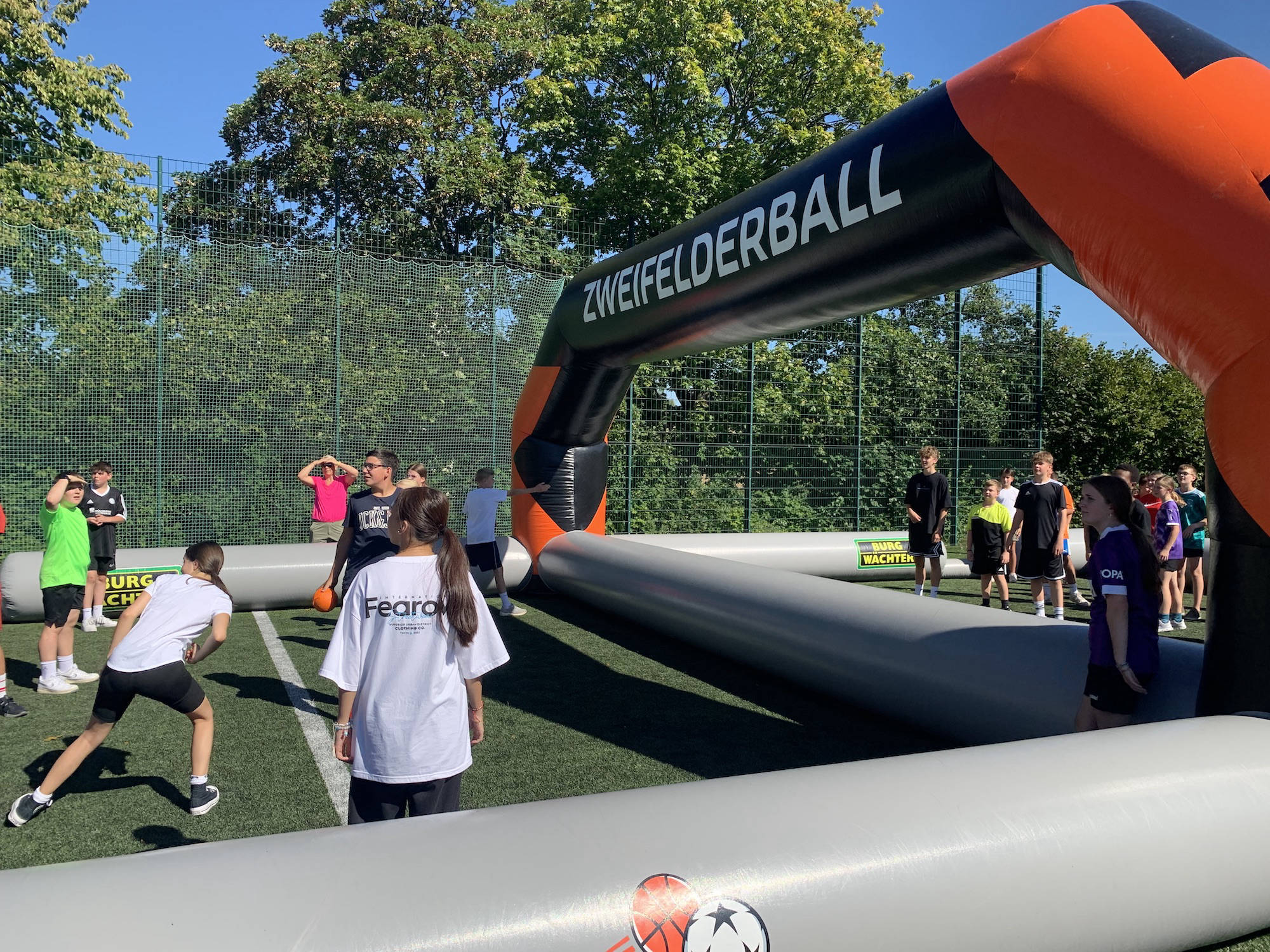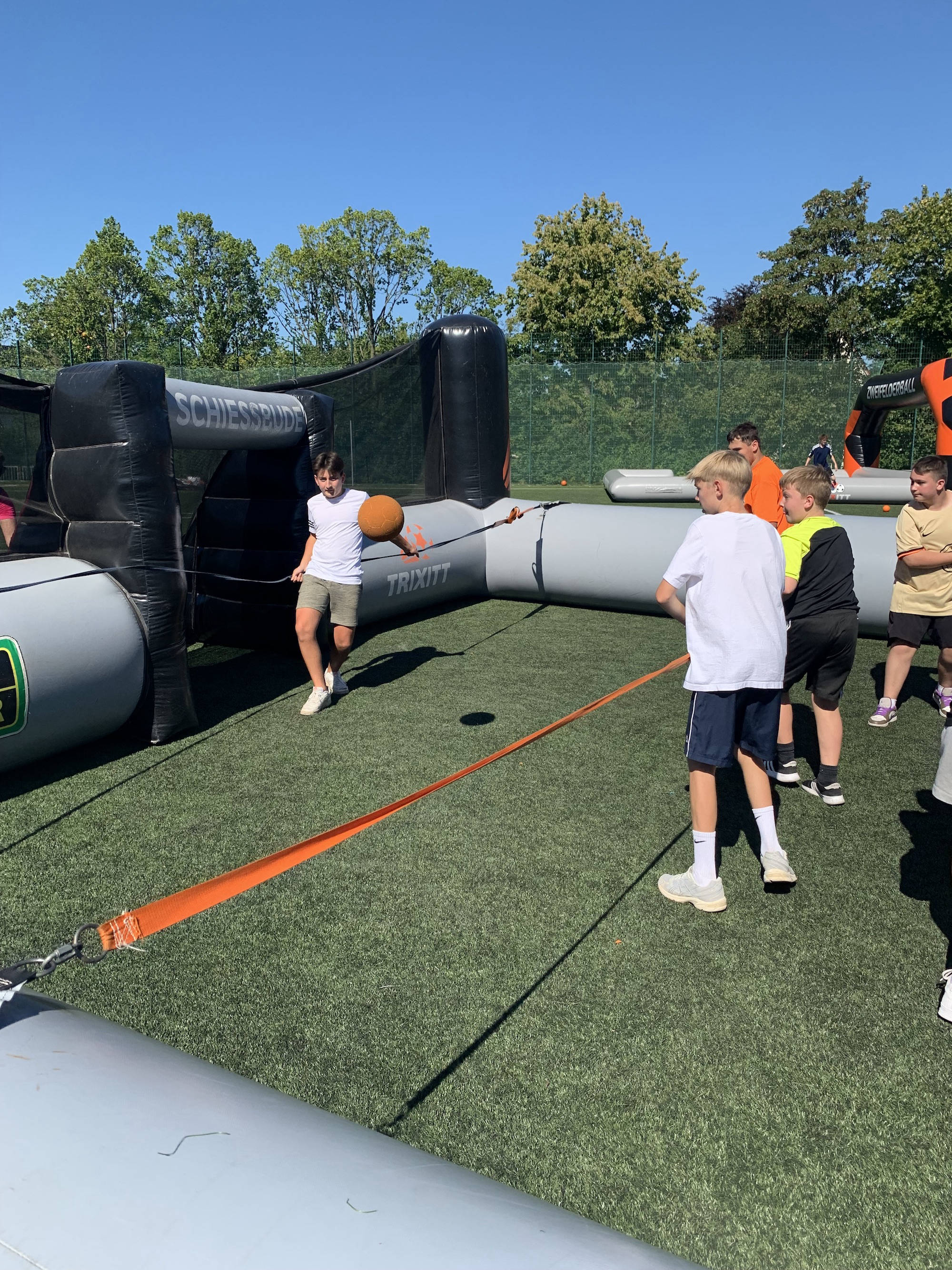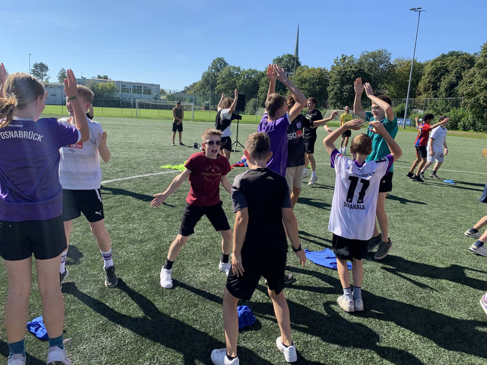 Dann wartete ein Stationsbetrieb der TRIXITT GmbH auf alle SuS. Das war eine große Herausforderung aufgrund der Temperaturen auf dem Platz. Es gab genug kalte Getränke für alle. Die SuS hatten viel Spaß und alle drei für Fairness ausgezeichneten Gruppen kamen von der Domschule. Ein unvergesslicher Tag wurde es dann noch für die großen VFL-Fans, da die Mannschaft nebenan trainierte und im Anschluss geduldig Autogramme gab- sogar auf Fußballschuhe! Verschwitzt und happy fuhren alle wieder nach Hause.