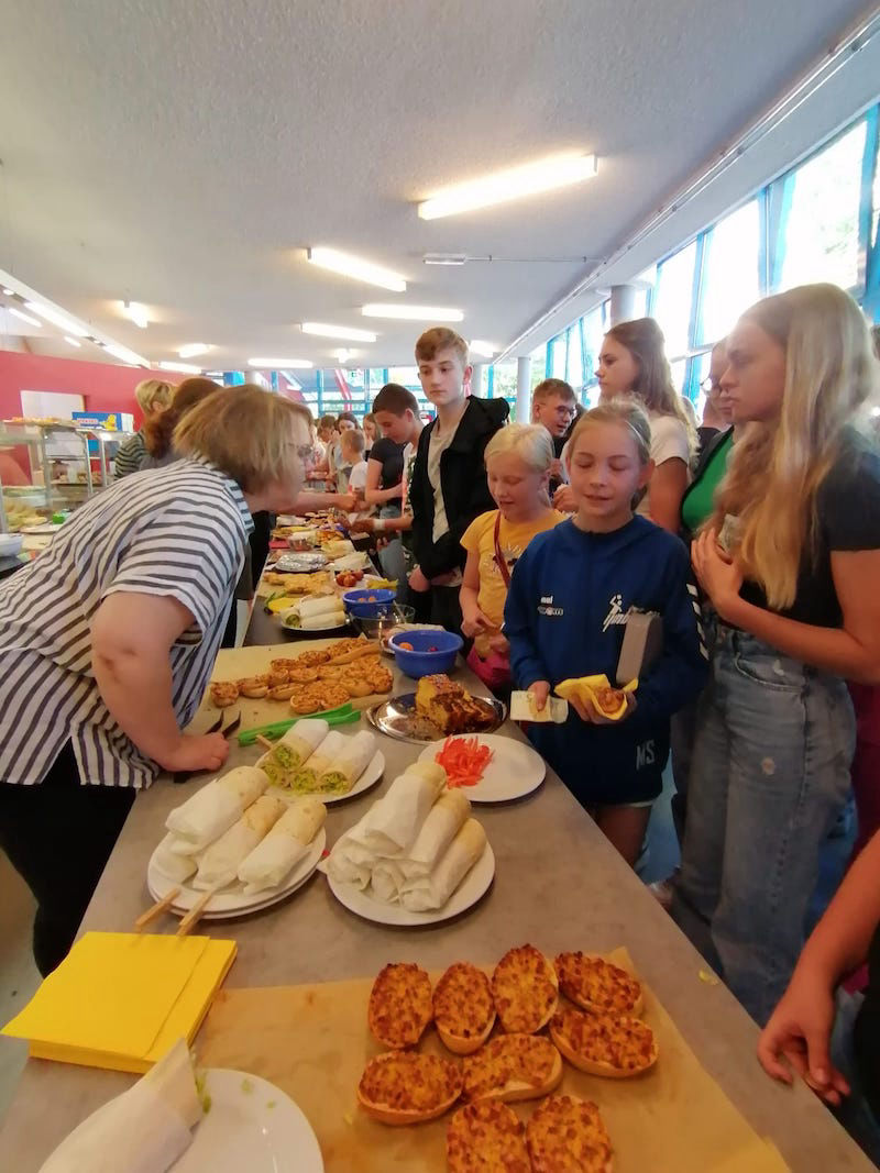 Dazu treffen wir uns 14-tägig mittwochs ab 7:45 Uhr in der Schulküche/Cafeteria für etwa 2,5 Std. Darüber hinaus freuen wir uns über Beiträge (herzhaftes Kleingebäck oder Handkuchen), die zuhause hergestellt und über die Kinder mitgebracht werden.