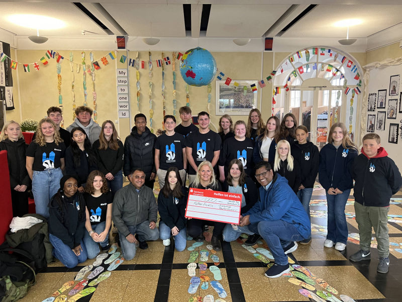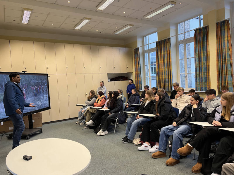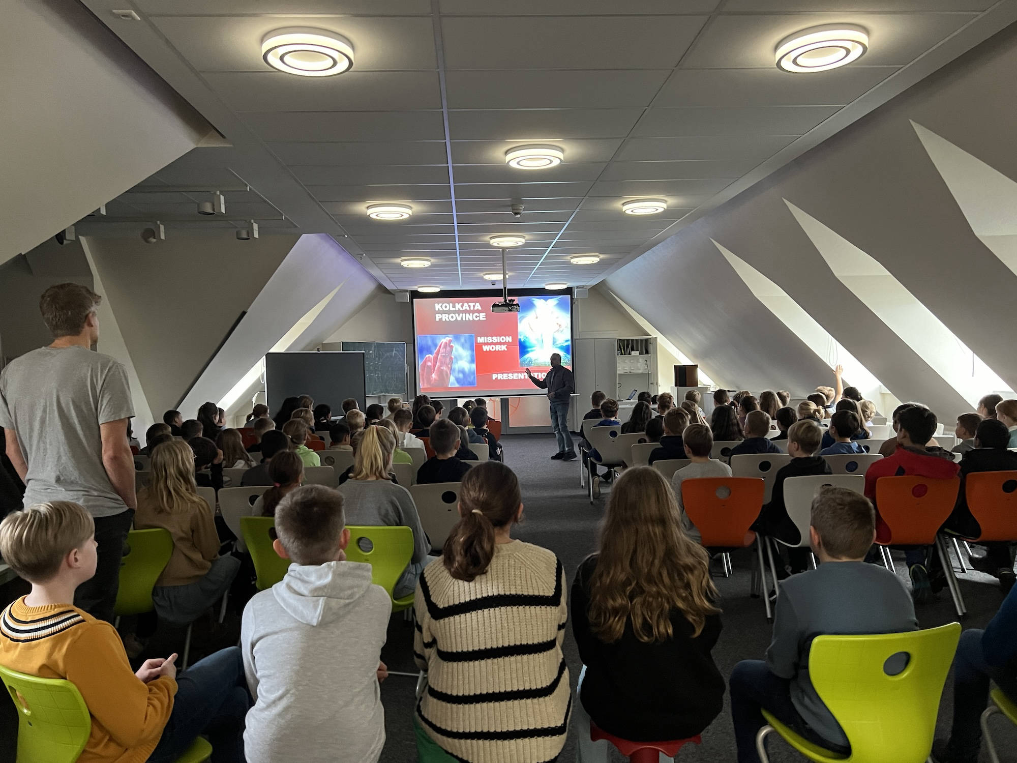 Pater Attley und Pater Kishore stellten sich und ihre Gemeinschaft sowie die zahlreichen Projekte anhand vieler Fotos vor. Nacheinander und in Gruppen von 2-3 Klassen konnten alle Schüler an den Vorträgen teilnehmen. So konnten sie aus erster Hand Einblicke in die verschiedenen Projekte erhalten, die wir als Domschulgemeinschaft durch verschiedenste Aktionen im Schuljahresverlauf wie Sponsorenlauf, Sternsingeraktion, Erntedankmarkt finanziell unterstützen. So konnte z.B. eine weitere Spende über 1000,00 Euro am Dienstag von der SV überreicht werden.