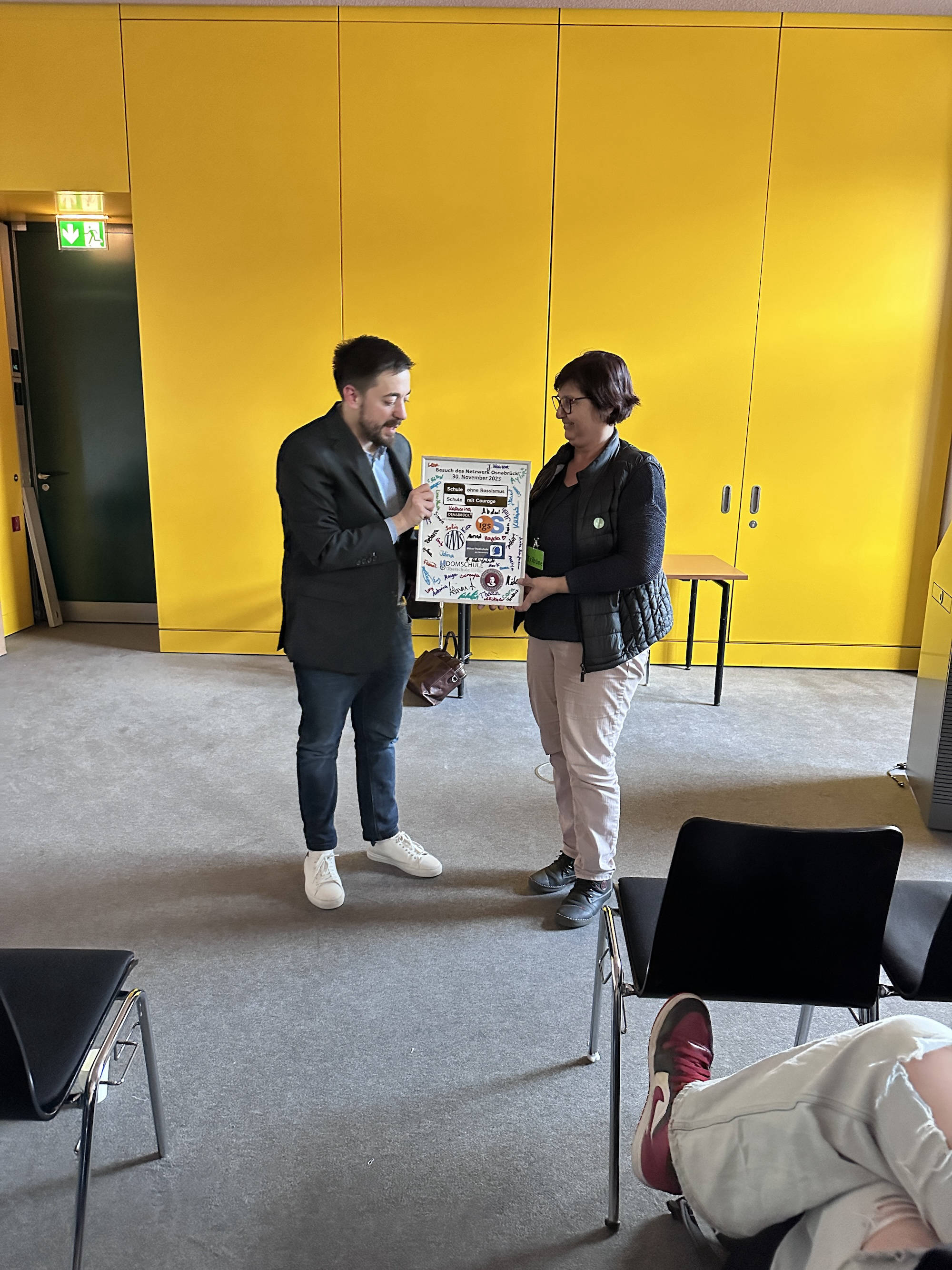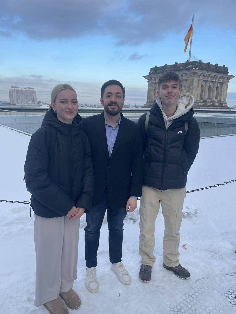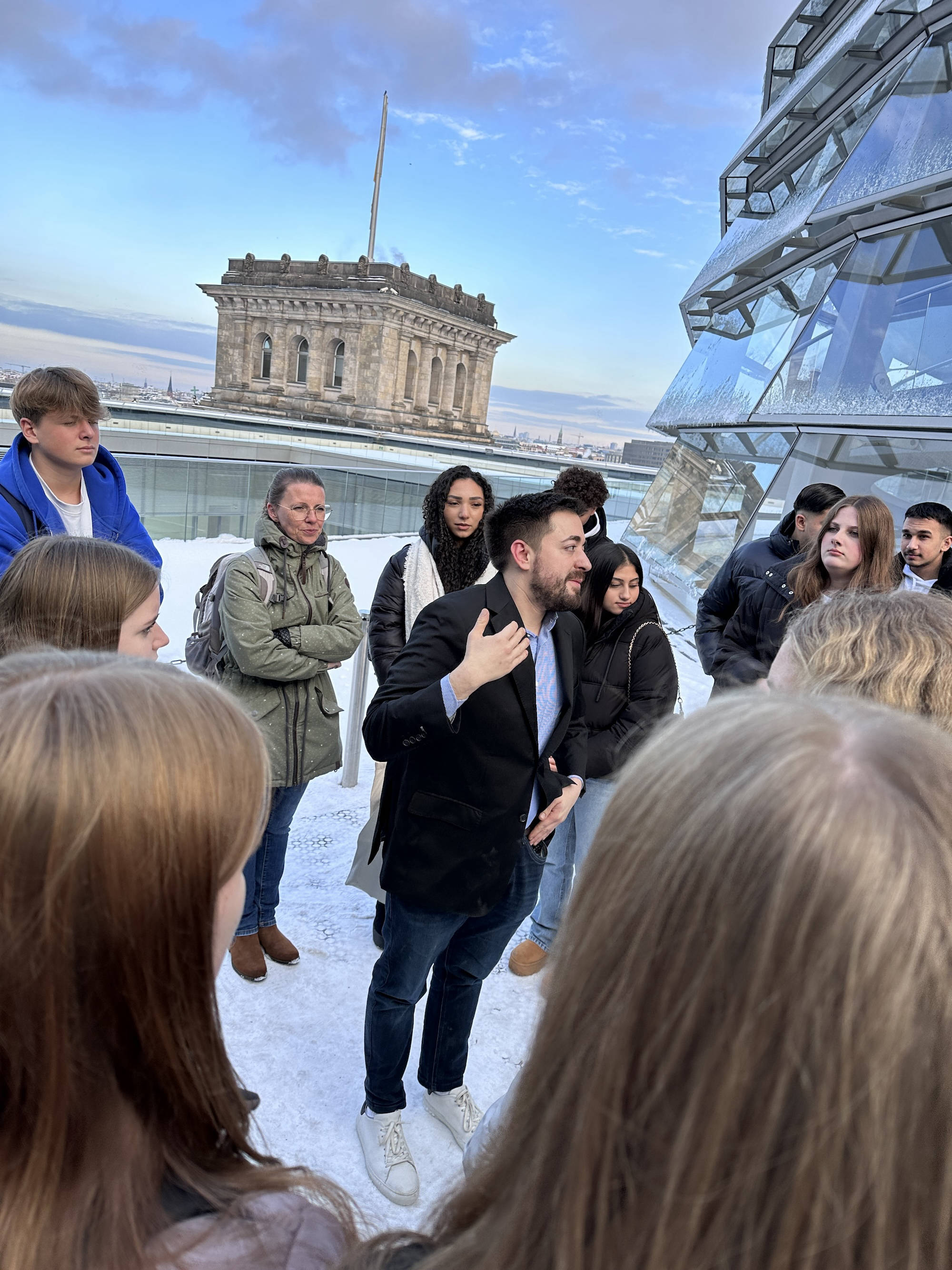 Ich habe den Tag in Berlin als seinen spannenden und schönen Tag erlebt. Wir waren mit 3 weiteren Schulen aus dem Netzwerk Schule ohne Rassismus Schule mit Courage dort. Als wir nach einer turbulenten Zugfahrt (über 5 Stunden!!!!) gegen 11:30 Uhr in Berlin angekommen waren, haben wir uns beeilt, so dass wir noch pünktlich zur Plenarsitzung kommen konnten. Es ging in der hitzigen Debatte gerade um die Staatsbürgerschaft. Wer sie wann bekommen soll oder eben nicht. Wir waren überrascht, wie viele Zwischenrufe es bei den Reden gegeben hat. Gerade Philip Amthor bekam viel Gegenwind bei seiner Rede. Leider hatten wir nur noch 30 Minuten, um zuzuhören. Nach der Sitzung haben wir Manuel Gava (ein Bundestagsabgeordneter aus Osnabrück) getroffen. Er hat uns sehr anschaulich das Leben und Arbeiten im Bundestag nähergebracht. Das war sehr spannend, denn er sprach von einem nerven- und zeitraubenden Job, den man eigentlich nur 10 Jahre durchhalten kann. Dann will er zurück in seinen eigentlichen Beruf als Eisverkäufer.