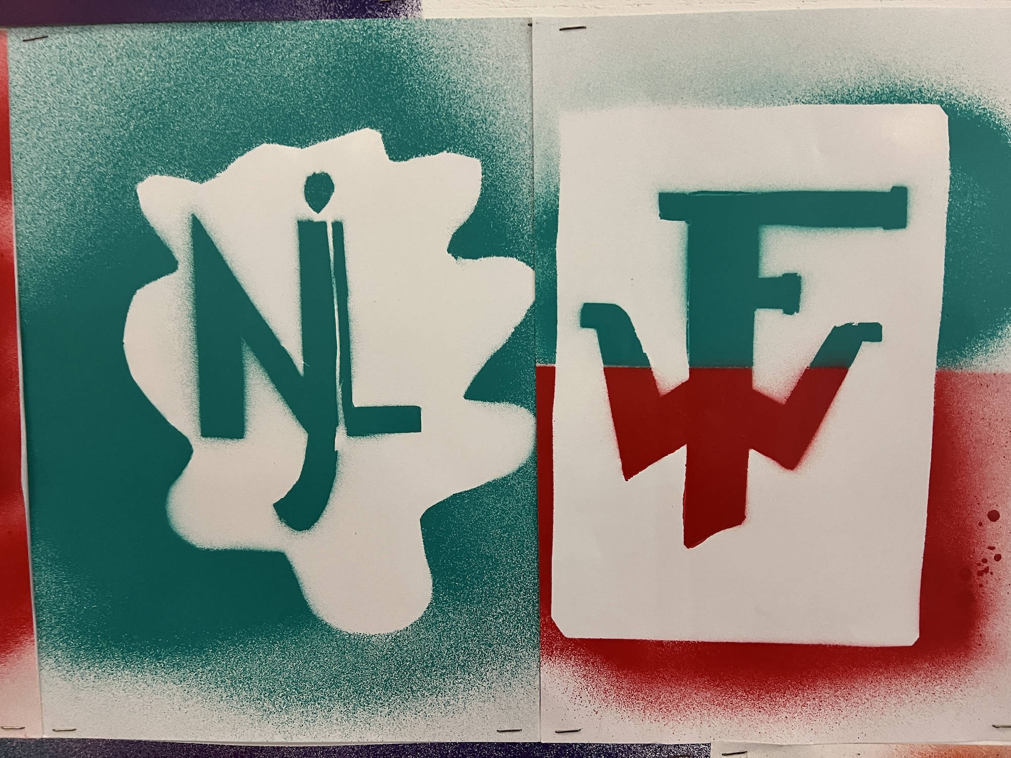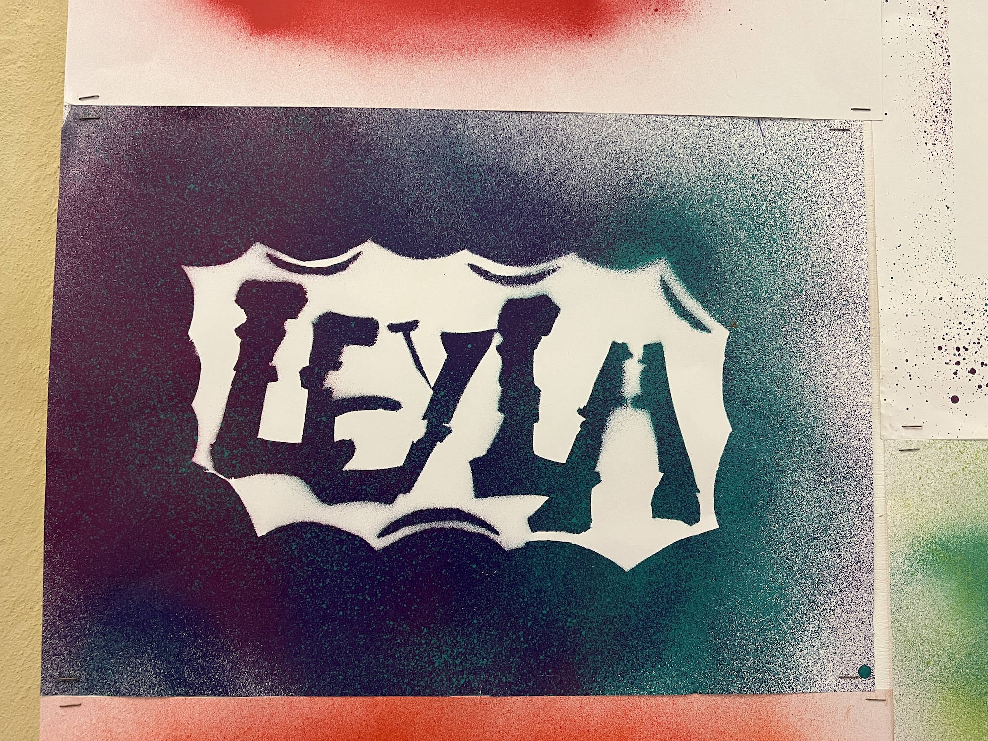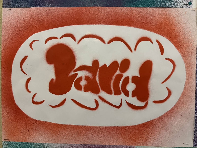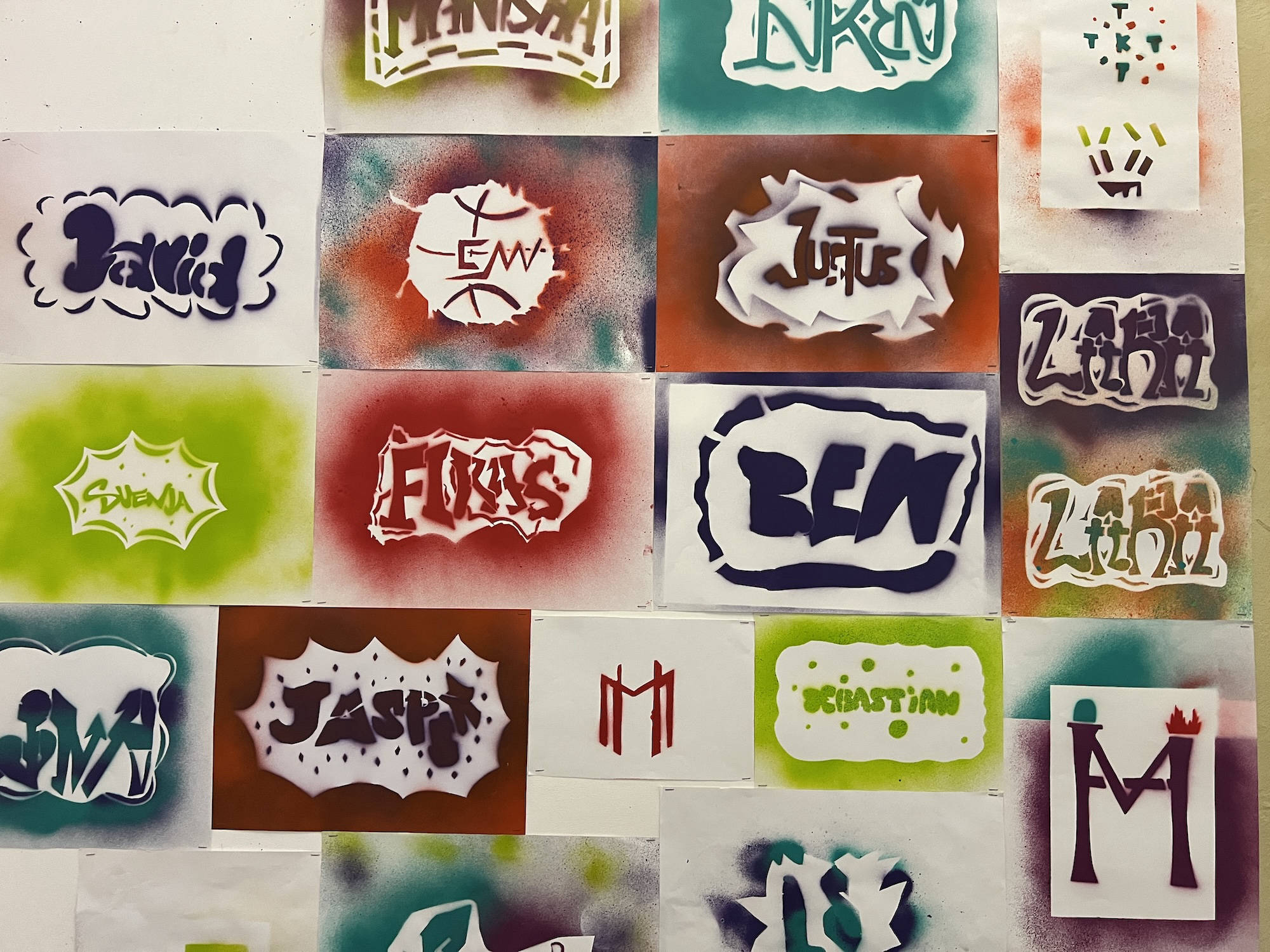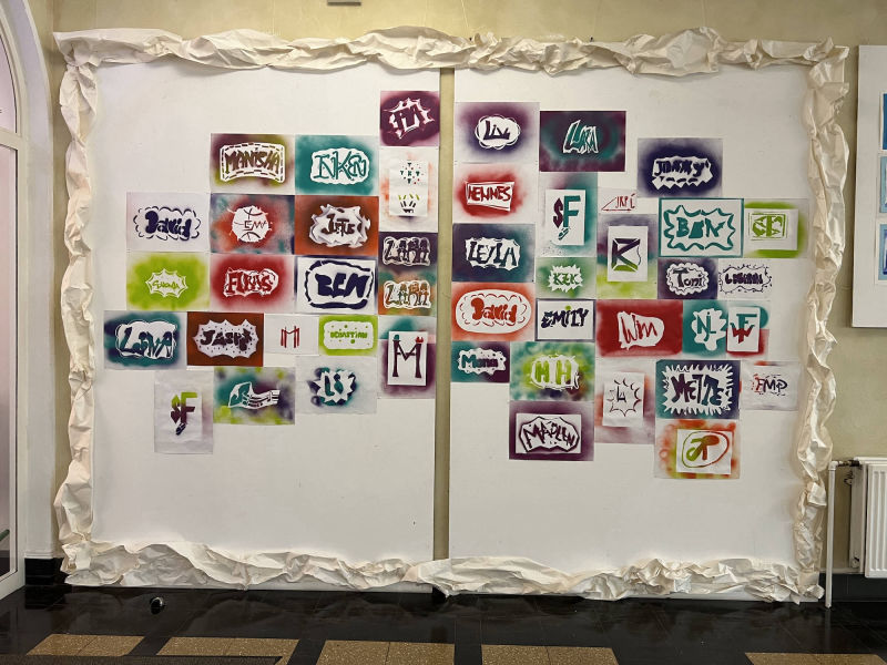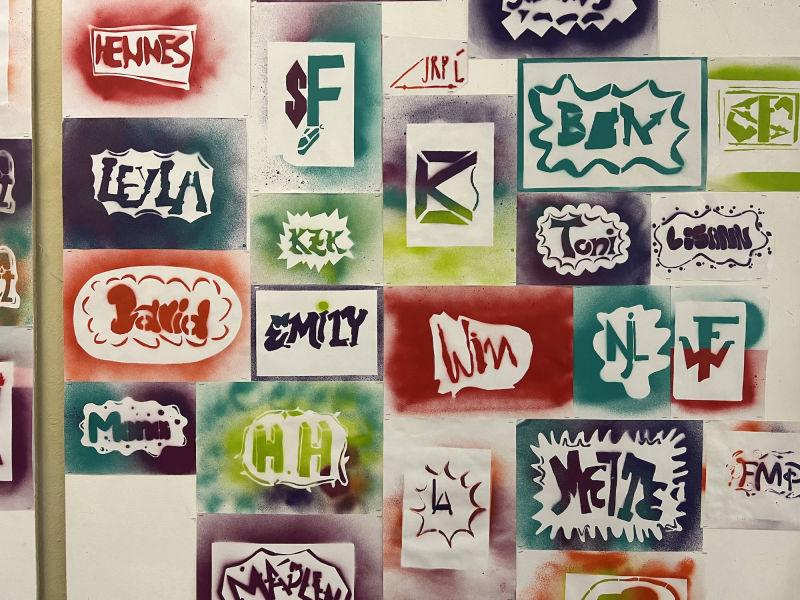 Unter der Leitung von Katharina Mitra wurden zunächst Skizzen, anschließend eine Schablone mit viel Liebe zum Detail entworfen. Die 10F sprüht ihren Vornamen in Form von Signaturen (Tags) und Motiven und ordnet Buchstabengruppen (Styles) zueinander. Die 7B gestaltet ihr eigenes Logo mit ihren Initialen und integriert darin Hobbies und Interessen.