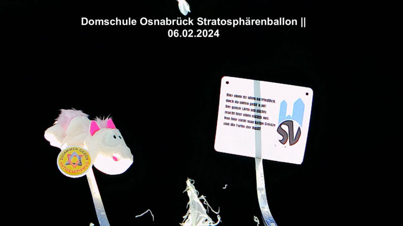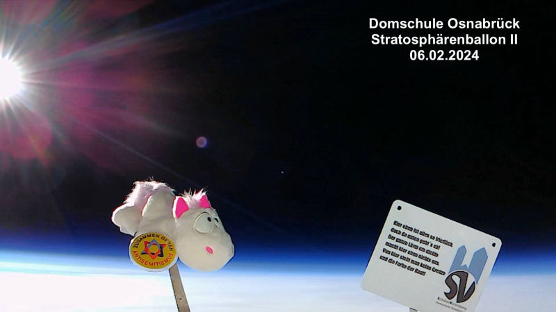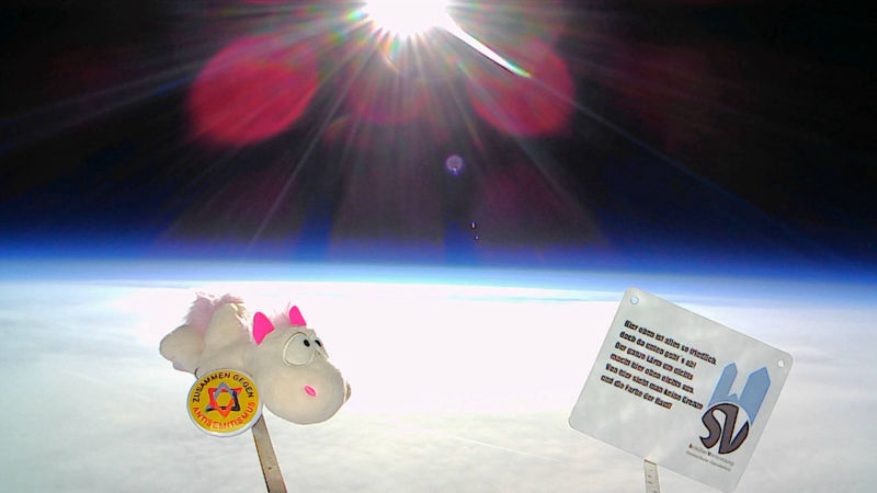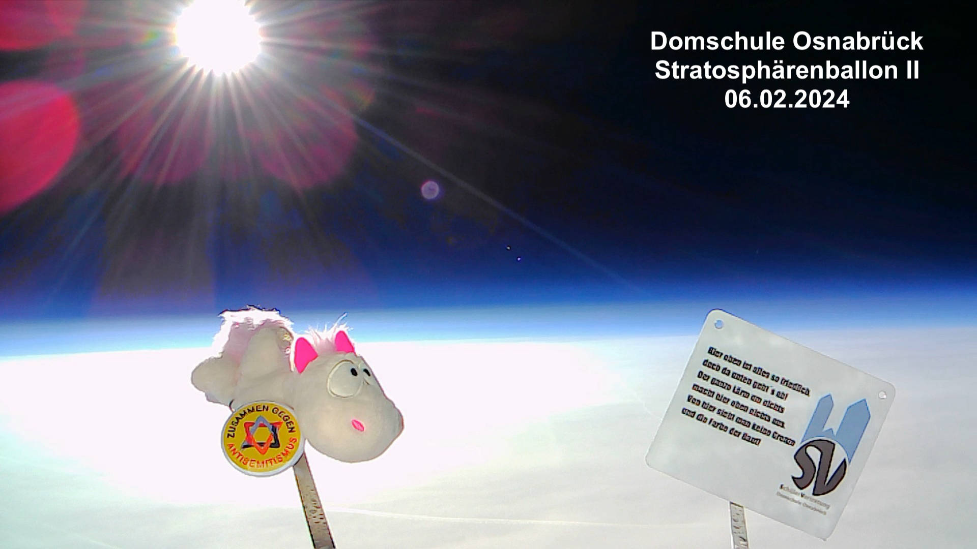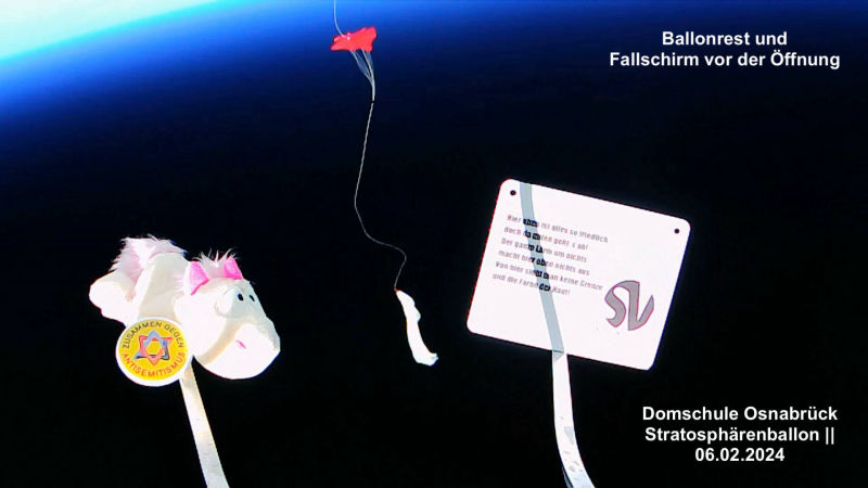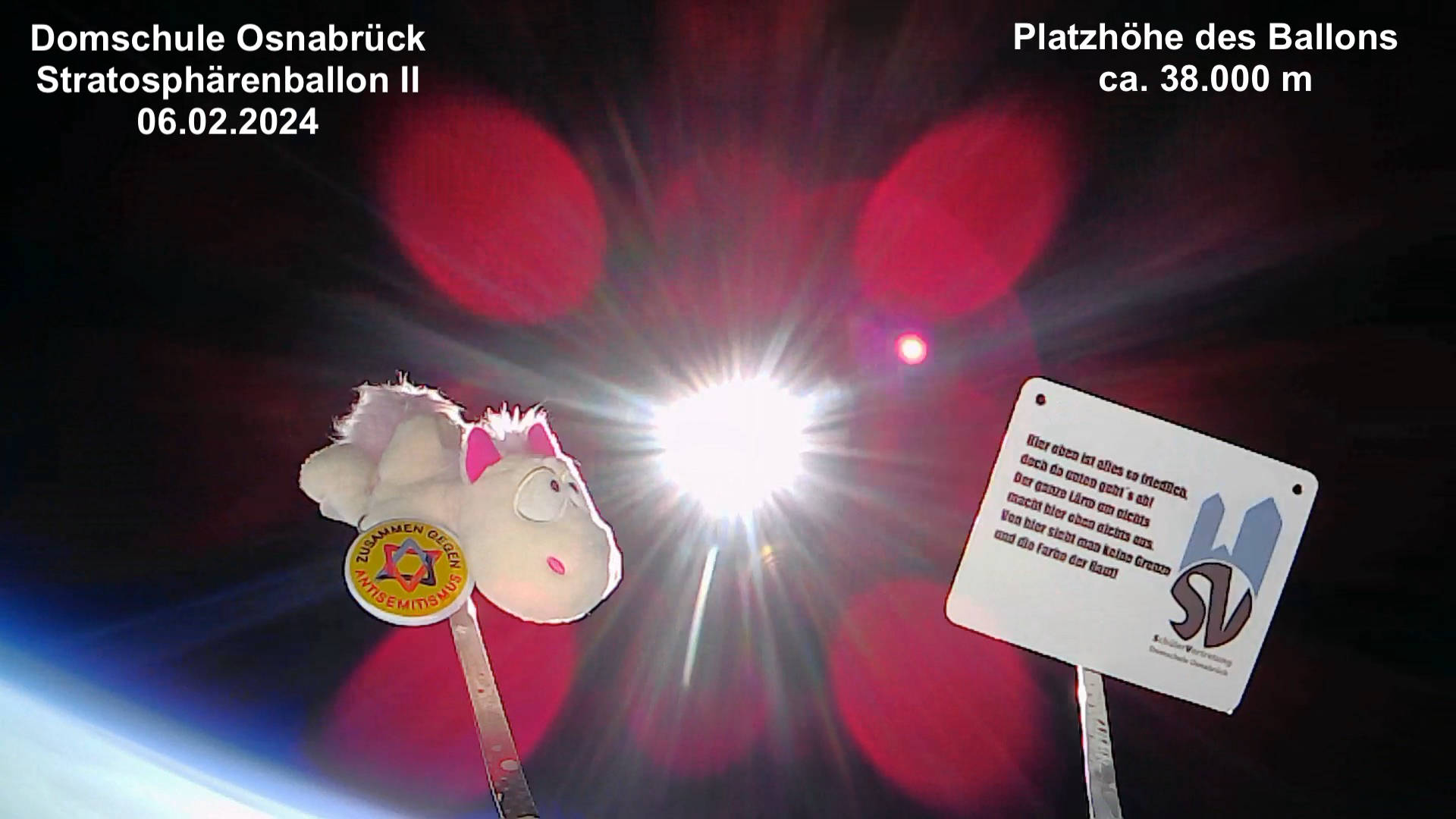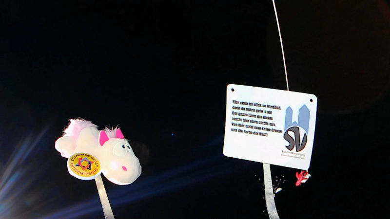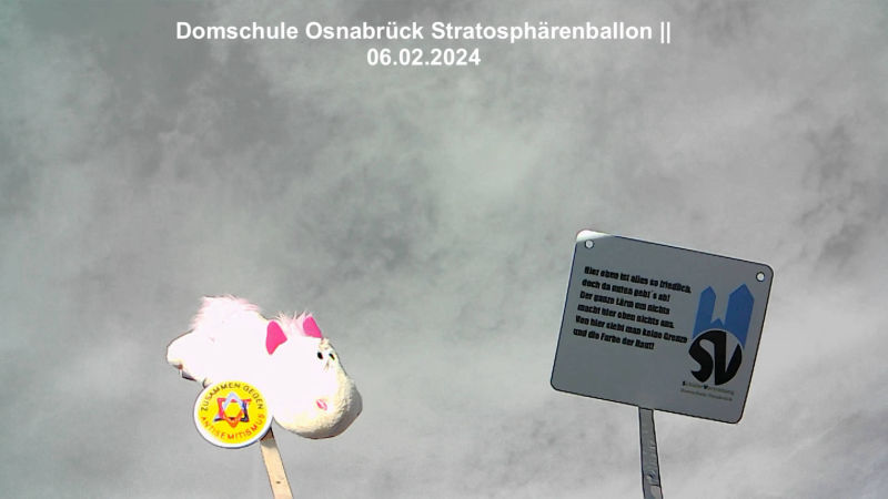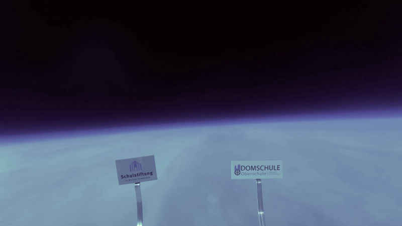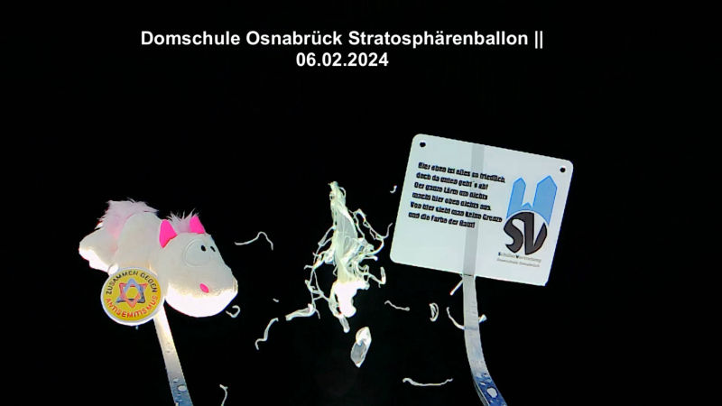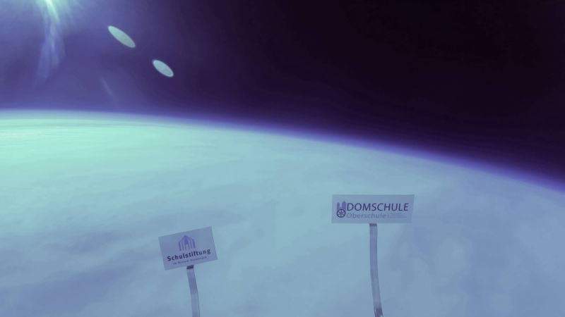 Vier nach oben, unten und seitlich(2) ausgerichtete Kameras machten während des Aufstiegs und des Niedergangs insgesamt ca. 7Stunden lang Film und Bildaufnahmen von hervorragender Qualität. Der Aufstieg durch verschiedene Wolkenschichten, das enorme Ausdehnen des Ballons mit einer ca. Vervierundsechzigfachung des Volumens und die Veränderung des Sonnenstrahlenspektrums ab dem oberen Ozonschichtbereich sind klar zu sehen. Die Aufnahmen zeigen die Erdkrümmung, die Lufthülle "unseres" Planeten im Schnitt und das "schwarze Nichts" des Alls. Auf das Platzen des Ballons um 12:08Uhr in der Maximalhöhe folgen Bilder des rasanten Niedergangs der Styroporbox mit den Kameras und der Messelektronik bis zum Eintauchen in eine Baumkrone (51°40´8.6880N 12°21´11.5920E) in einem kleinen Waldstück nordwestlich des Bahnhofsgebäudes von Muldenstein, Landkreis Anhalt-Bitterfeld in Sachsen-Anhalt. Die Ortung mittels GPS-Tracker funktionierte problemlos.
